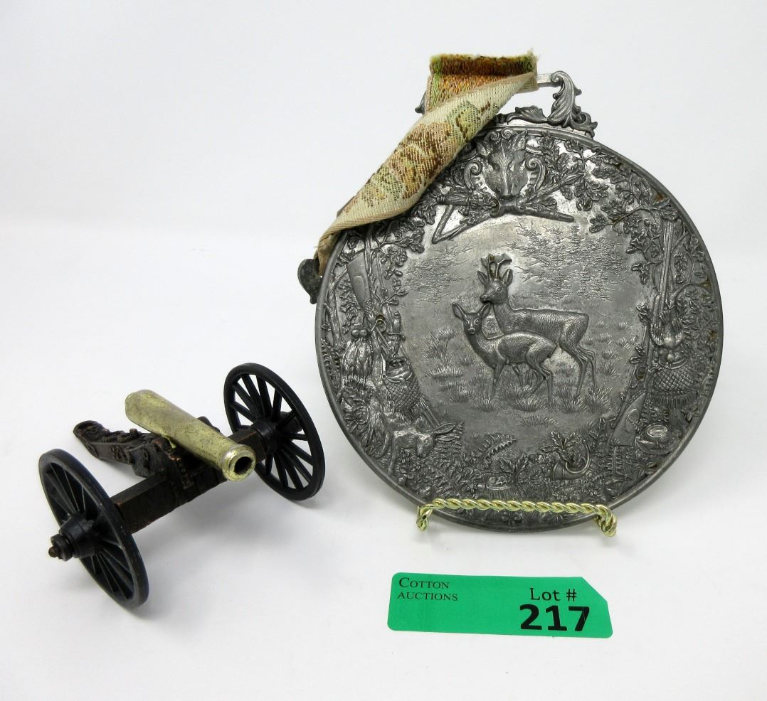 Wall plaque has a very detailed hunting motif and is 6" diameter. Cannon model is metal.