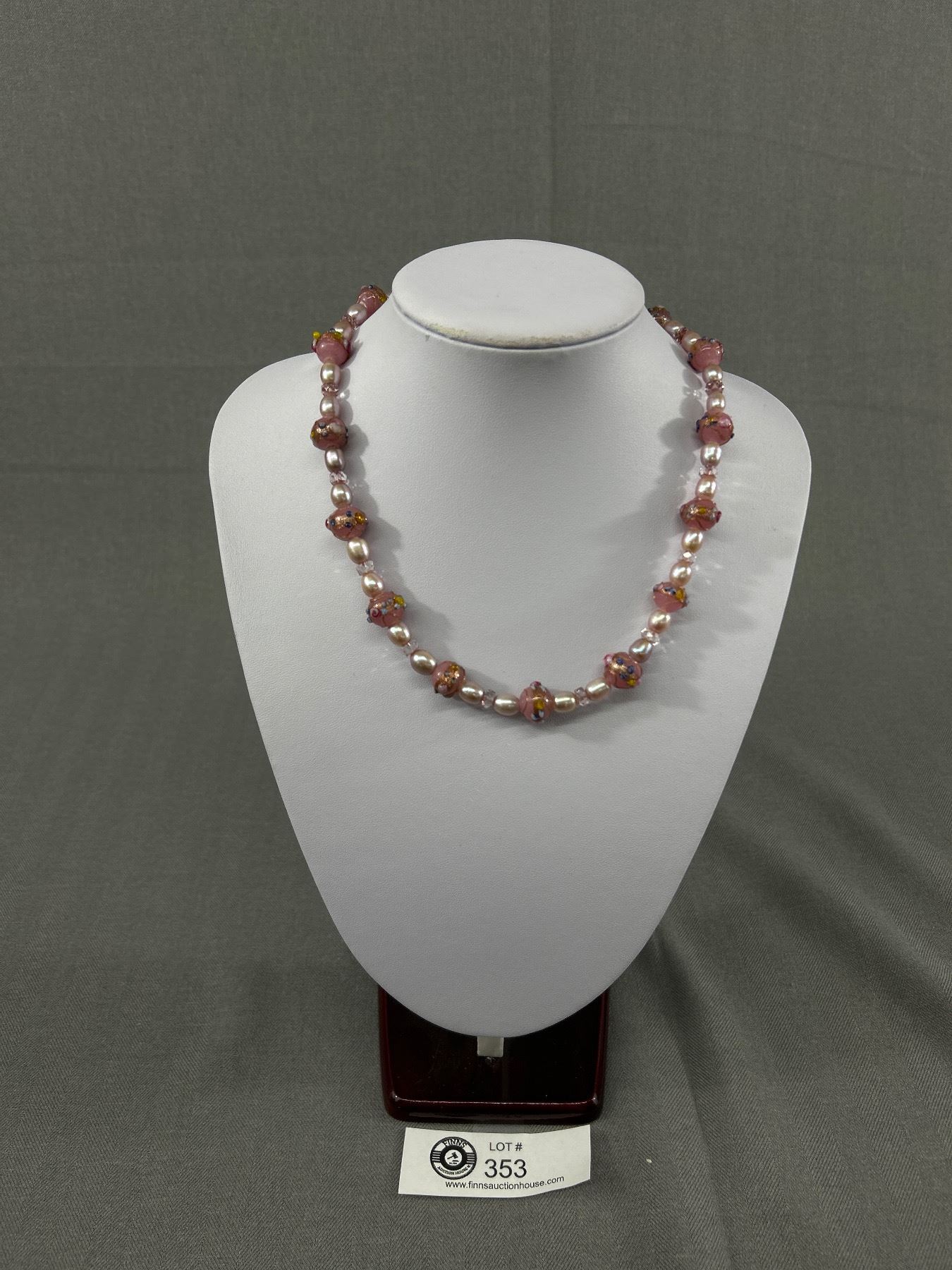 Vintage Pink Birthday Cake Raised Embossed Glass Beads & Genuine Pearl Necklace.