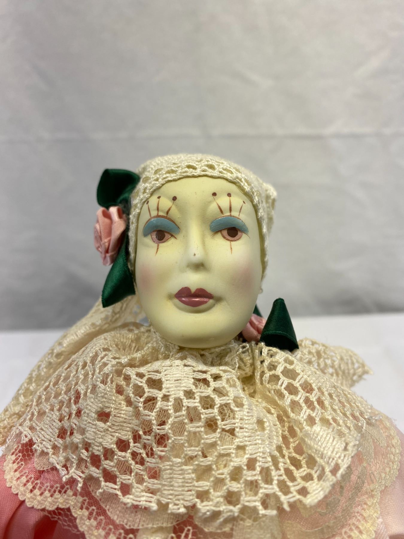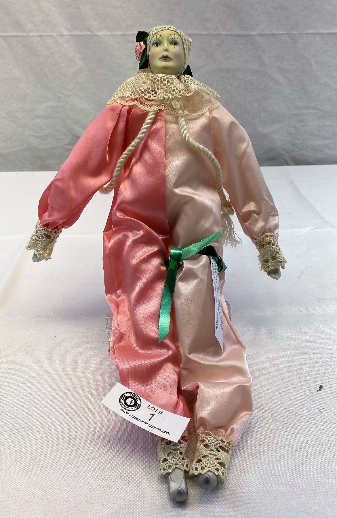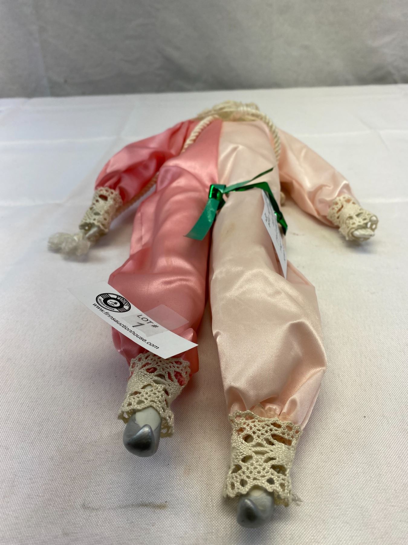 Vintage Porcelain Harlequin Doll With A Beautiful Hand painted Face, Excellent Condition, 18" L