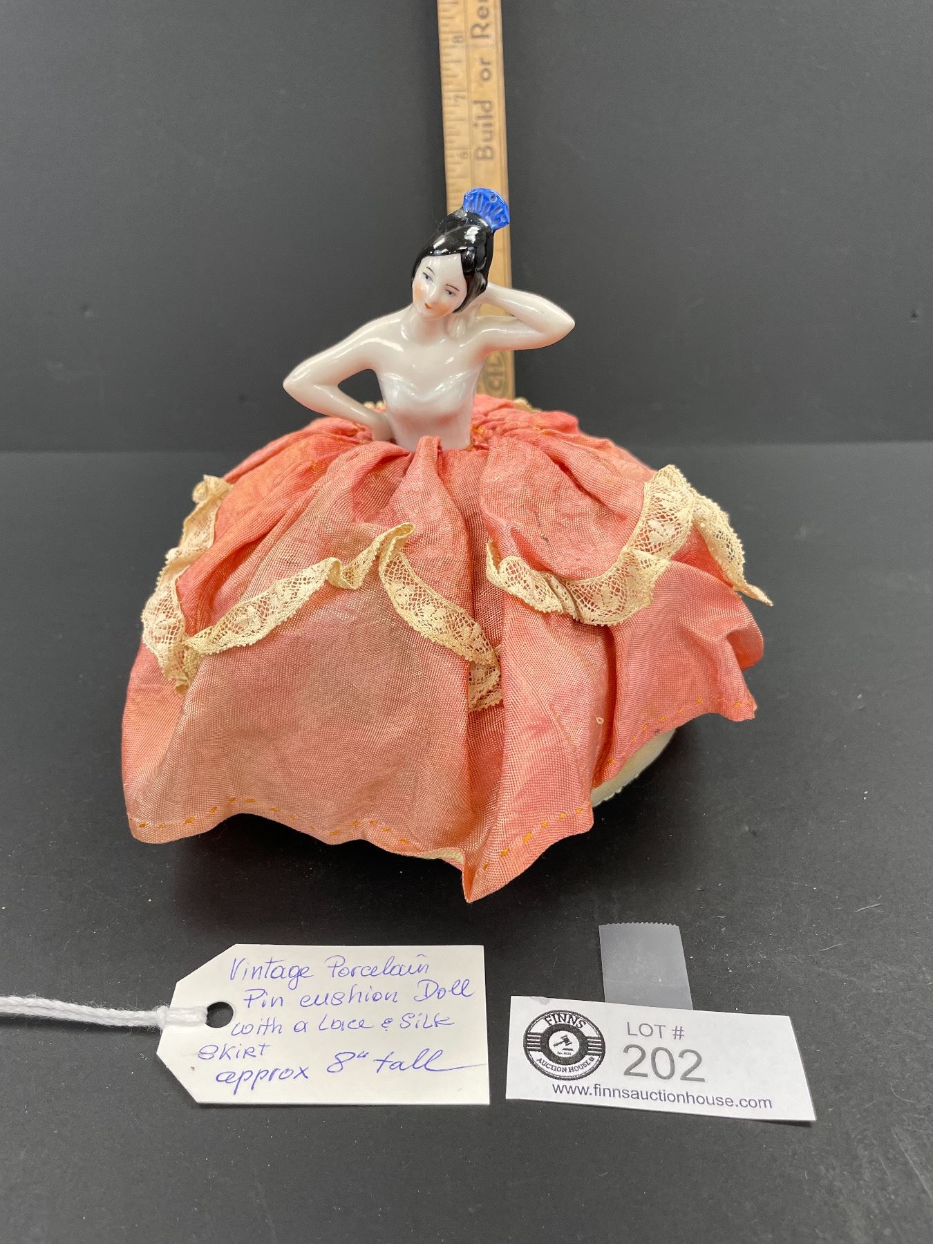 Vintage Porcelain Pin Cushion Doll with Lace and Silk Skirt