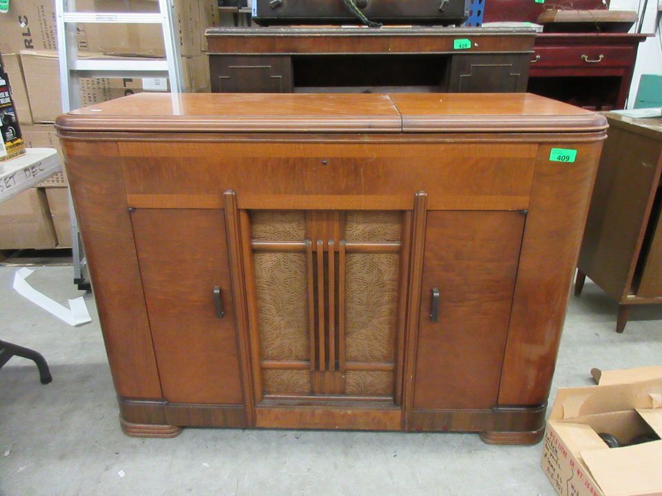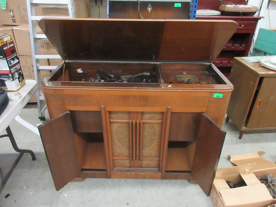 Built in turntable and standard broadcast radio. 19" x 48" x 34" tall.