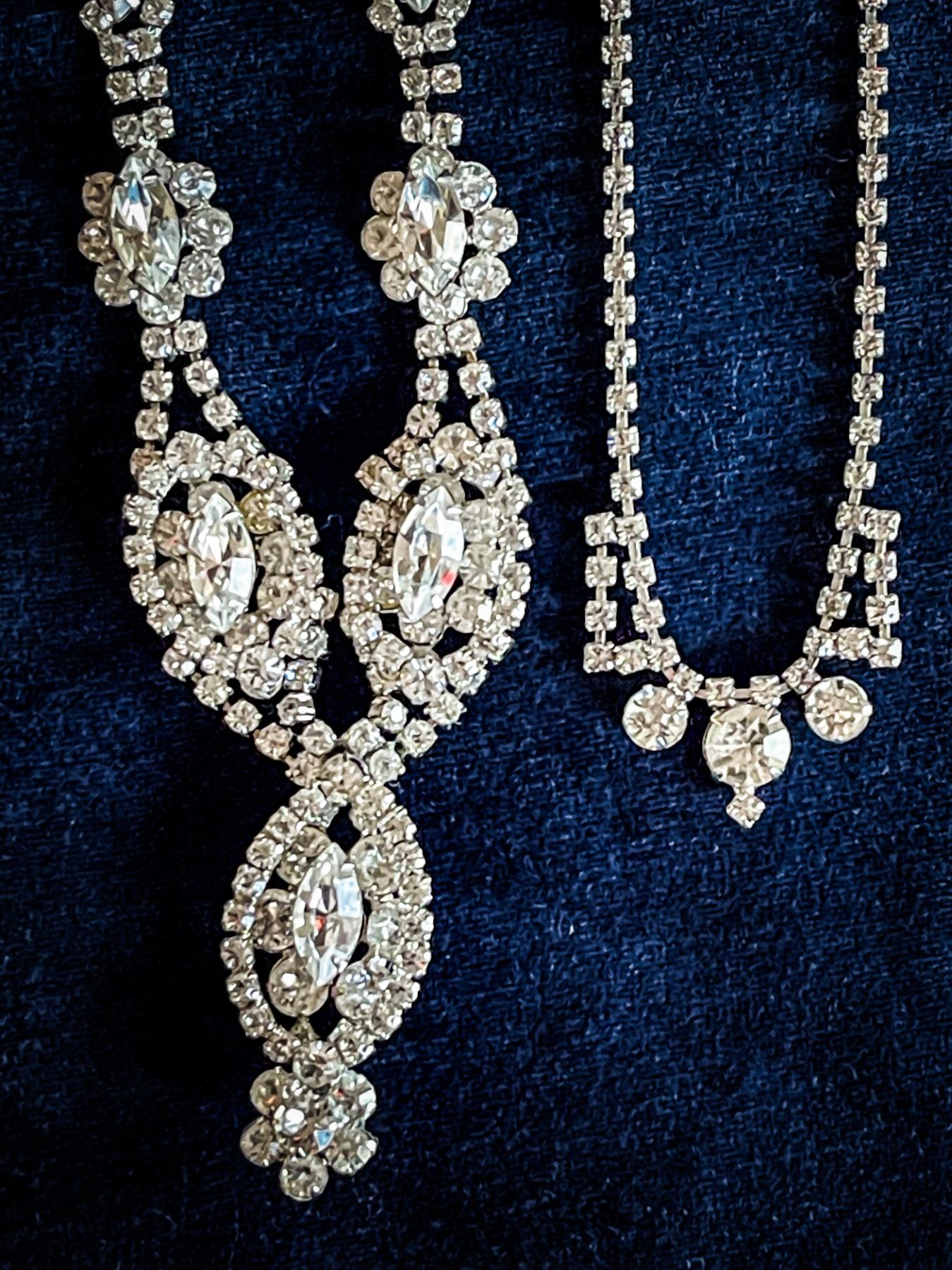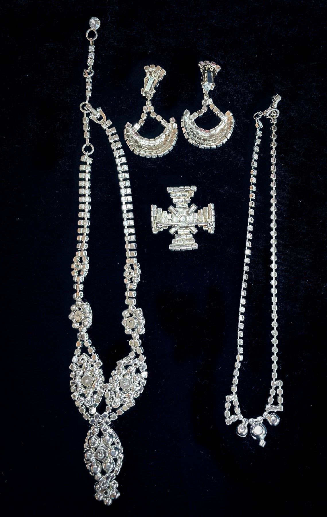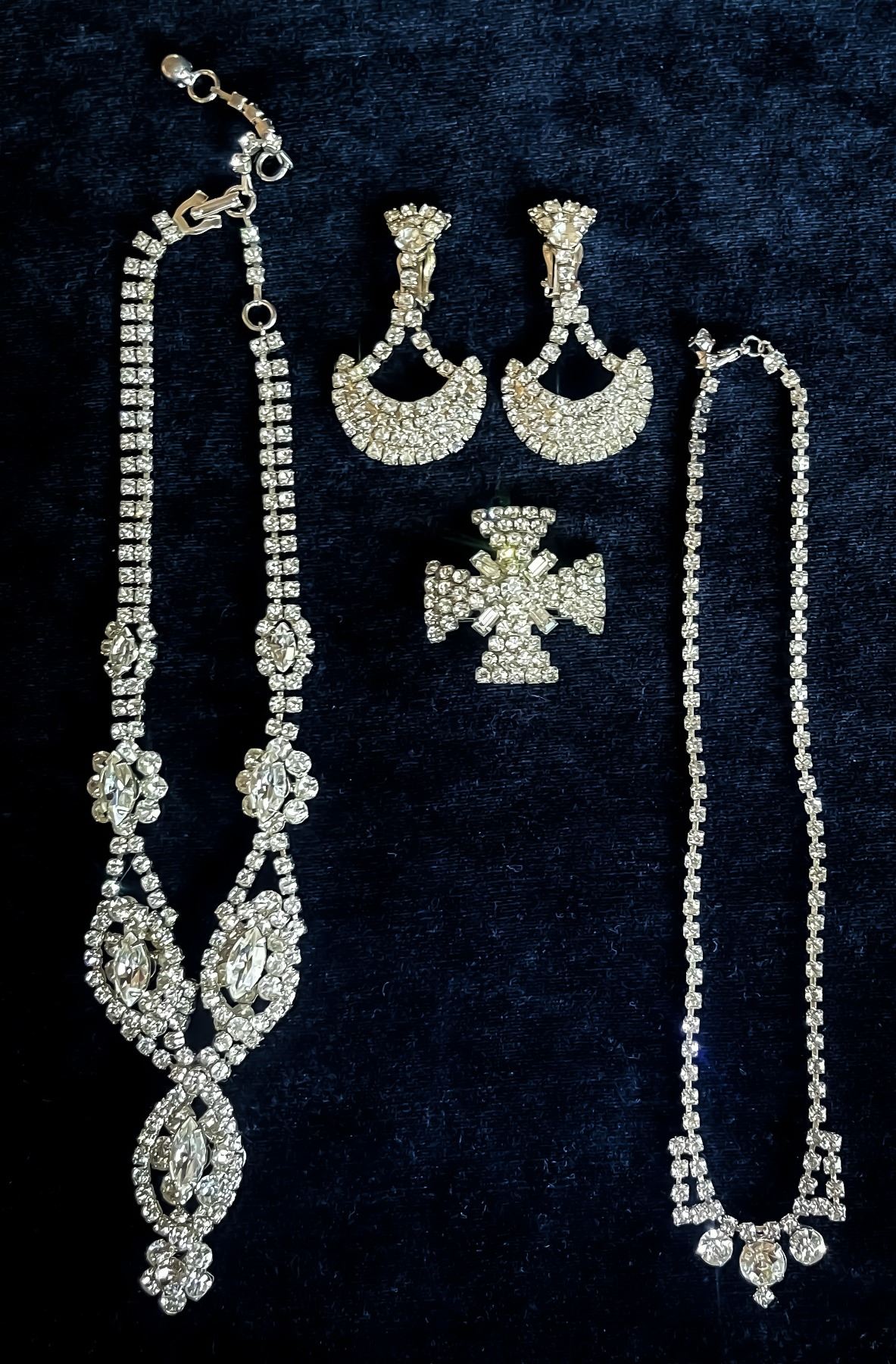 vintage set - 2 rhinestone necklaces, large clip-on earrings, and brooch. Good condition