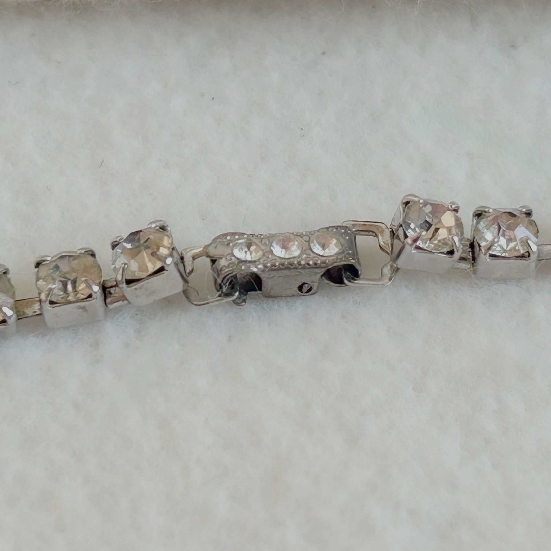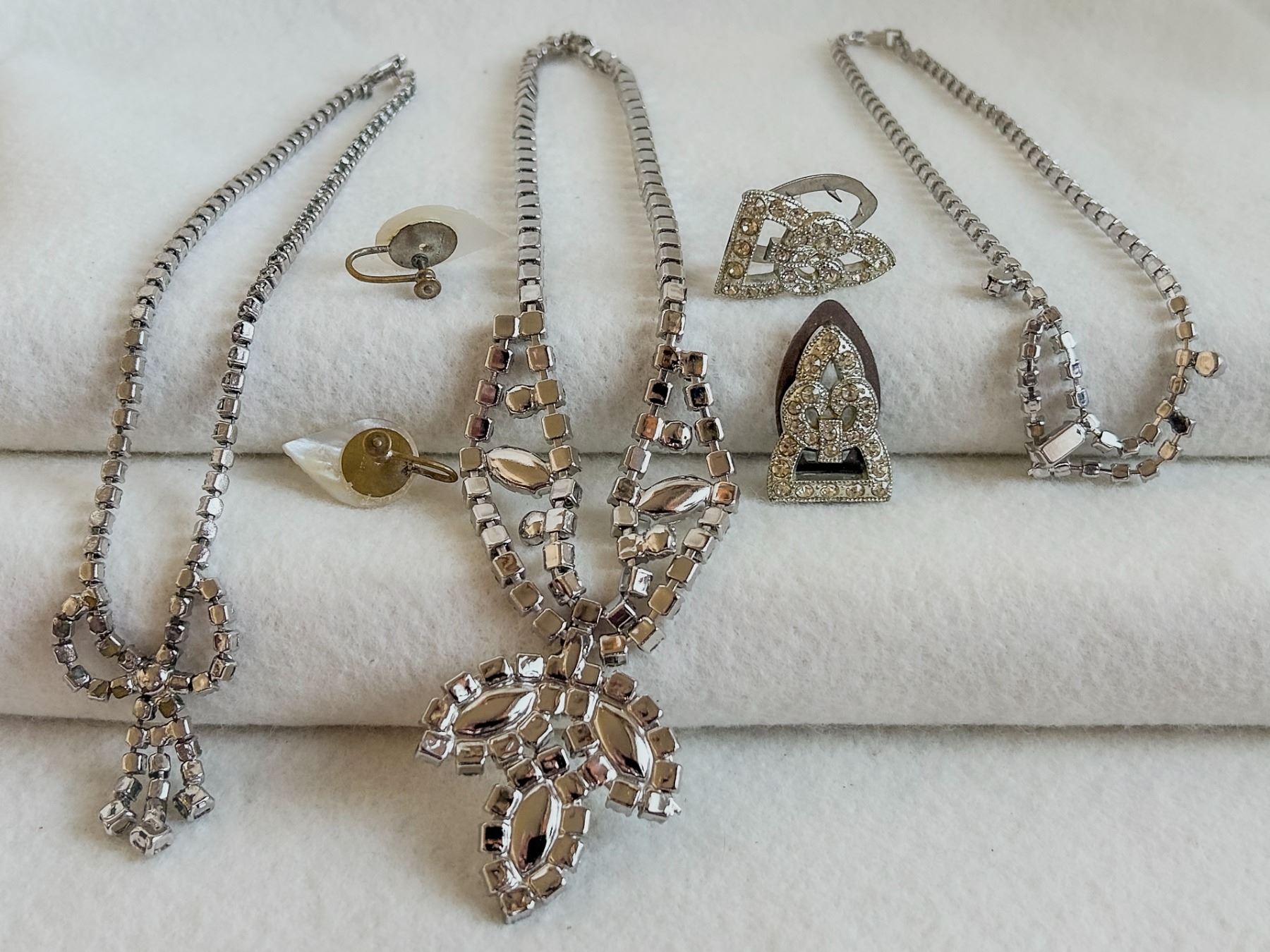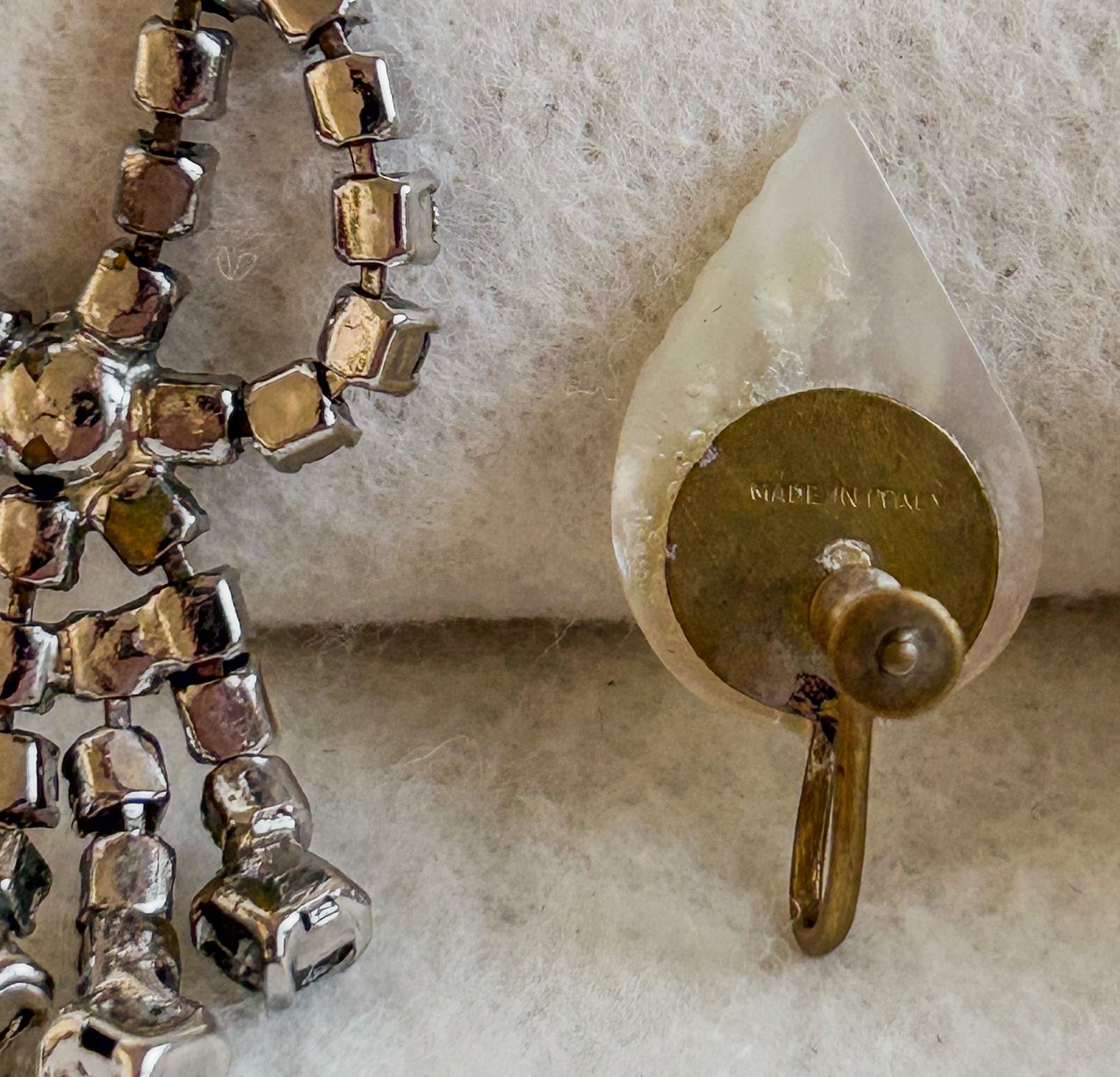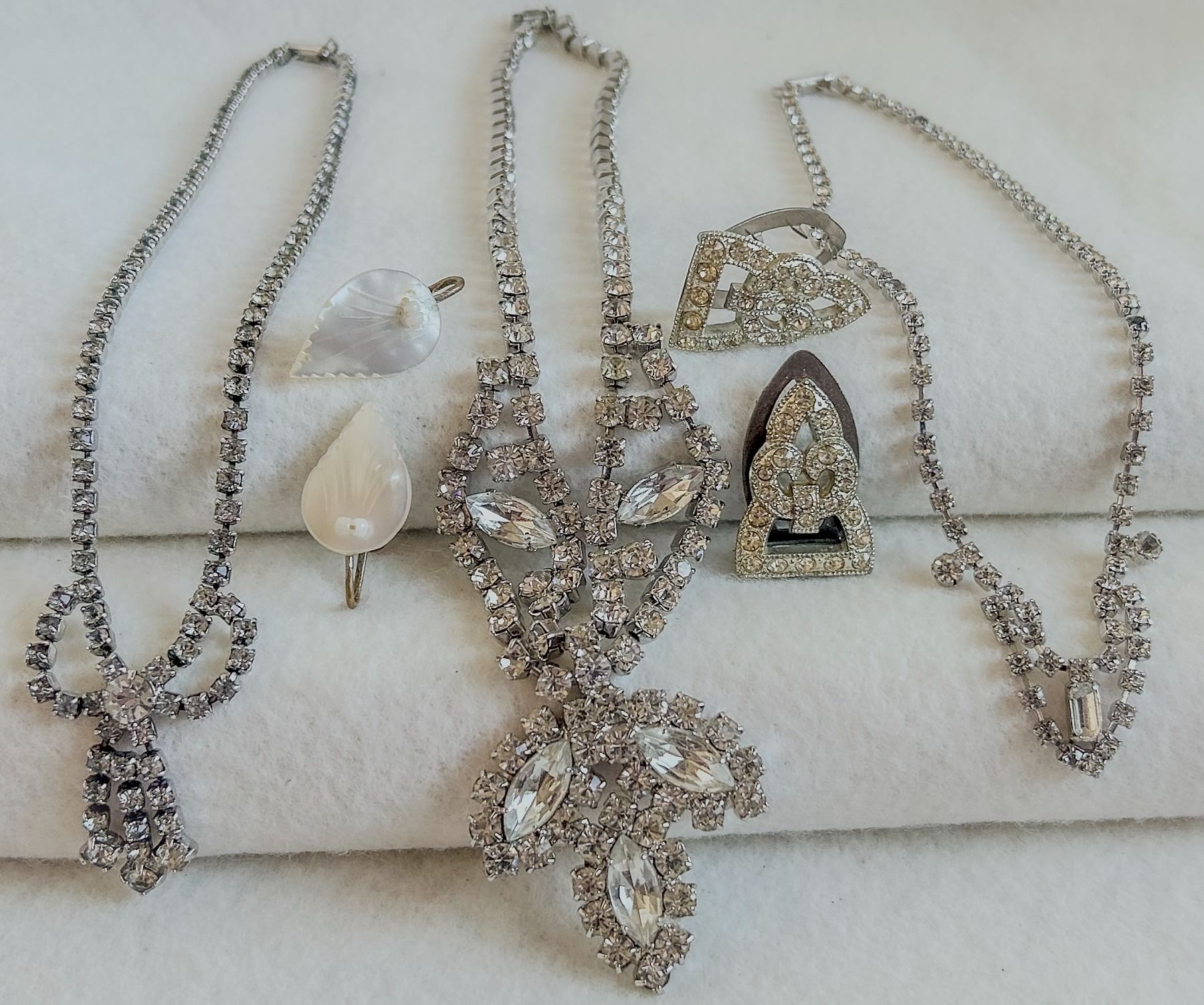 Lot includes 3 sparkling vintage rhinestone necklaces in excellent condition, a pair of Italian screw-back mother of pearl earrings, and a set of rhinestone Goody collar clips. A beautiful selection of mid-century costume jewelry.