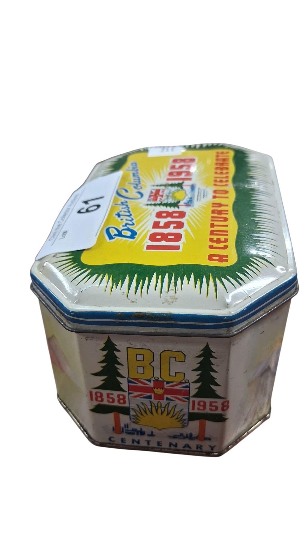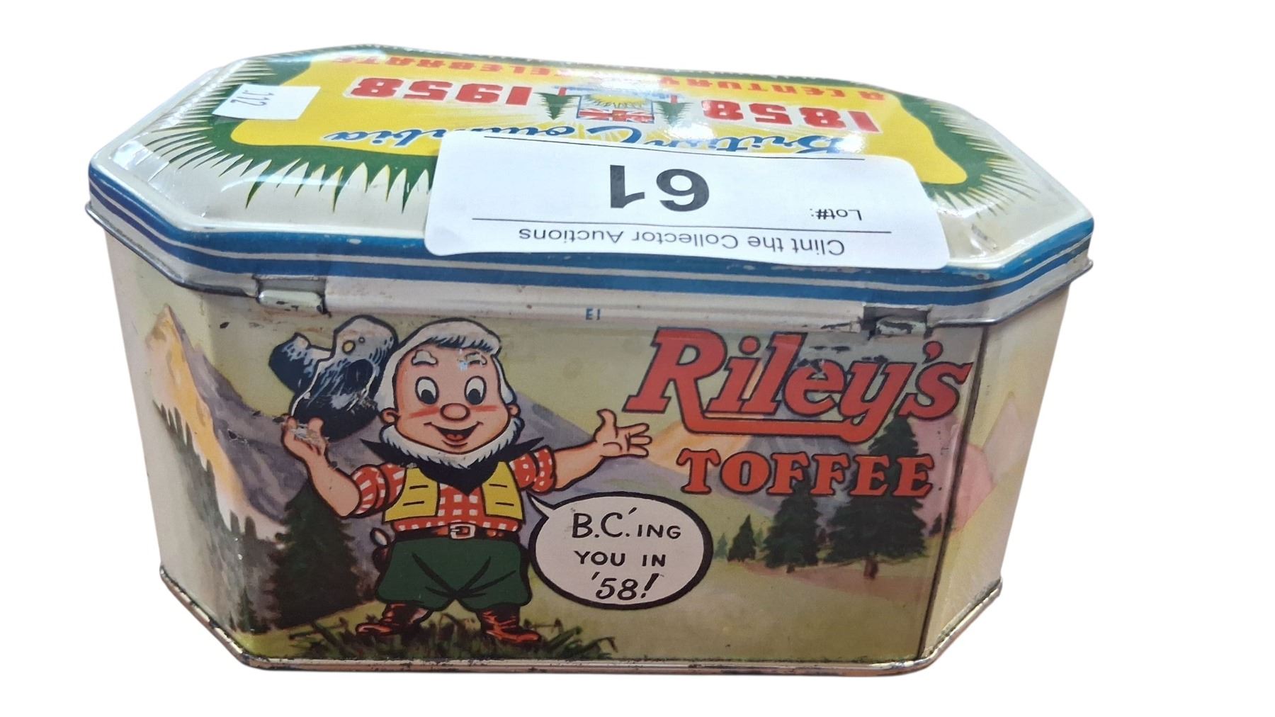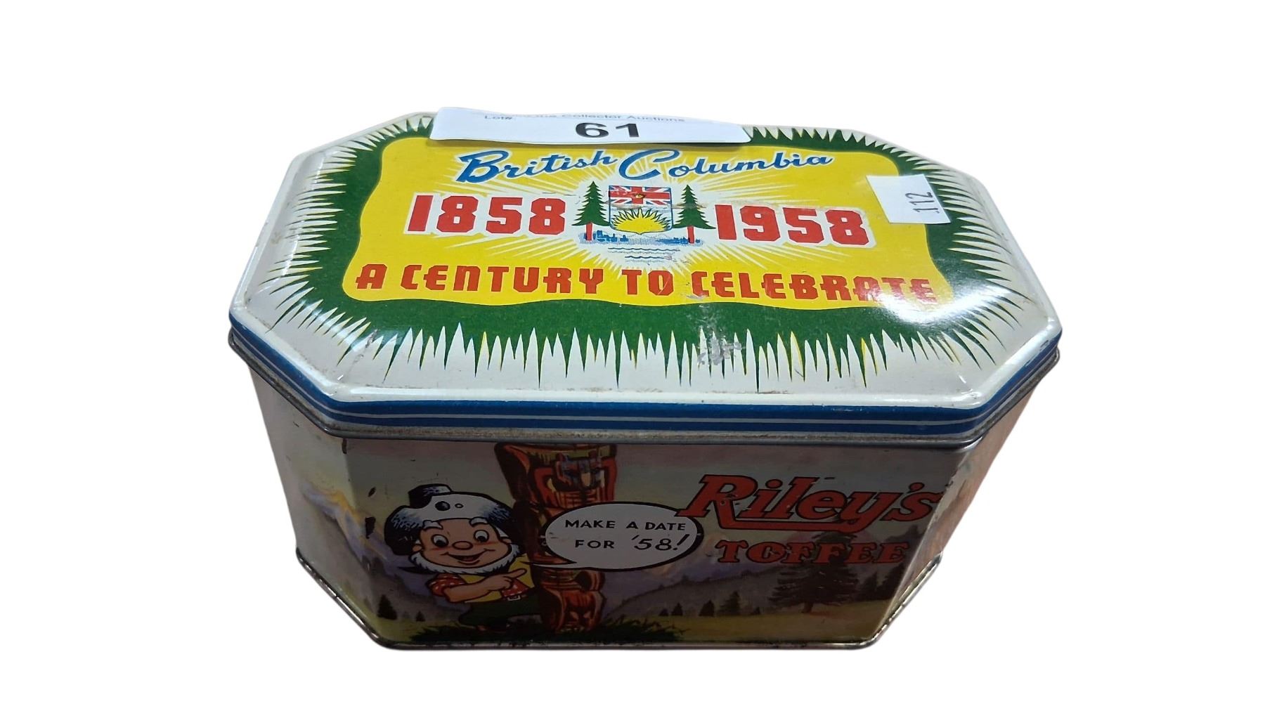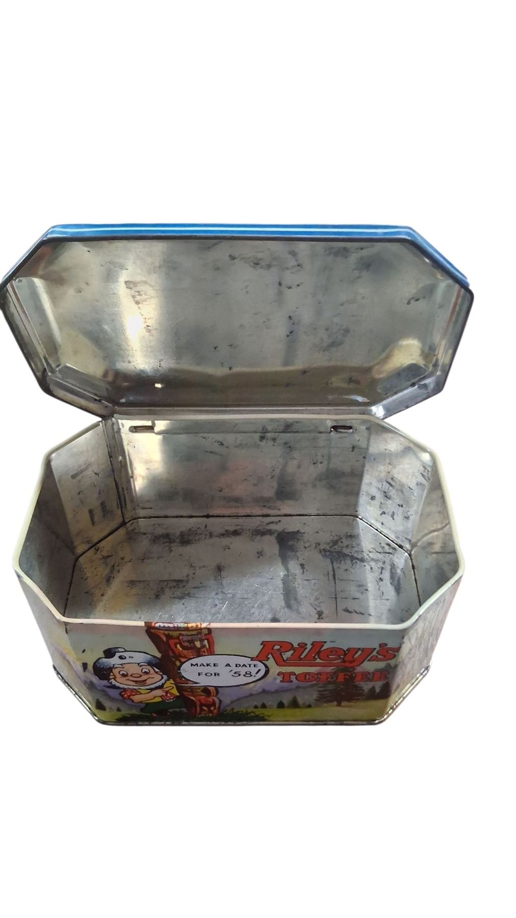 Vintage Riley's Toffee can, great graphics 1958 approx 6" BC centennial