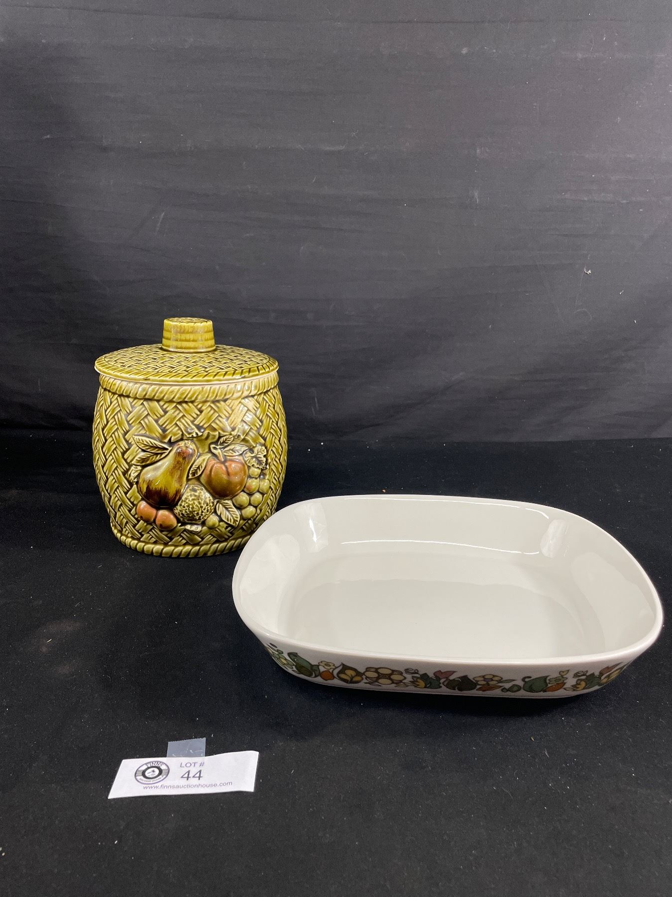 Vintage Royal Doulton 'Forest Flower' Open Pan 10" x 9" & Cookie Jar w/Basketweave Pattern Made In Japan - 7" Tall