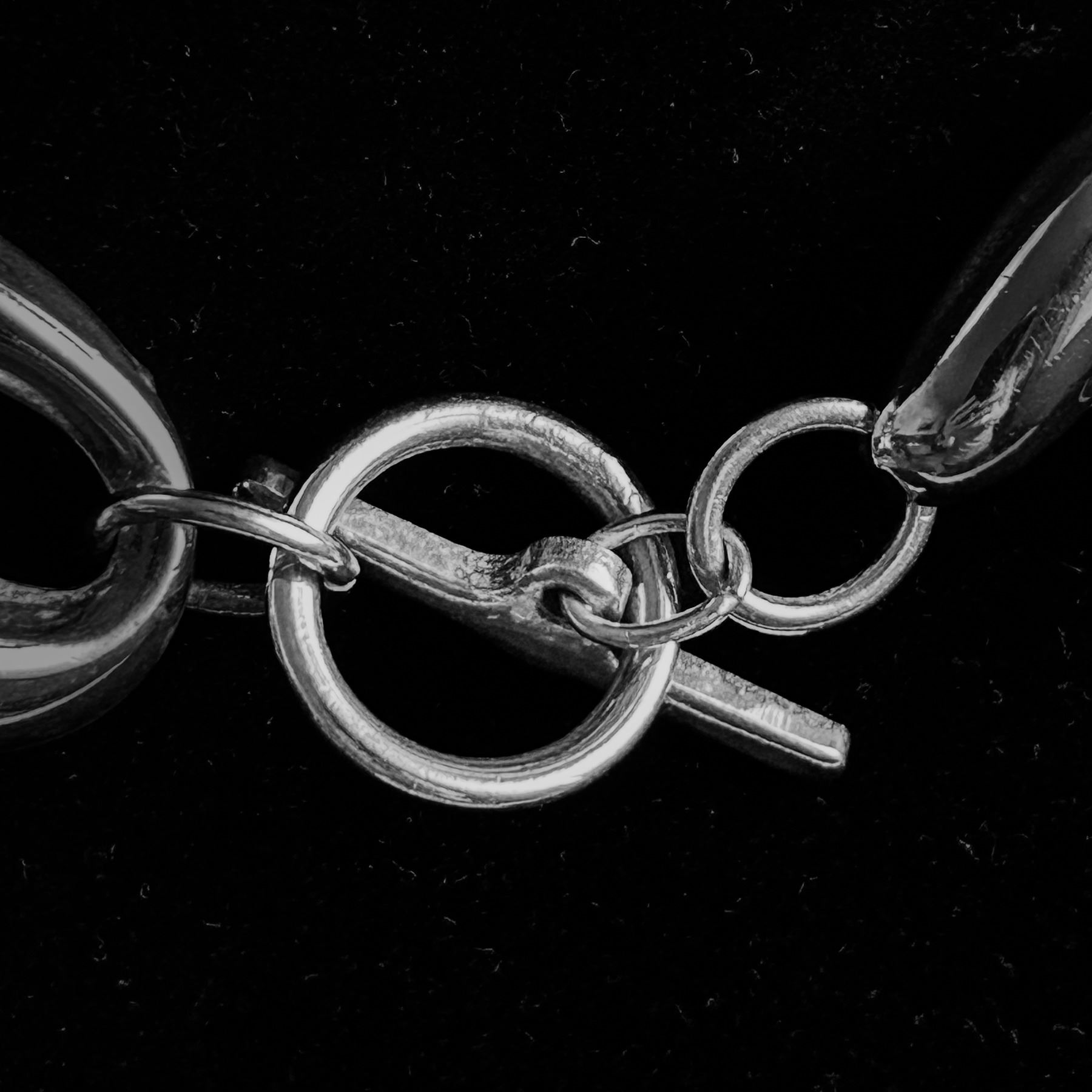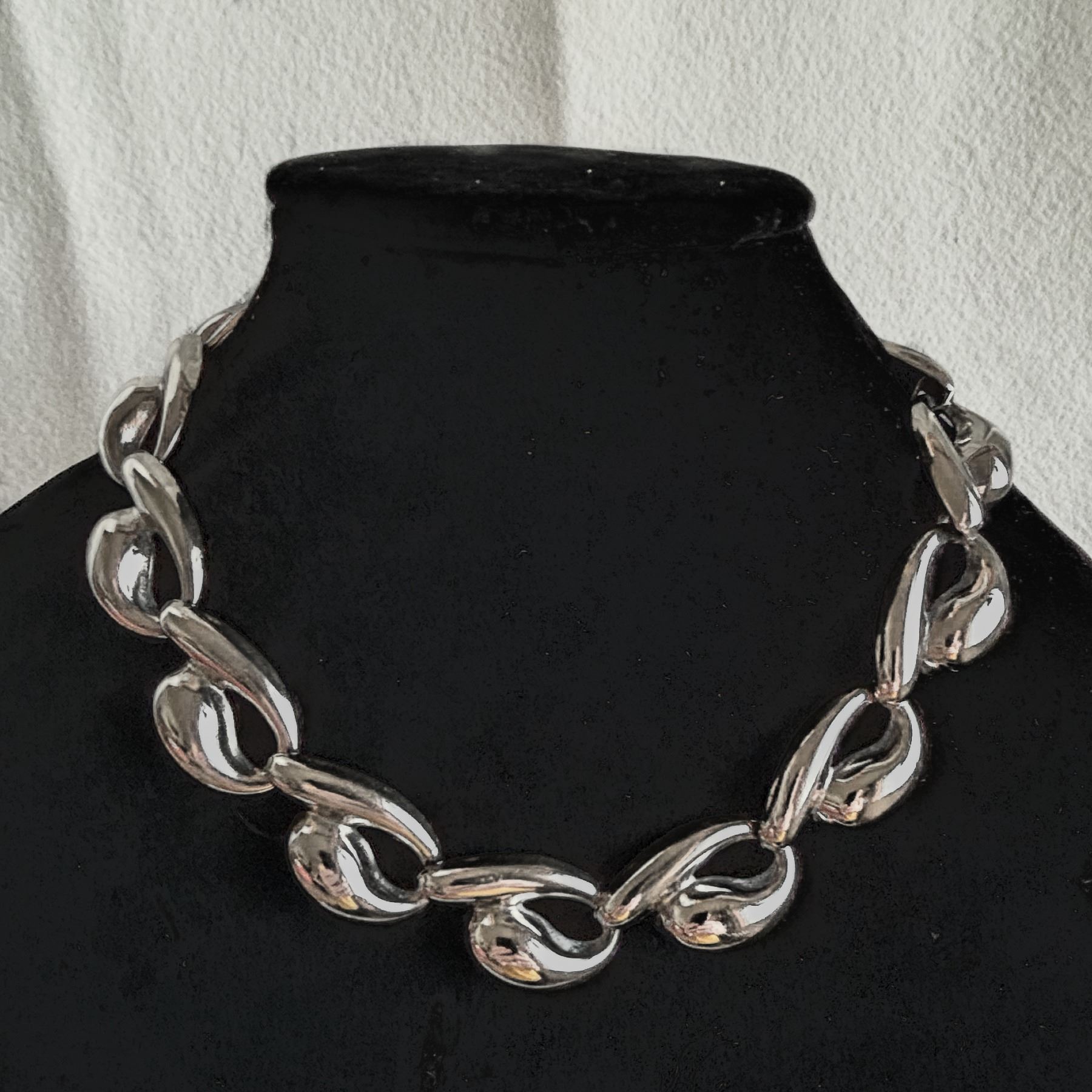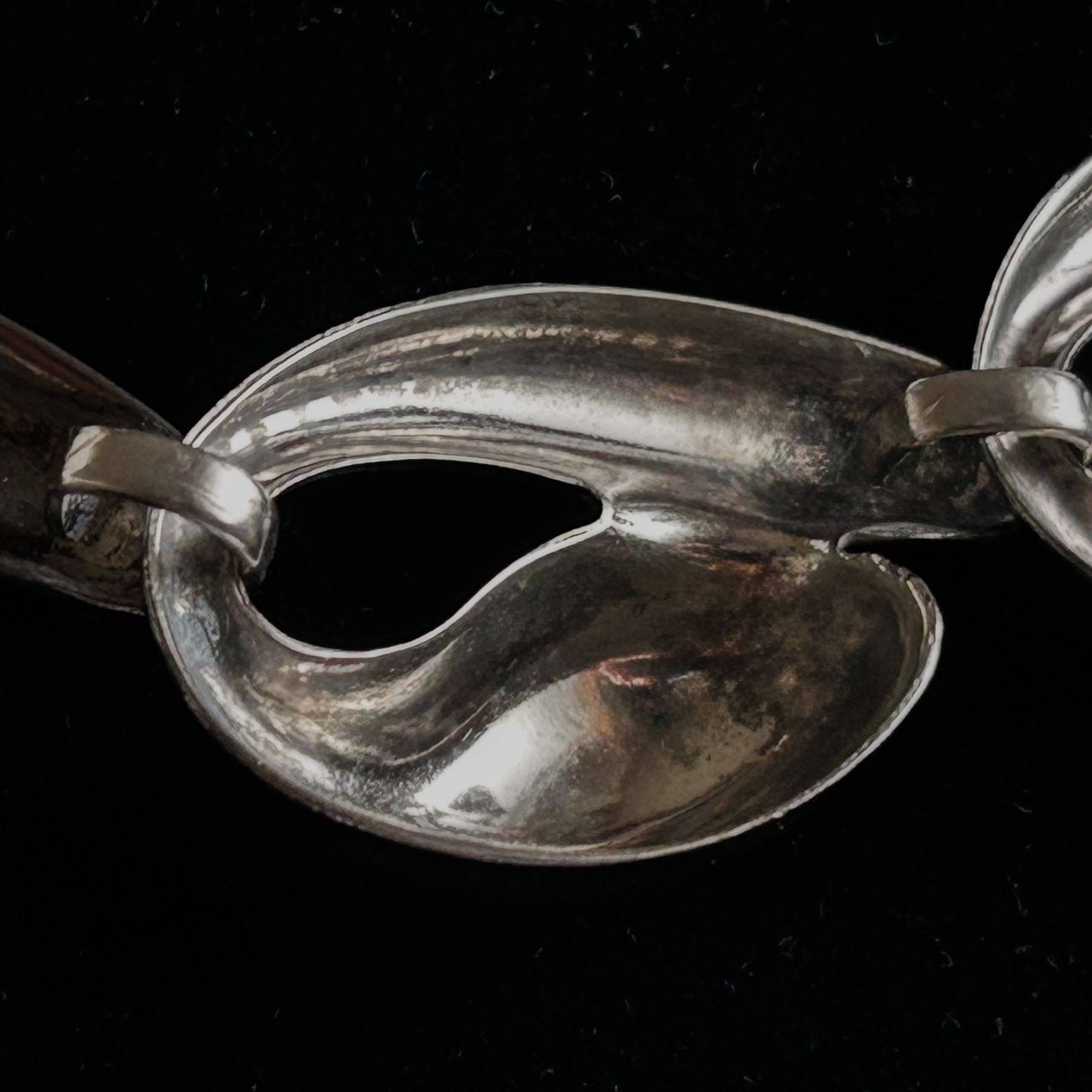 Elegant vintage necklace featuring large interlocking sculptural links in a high-polish silver-tone finish. Likely silver-plated over a lightweight base metal, with no visible hallmarks. The biomorphic forms give this piece a bold modernist presence, with a well-made construction and secure toggle clasp. Cleaned and ready to wear.