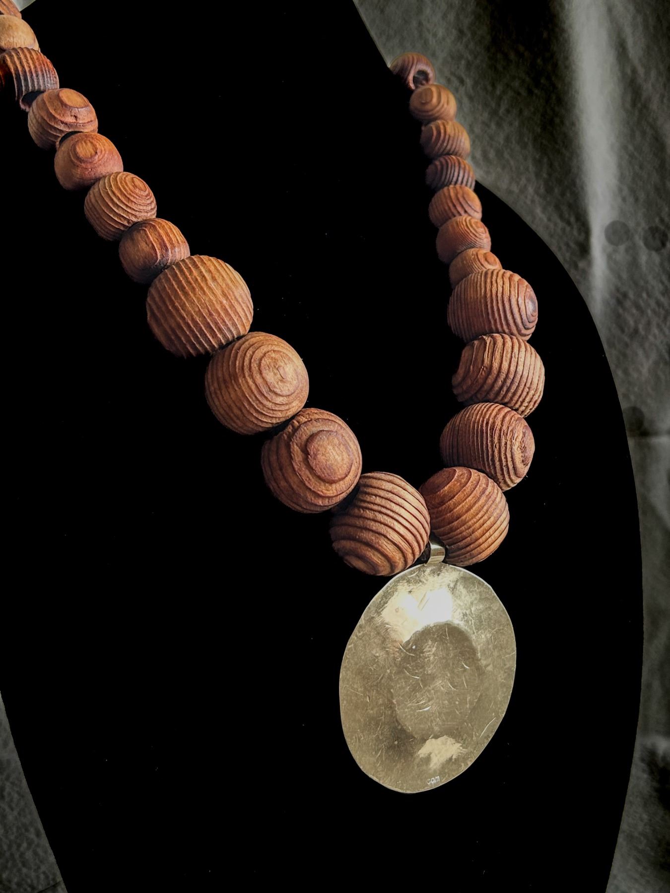 Vintage artisan necklace with grooved wood beads and a large, hand-hammered brass pendant stamped “cam.” The textured surface and organic form suggest studio craft production. Strung on cord with a rustic tie closure. A bold and earthy piece, likely 1970s studio or brutalist design