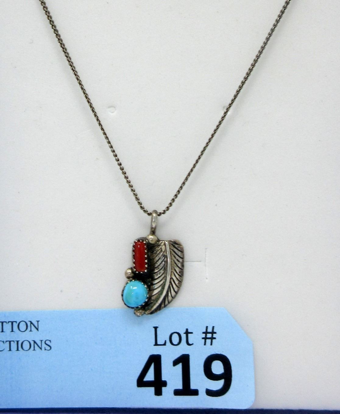 1" Turquoise and Coral Sterling Feather Pendant on an 18" Sterling Silver Chain.