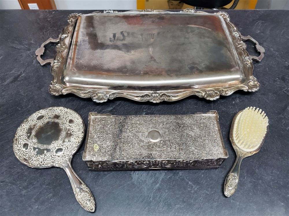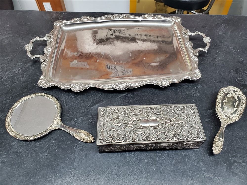 Vintage Silver Mirror, Brush, Tray & Heavy Silver Box - Most Items have not been tested - 17% Buyer Fee. Payment Processed through Live Auction World ( Visa or Master Card ) pick up Saturday, or Tuesday
