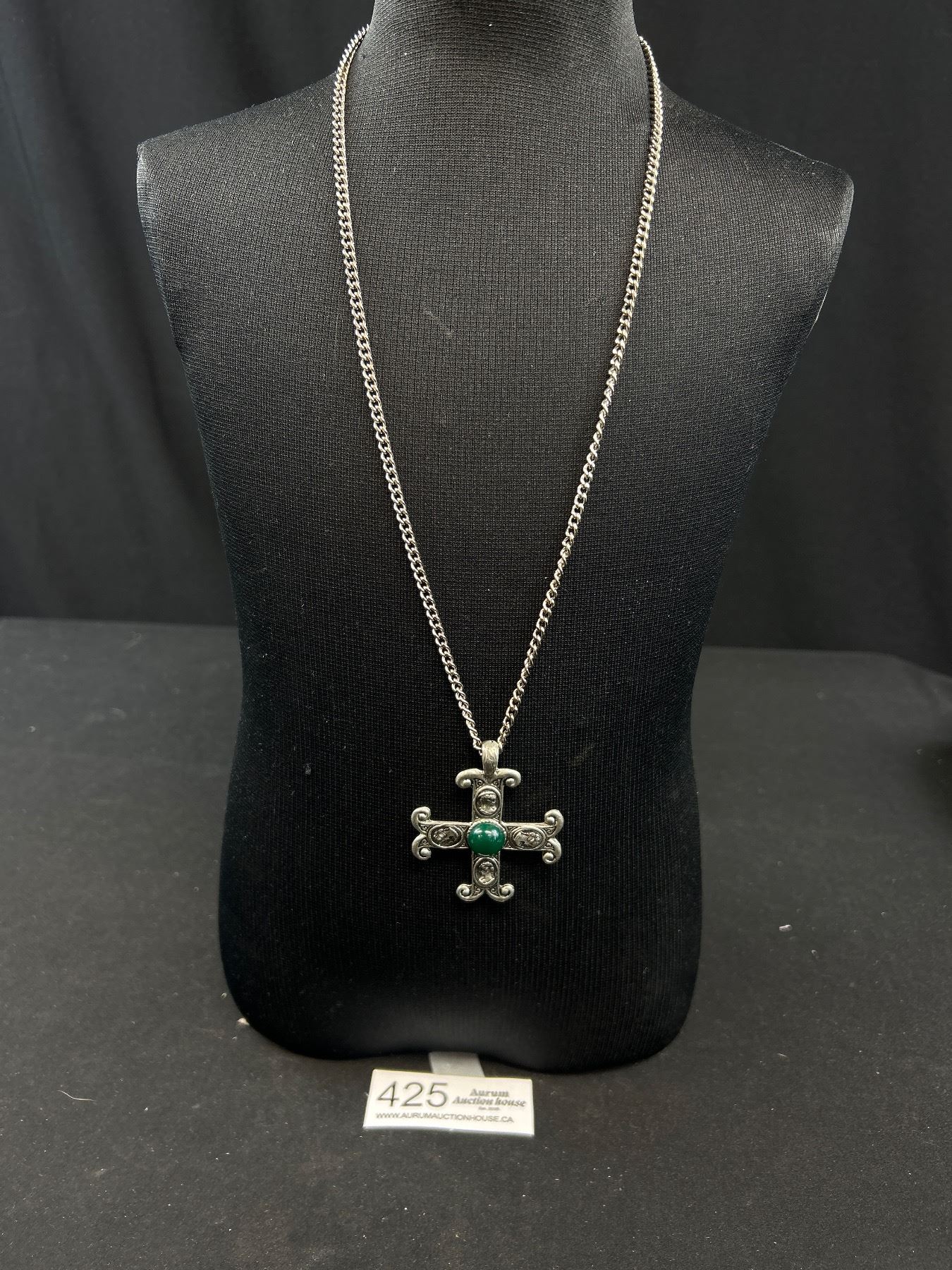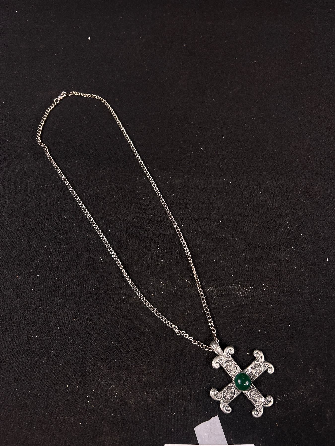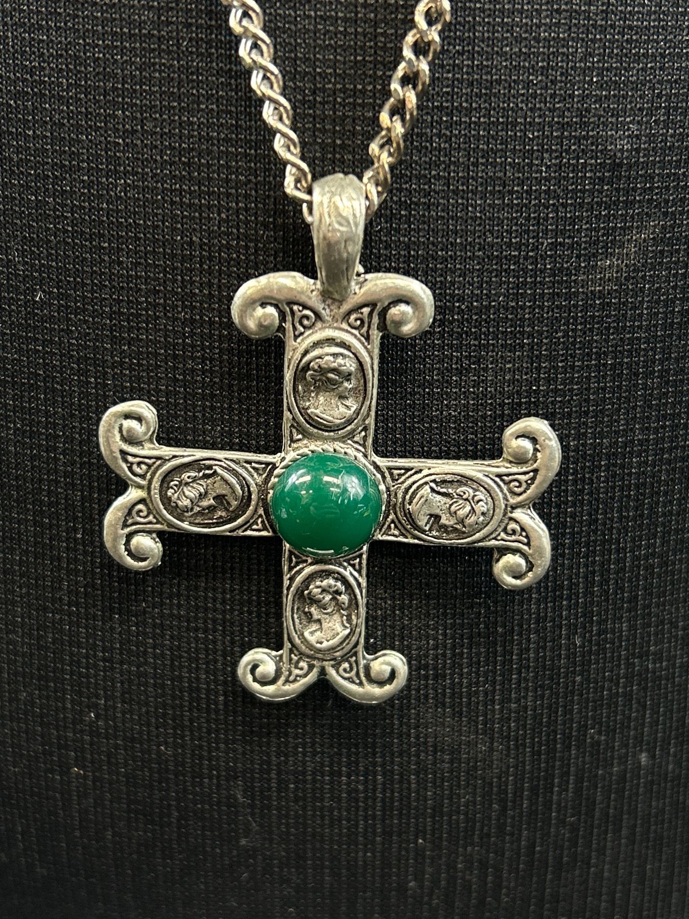 Vintage Silver Tone w/ Green Stone Cameo Cross Pendant + Chain Necklace