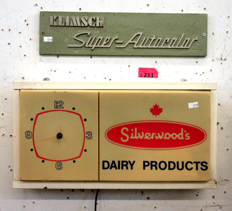 Illuminated clock is missing its hands and measures 18" x 10" tall. Klimsch Auto-Colour sign measures 16" x 5".