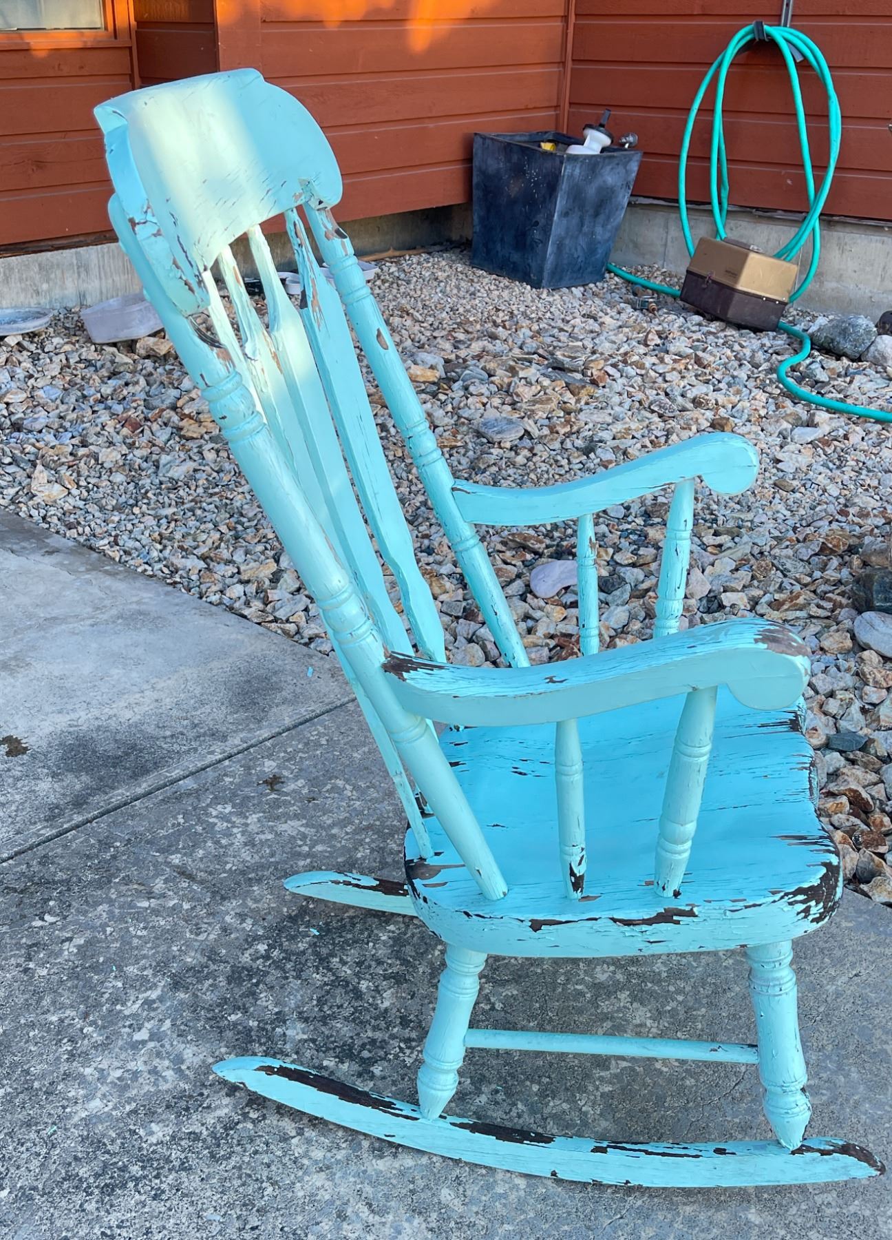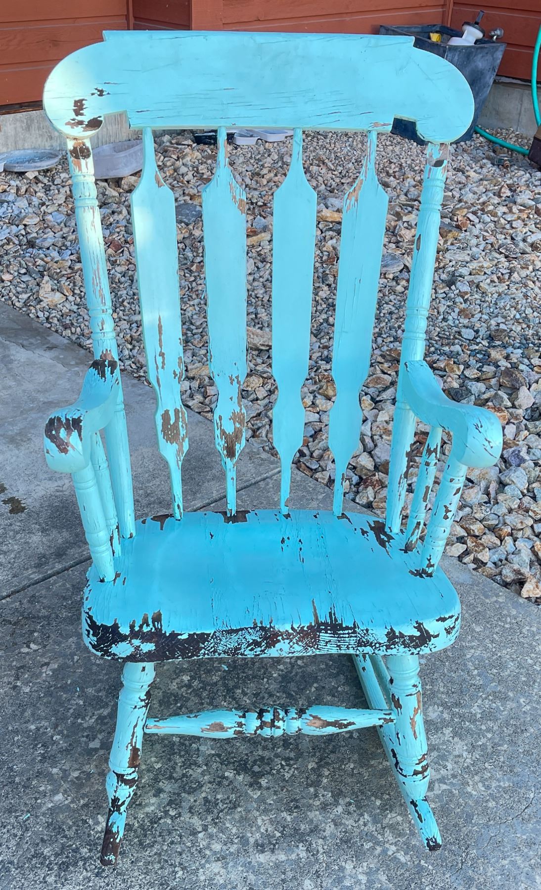 Sturdy vintage solid wood rocking chair with turned spindle details and a beautifully worn turquoise paint finish. Chair is structurally sound and comfortable but could use refinishing or touch-up for restoration. A charming farmhouse or shabby chic piece with authentic patina and classic design.