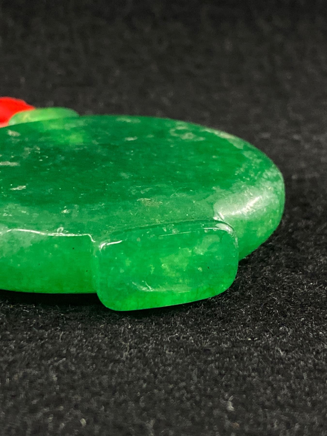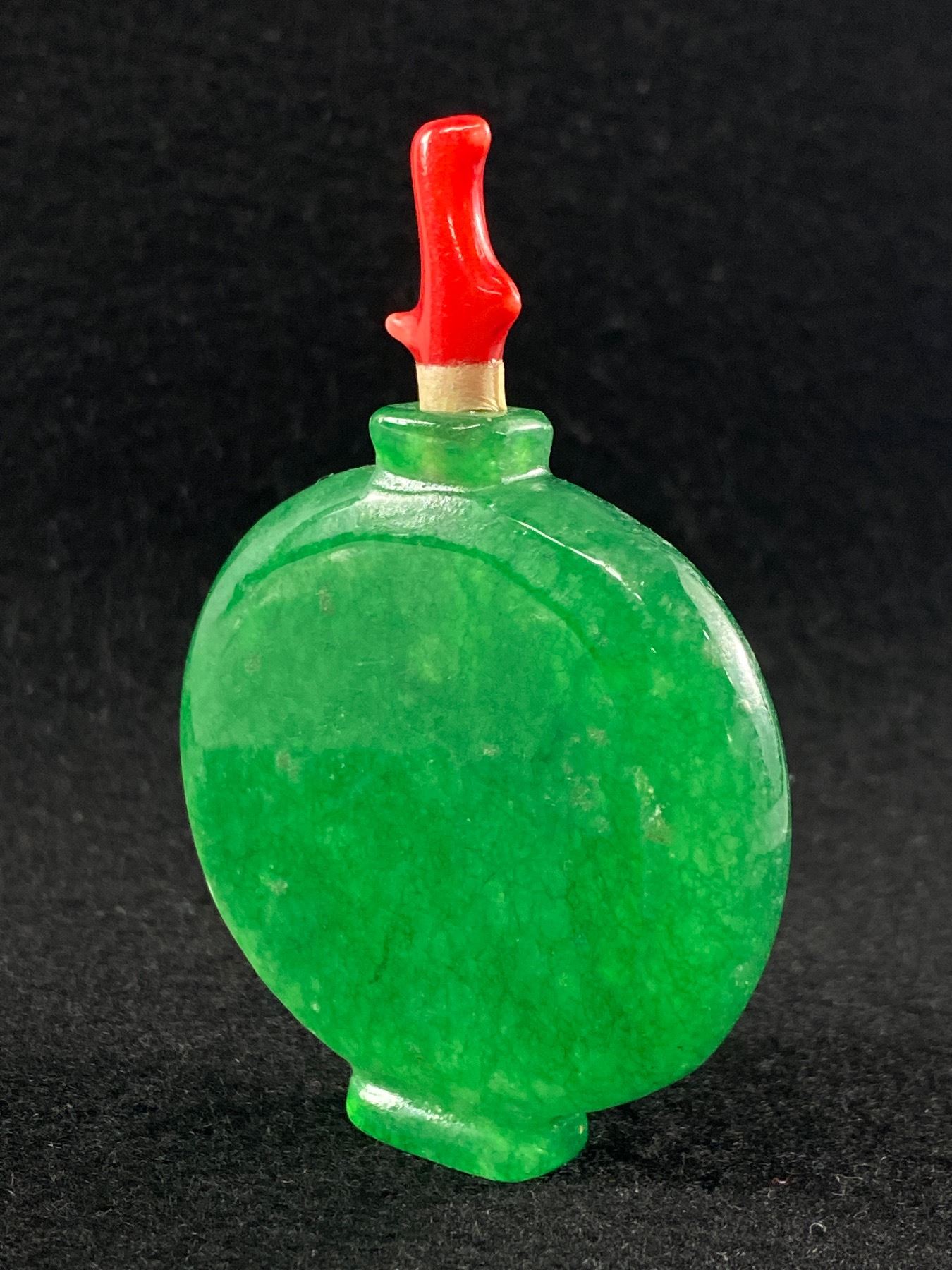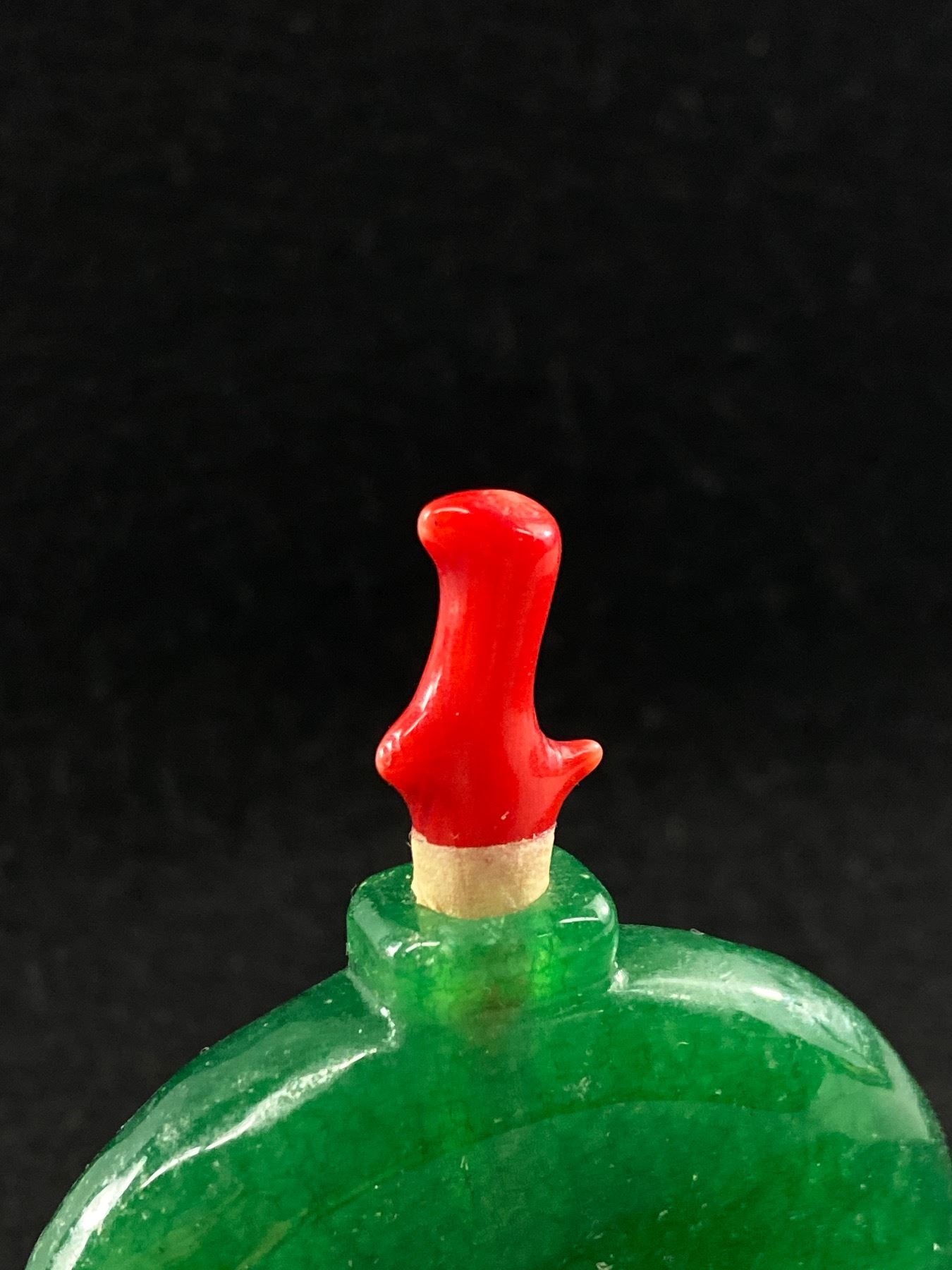 Vintage Spinach Green Jadeite Snuff Bottle w/ Coral Top