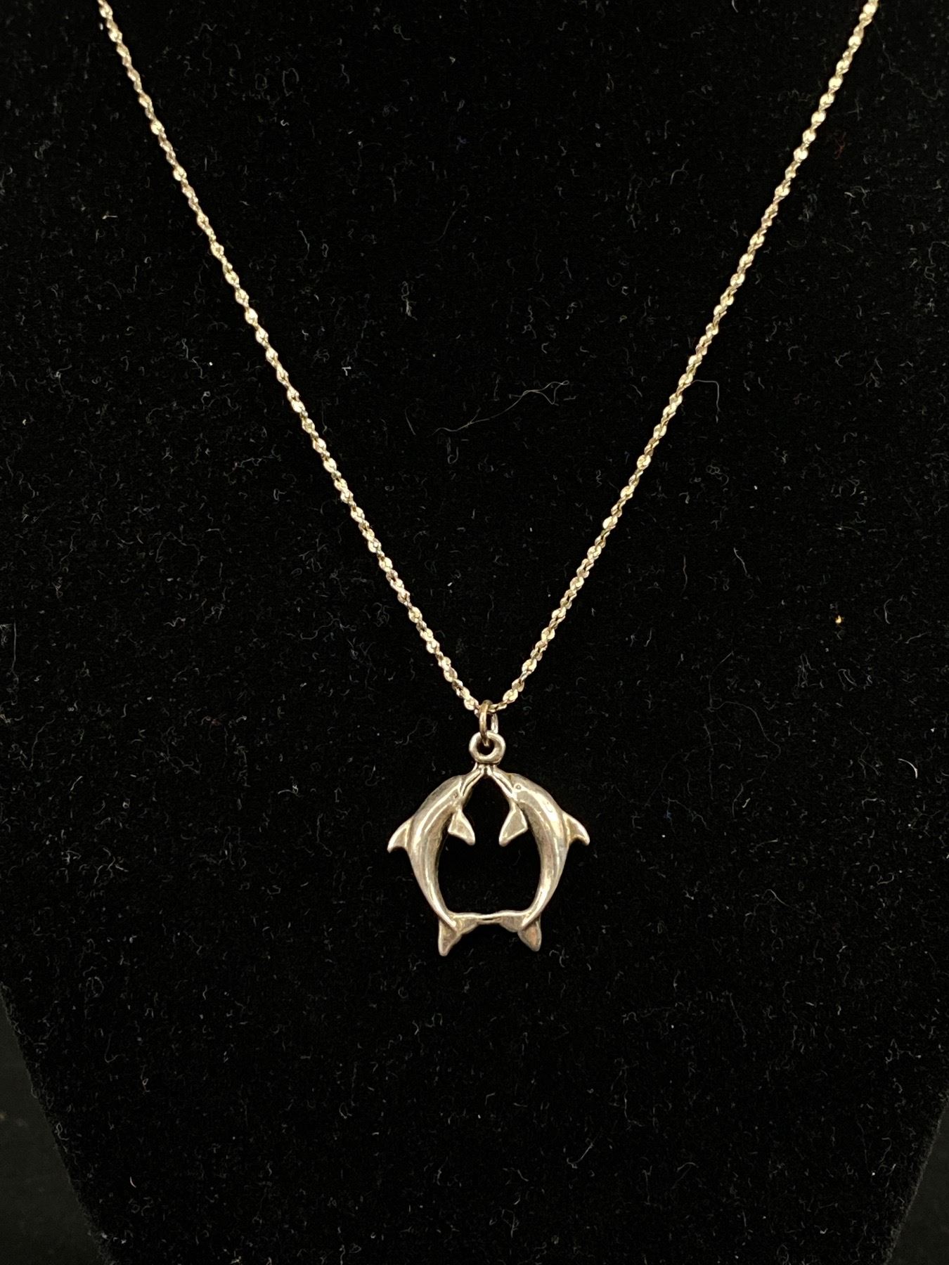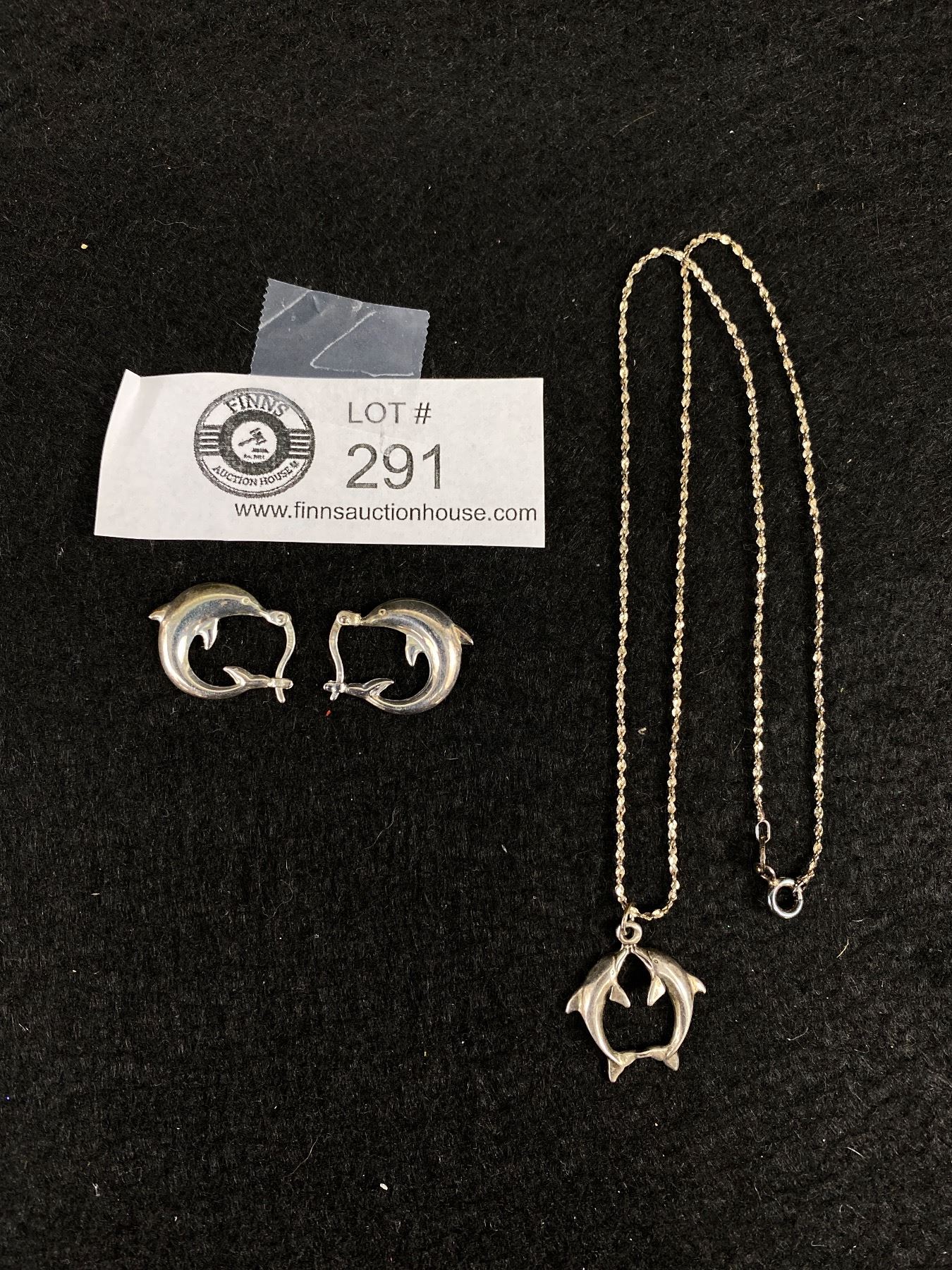 Vintage Sterling Silver 2 Dolphines Pendant w/Chain Necklace & Pair Matching Earrings