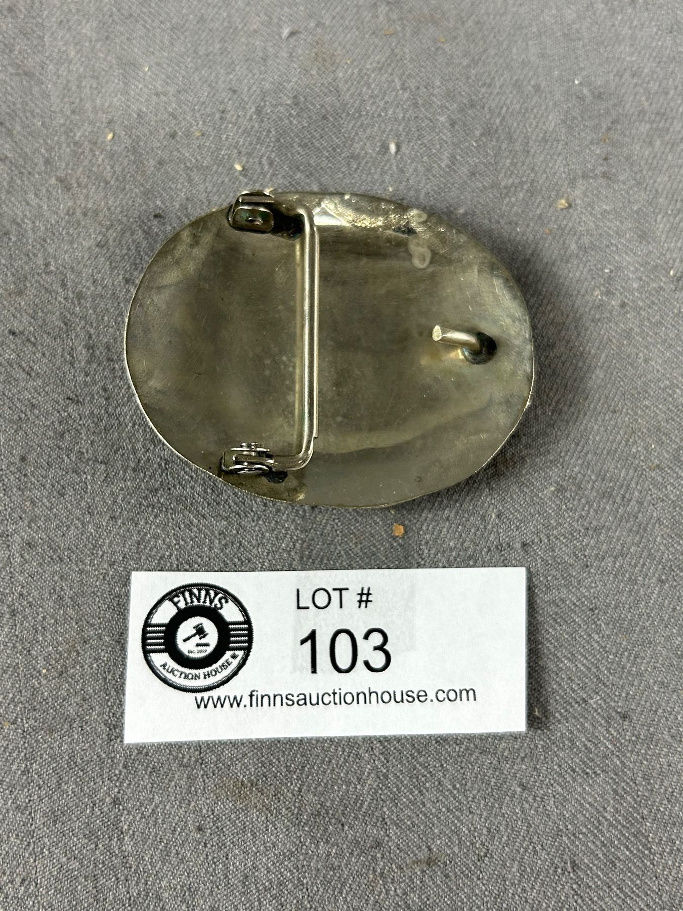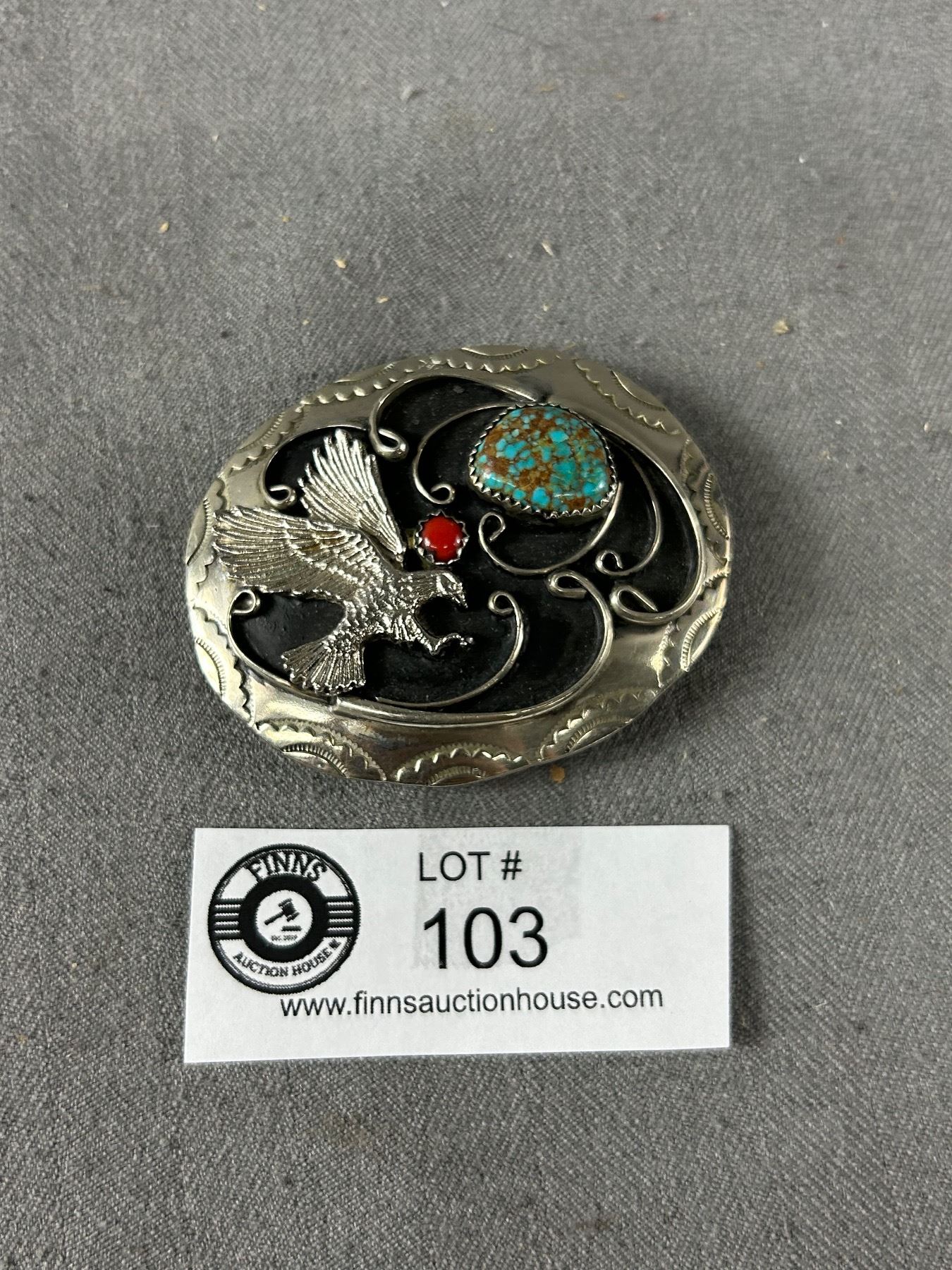 Vintage Sterling Silver Belt Buckle with Turquoise & Red Coral