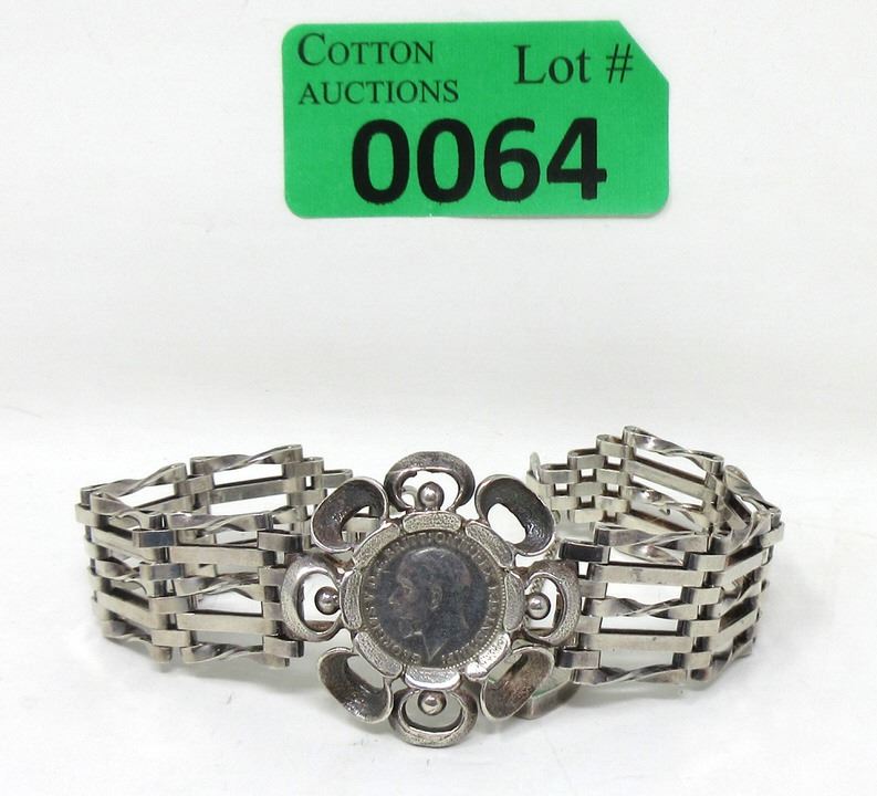 1936 Three Pence coin in center of bracelet. British hallmarks. Heart lock safety clasp. 1.25" wide at the center. 26.7 grams.