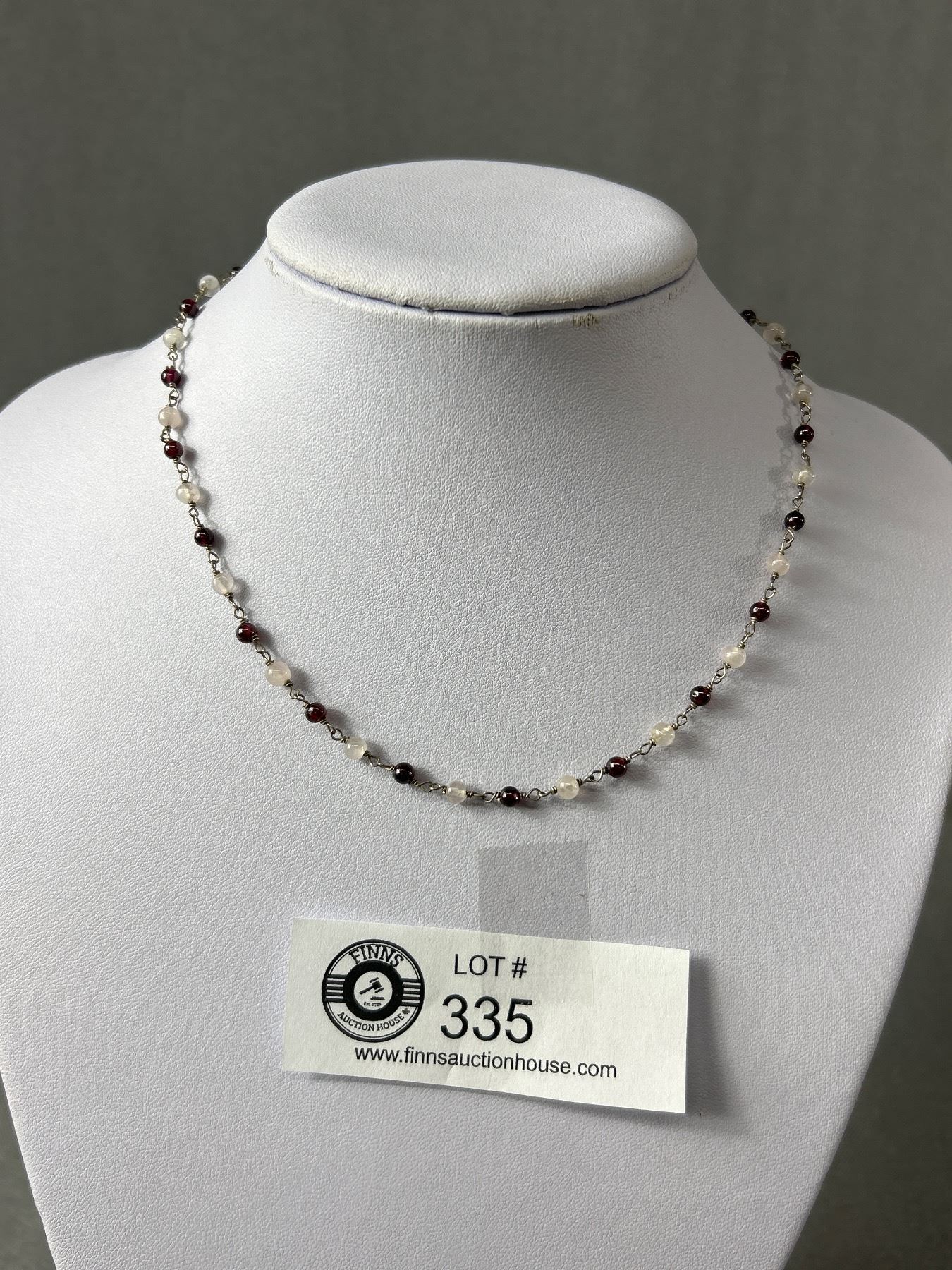 Vintage Sterling Silver Linked w/ Garnet & Moonstone Necklace, Marked .925