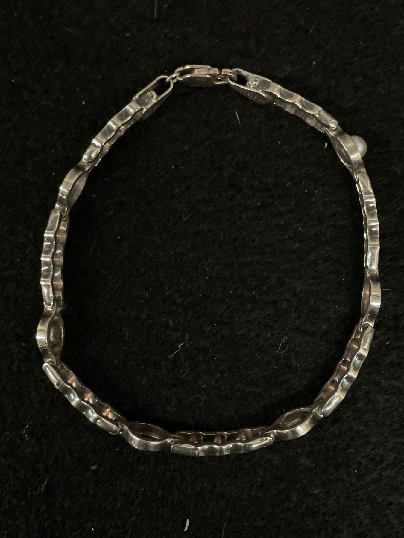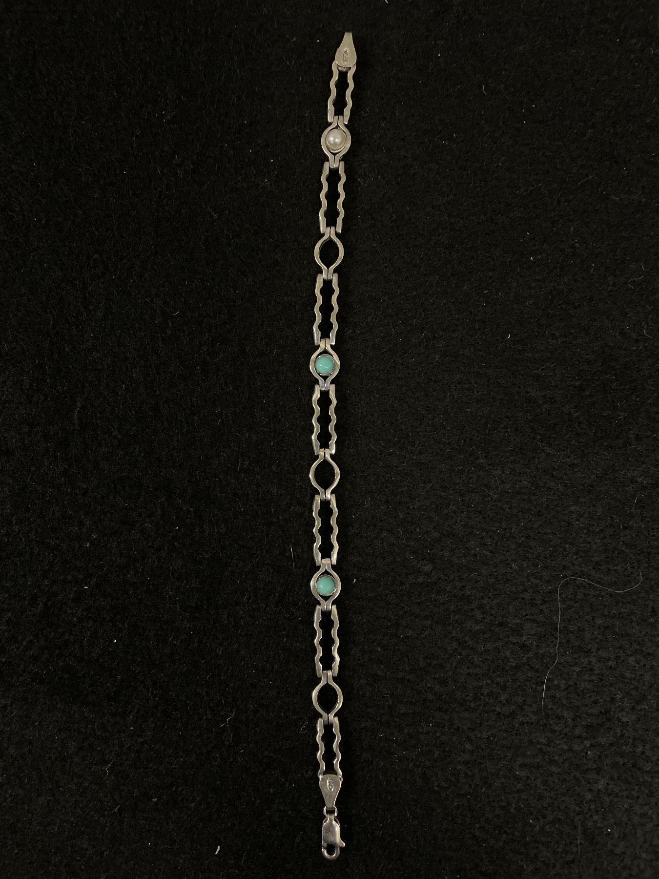 Vintage Sterling Silver w/ One Pearl + 2 Turqouise Beads Bracelet Marked 925 Italy