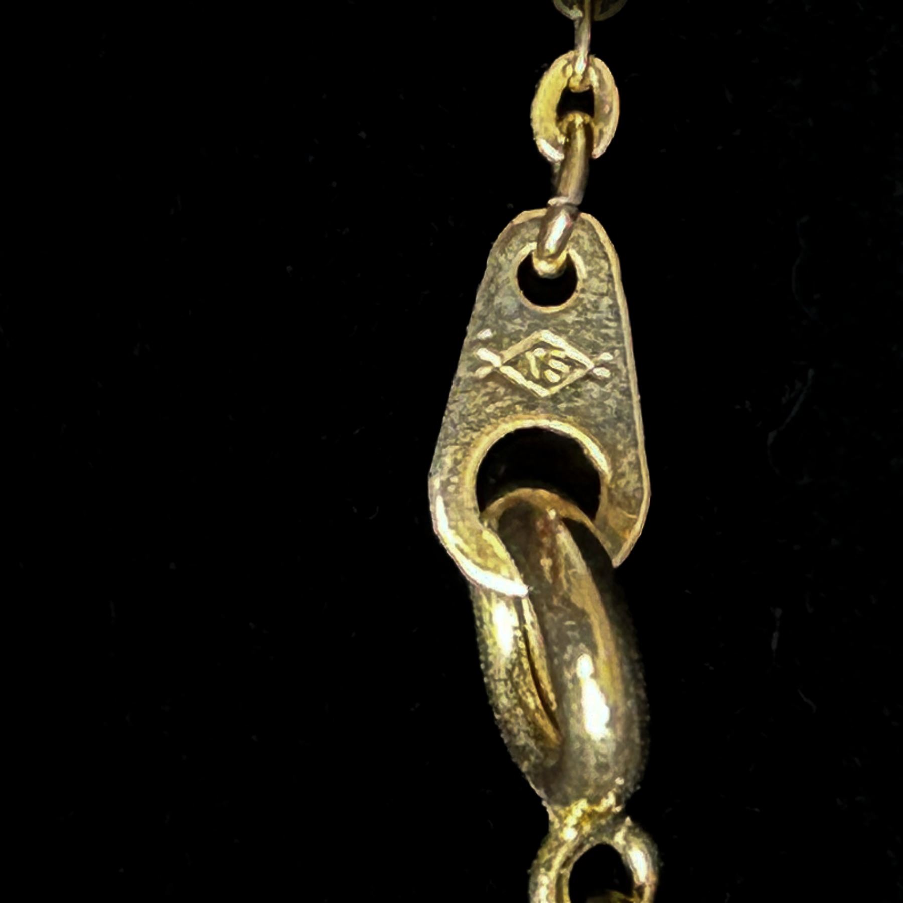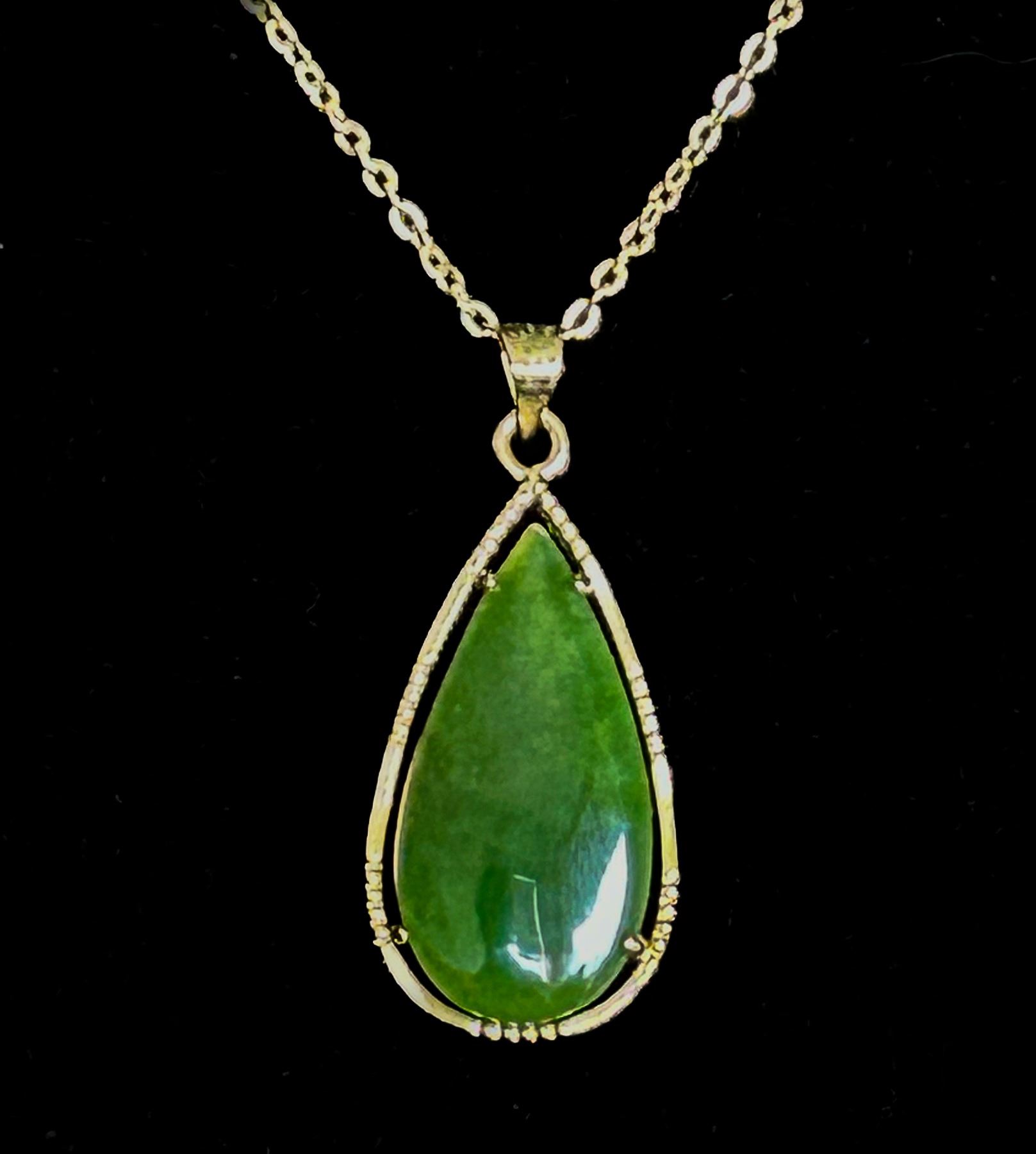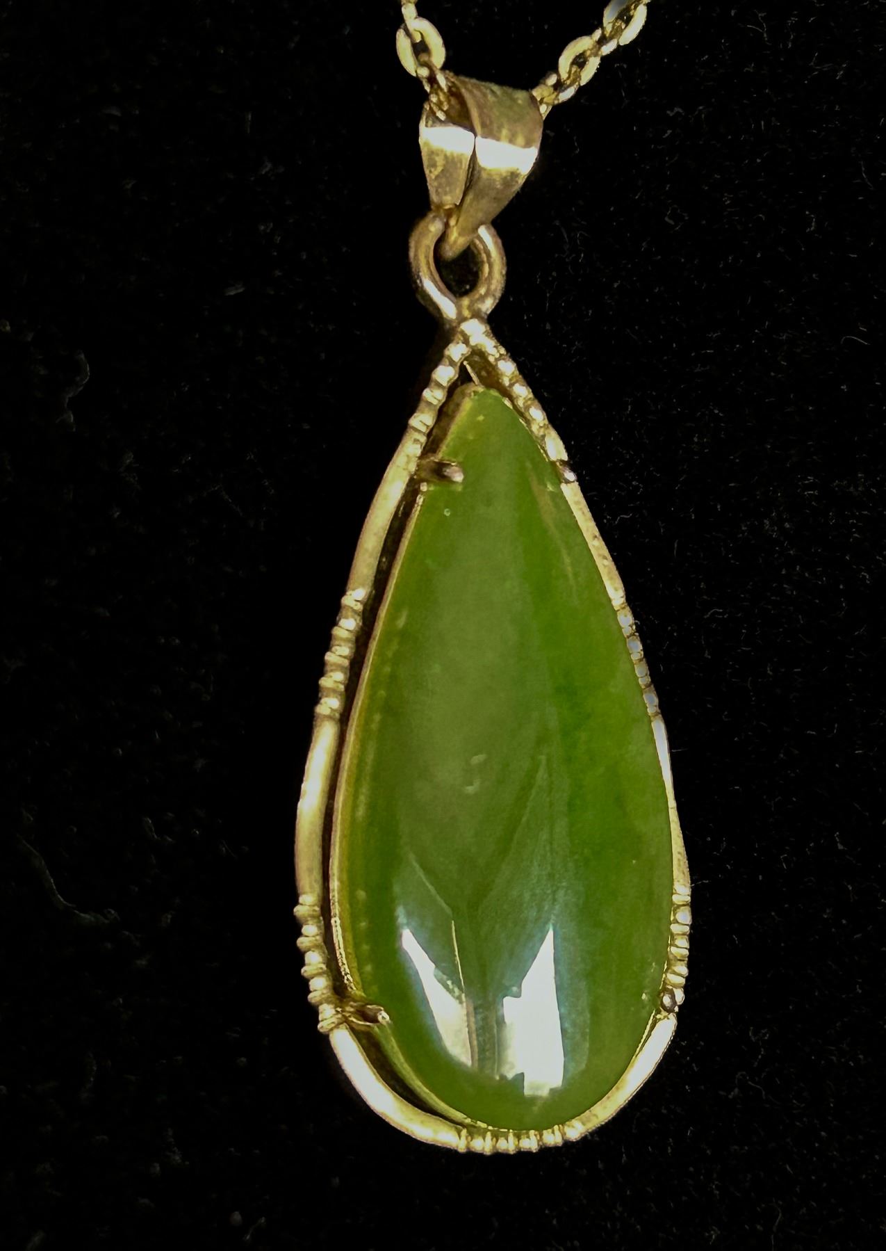Elegant vintage necklace featuring a polished green jade teardrop set in a detailed gold-filled (likely) open-back frame. Marked with a diamond-shaped “NS” maker’s mark. Tarnish-free and in excellent condition