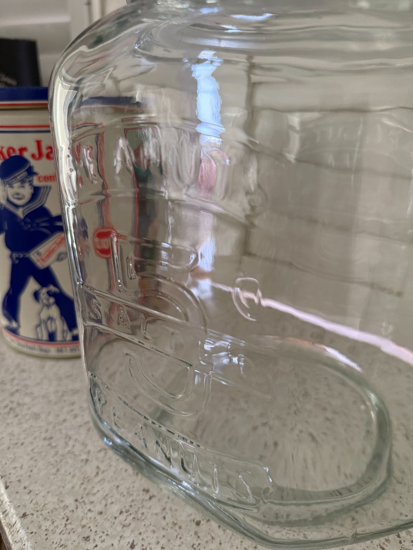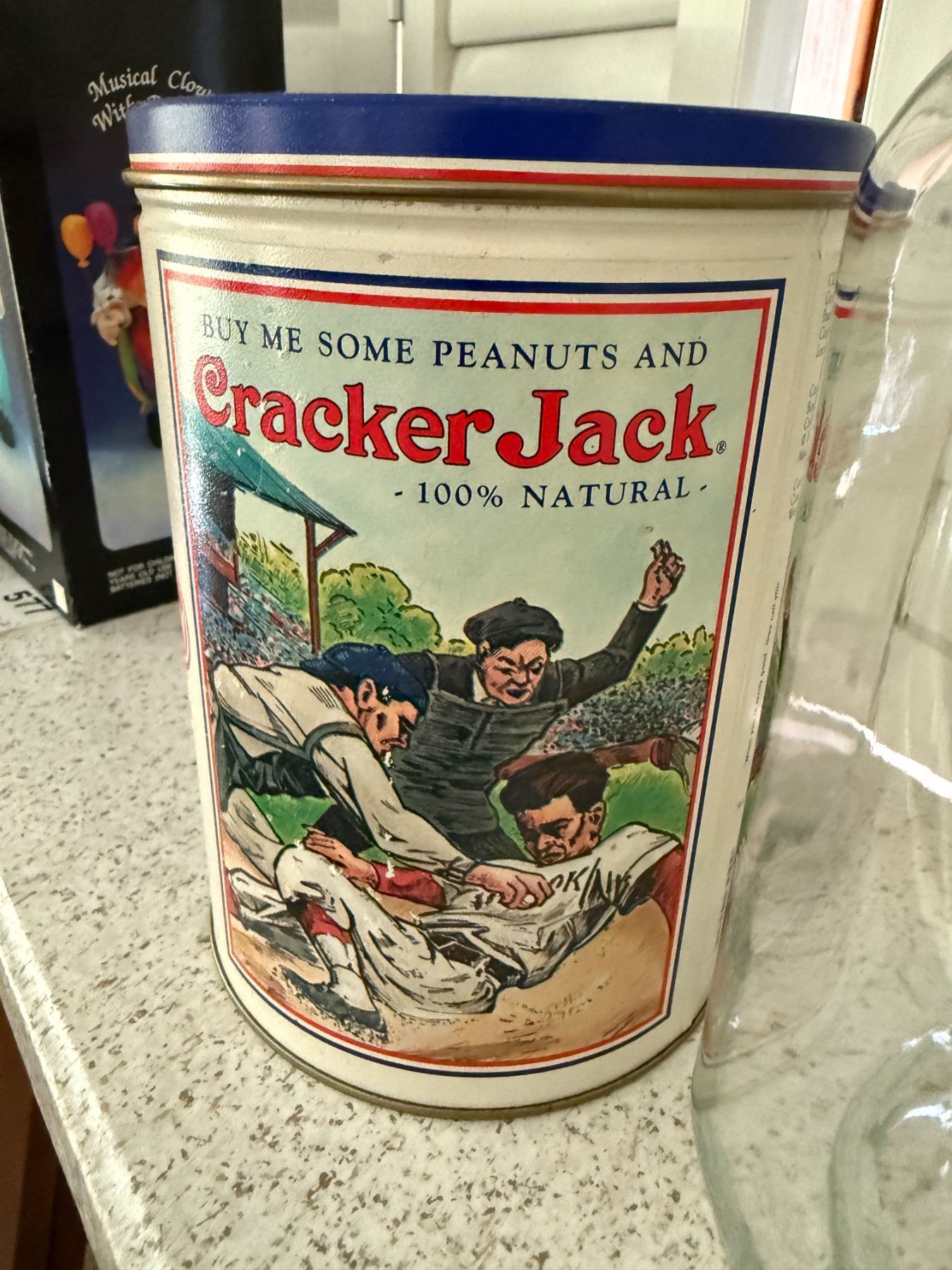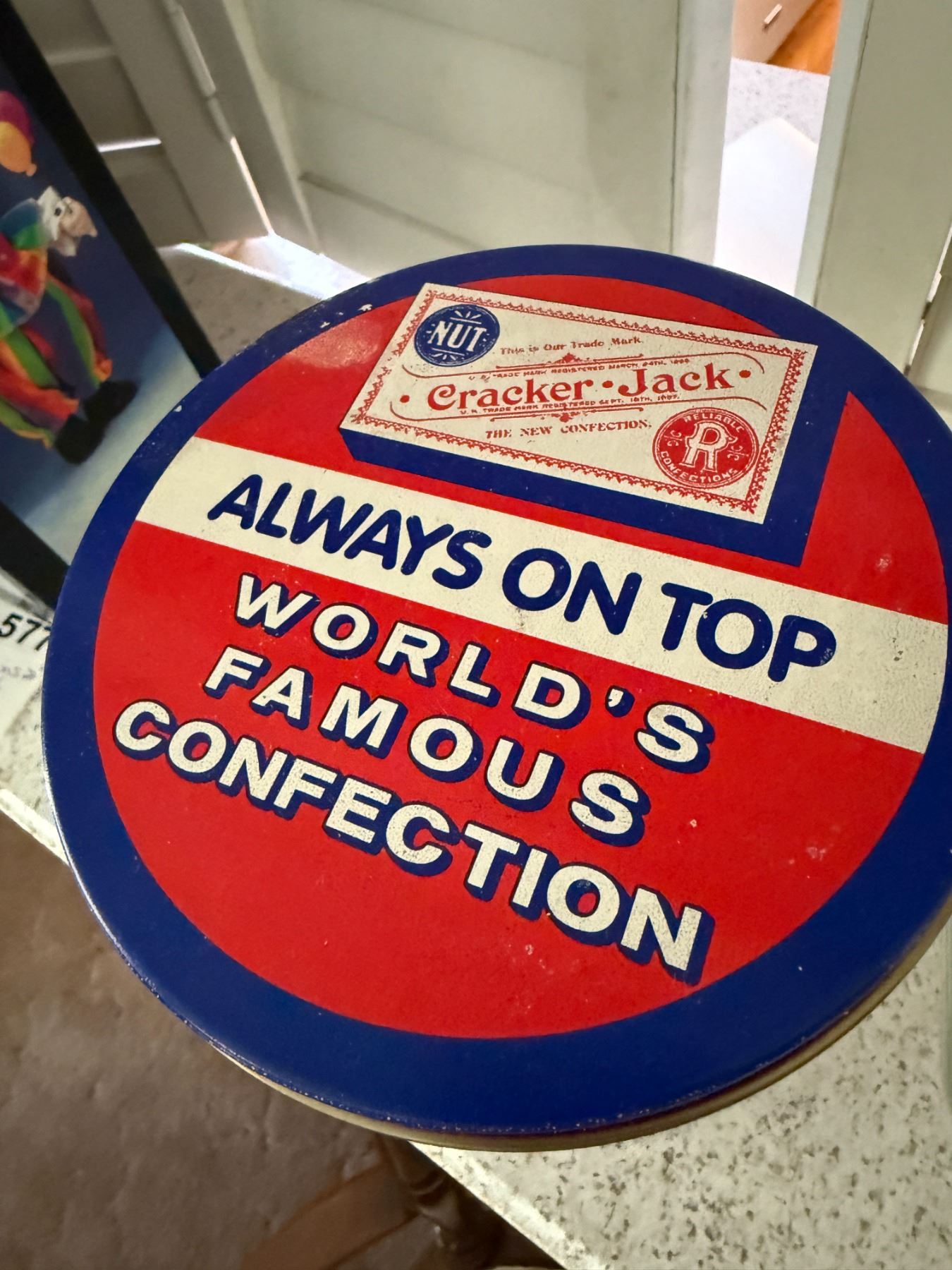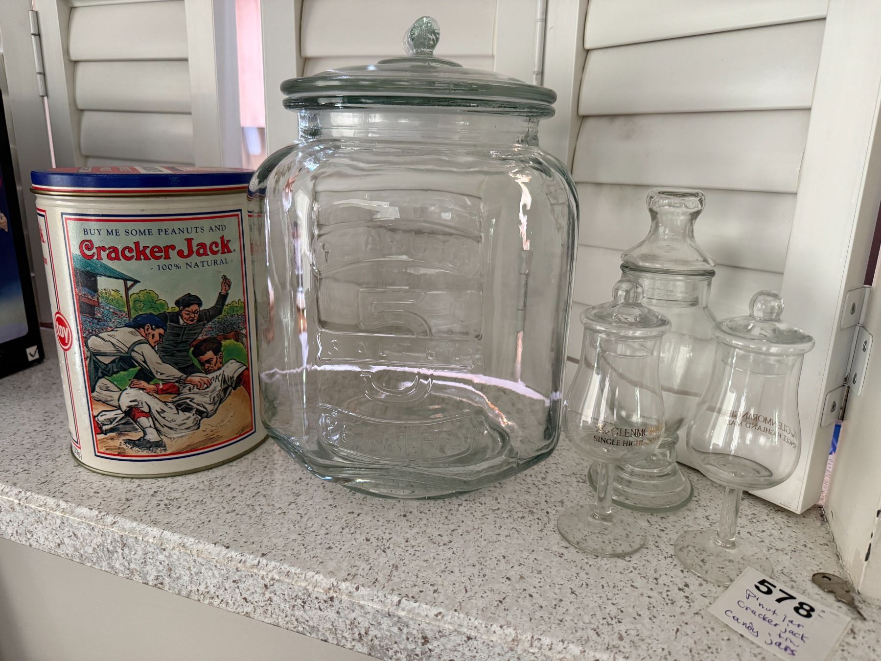 Cracker jack tin, large Peanut glass jar, and candy jars with lids.