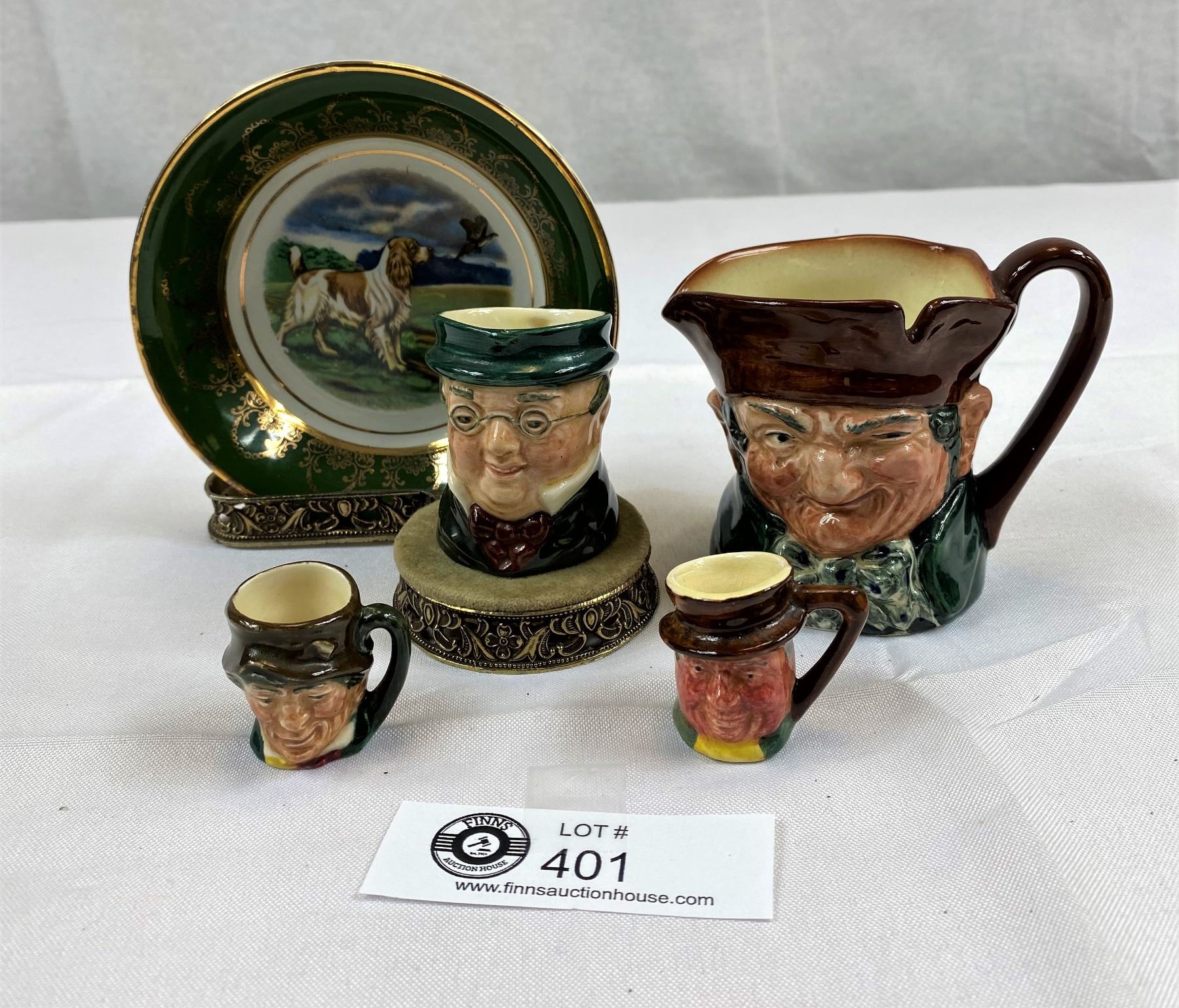 Vintage Toby Mugs And Pin Dish, 3 Royal Doulton, Tallest Is 3.5"