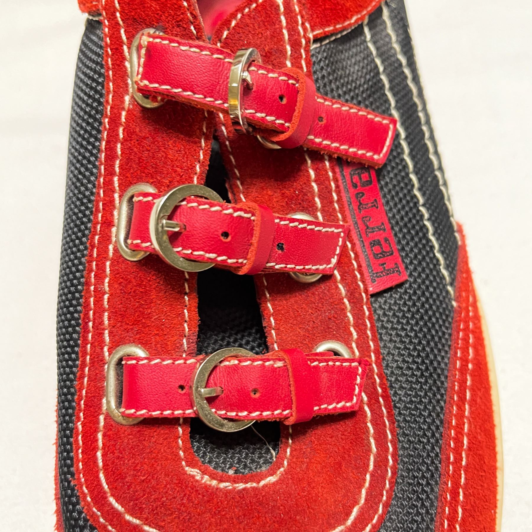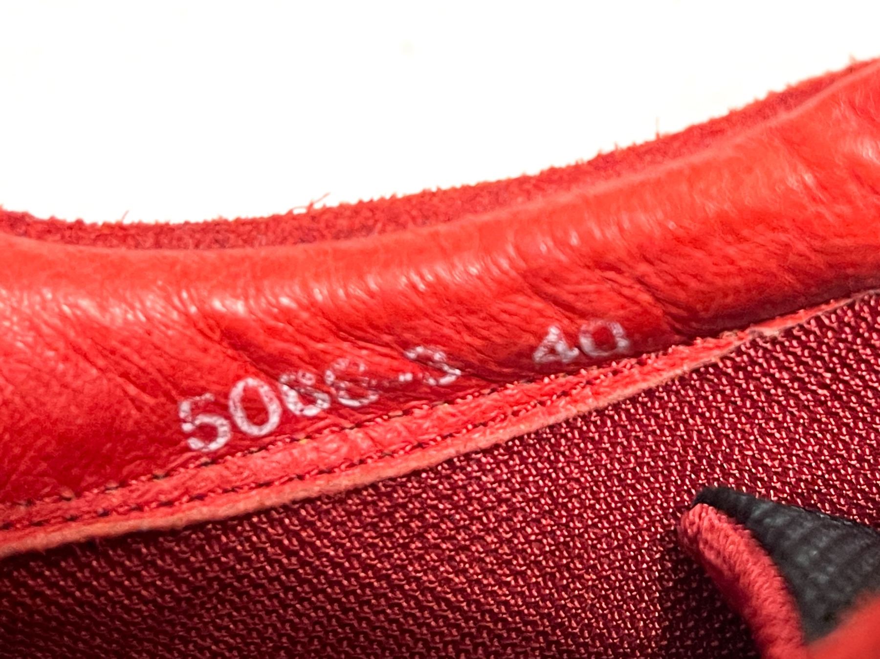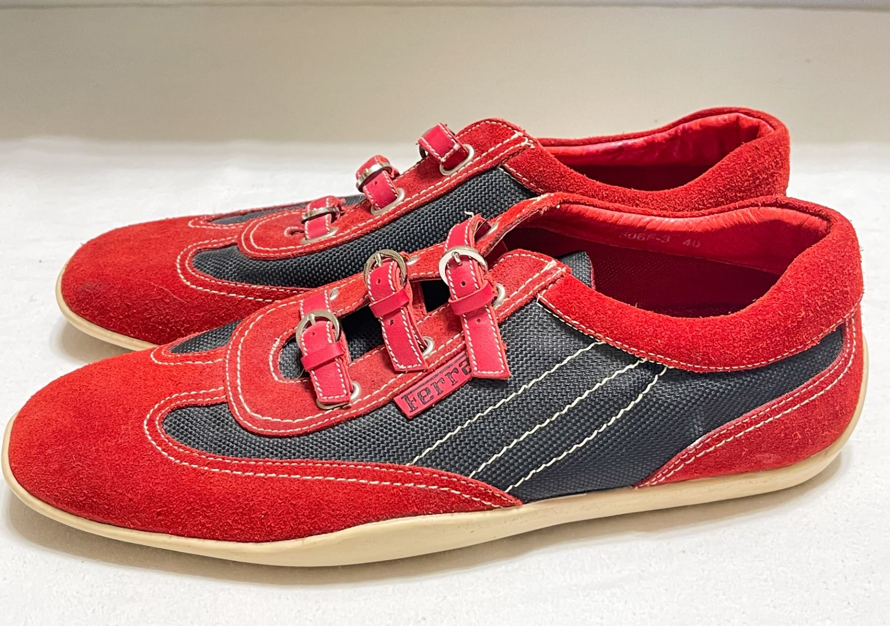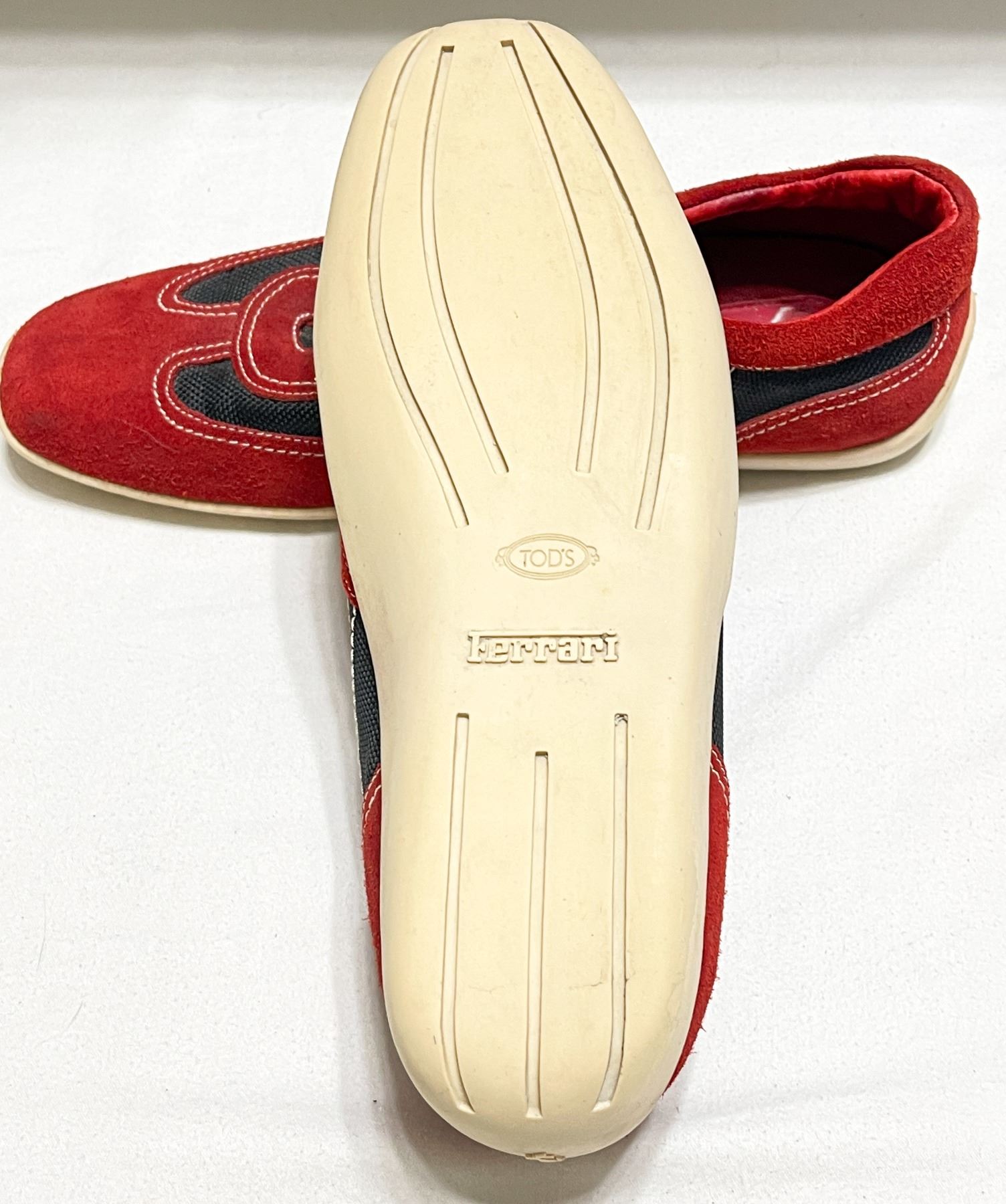 Rare and collectible vintage Tod’s for Ferrari driving shoes, made in Italy from supple red suede with black textured nylon panels and detailed white contrast stitching. The design features triple front buckled straps with polished silver hardware and the Ferrari logo subtly embossed on the side. Marked size 40 (Men’s 7 / Women’s 9), they remain in excellent pre-owned condition with minimal wear.