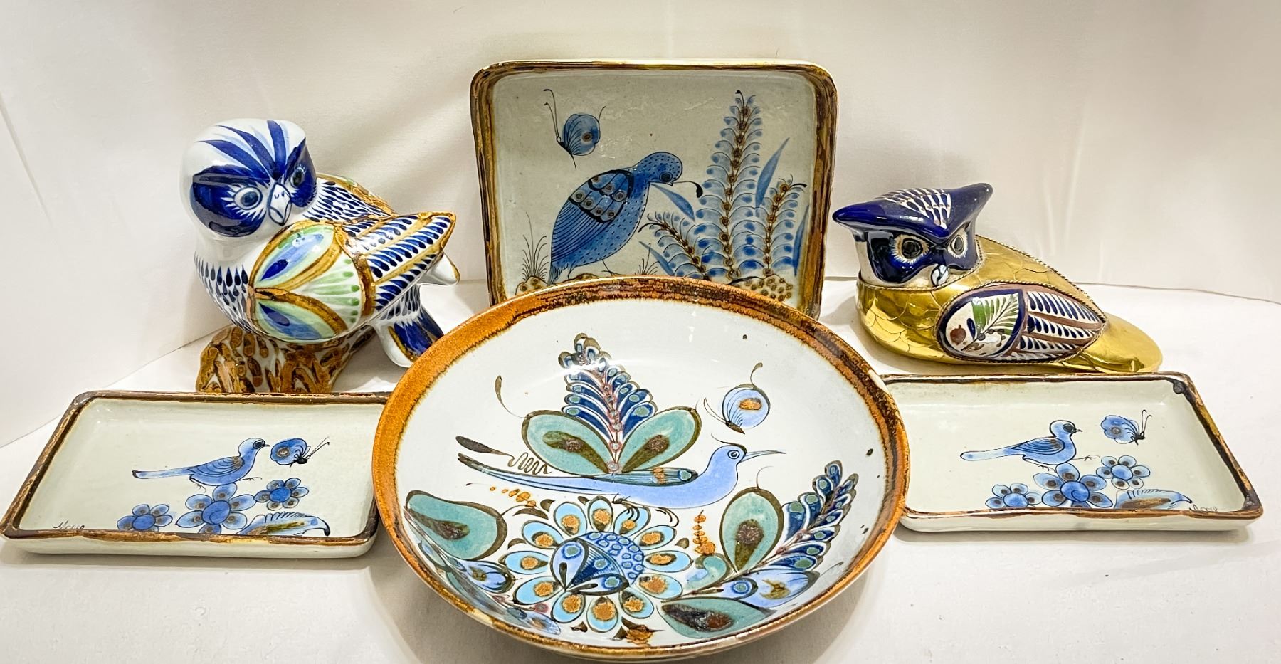 Charming collection of vintage Tonalá pottery from Mexico, featuring several hand-painted pieces in the classic bluebird motif attributed to Ken Edwards (KE) and T.M. Mexico. The lot includes a beautifully decorated large bowl, matching rectangular trays, and a square tile, each signed and showcasing intricate folk-art bird and floral designs. Also included are two hand-painted owl figurines with rich cobalt, gold, and green glazing—excellent examples of Mexican artisan pottery blending traditional and mid-century design influences.