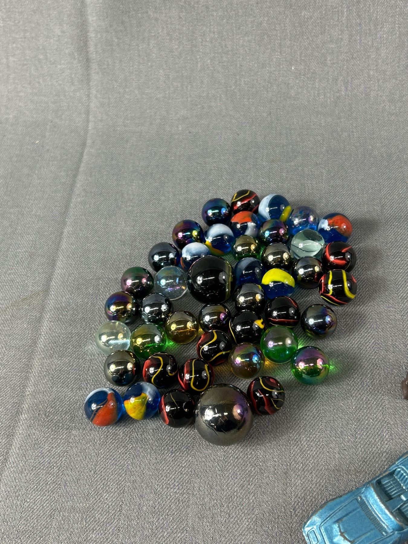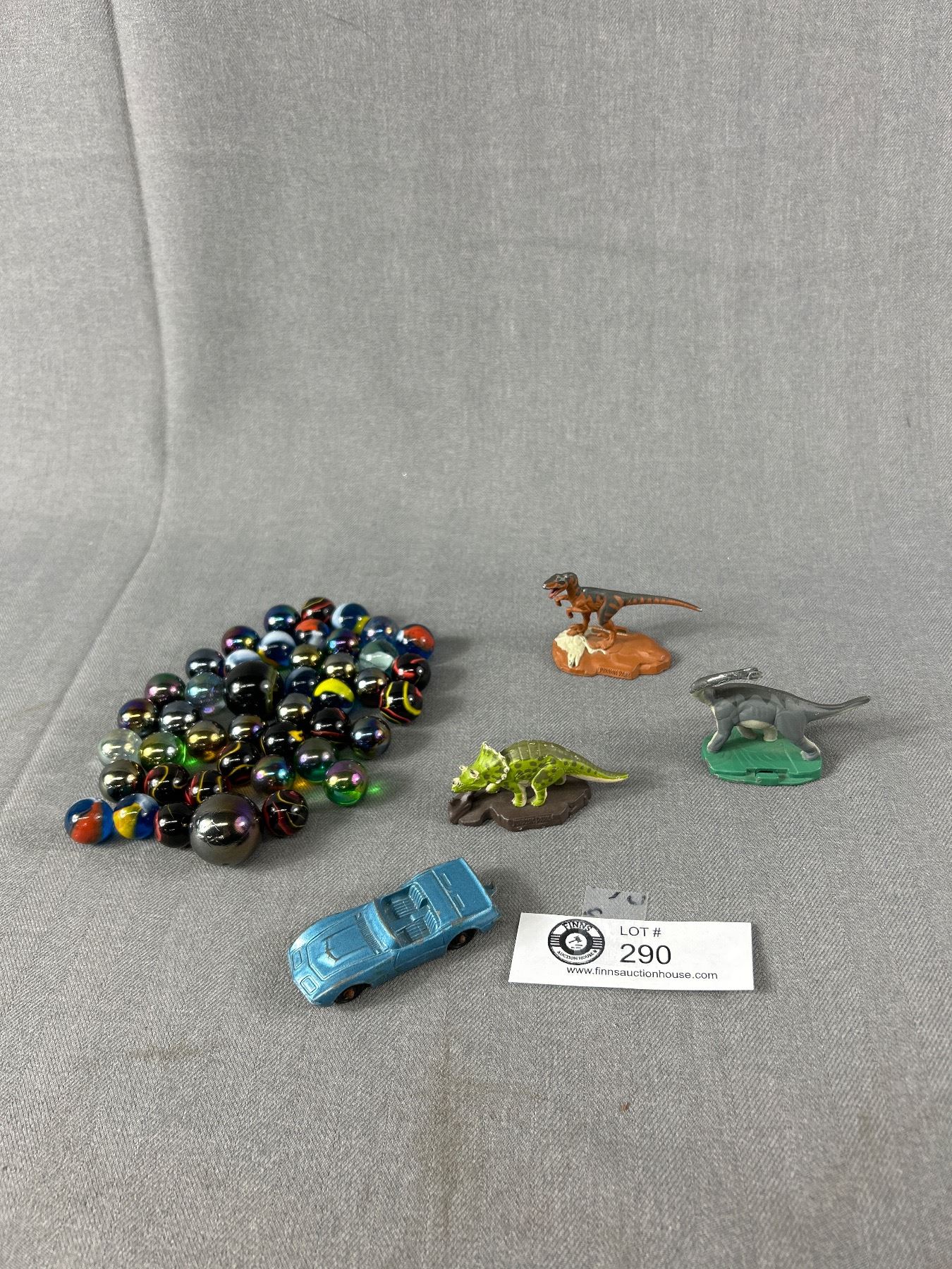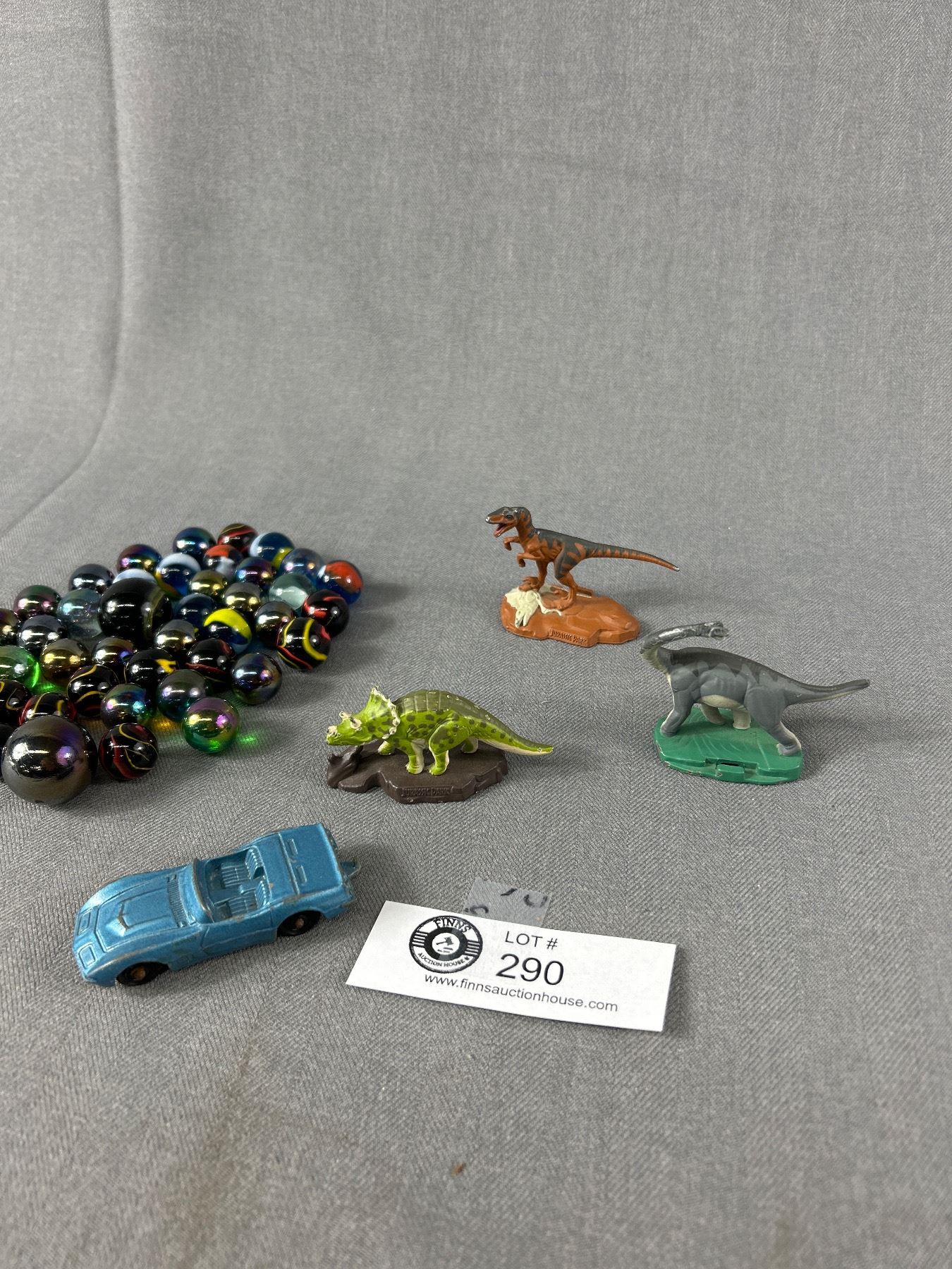 Vintage Tootsie Toy Car,3 Vintage Metal Jurassic Park Dinosaurs and Vintage Marbles