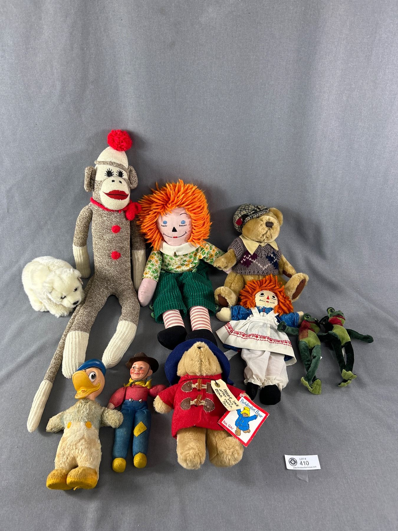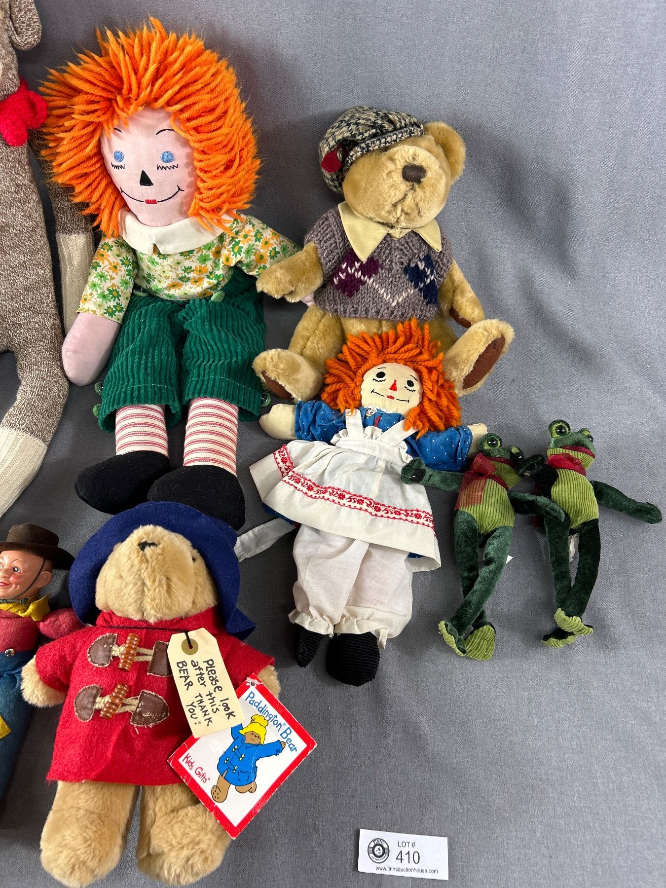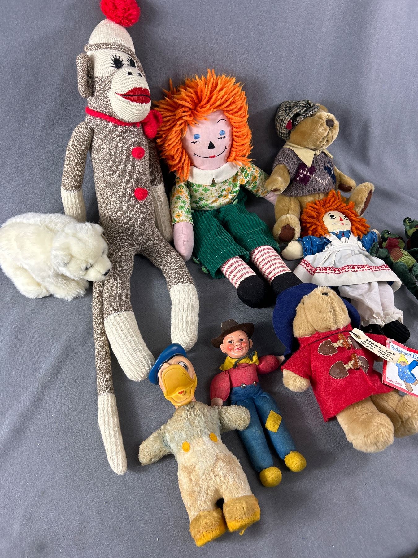 Vintage Toy Lot Including Raggedy Anne, Raggedy Andy, Sock Monkey, Paddington Bear & More