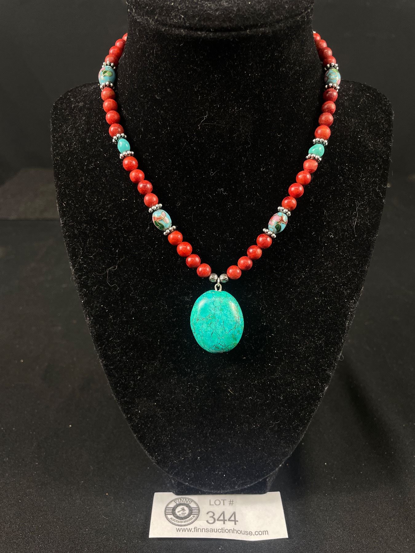 Vintage Turquoise Coral & Cloisonne Beads with Pendant Necklace 14.5" Length