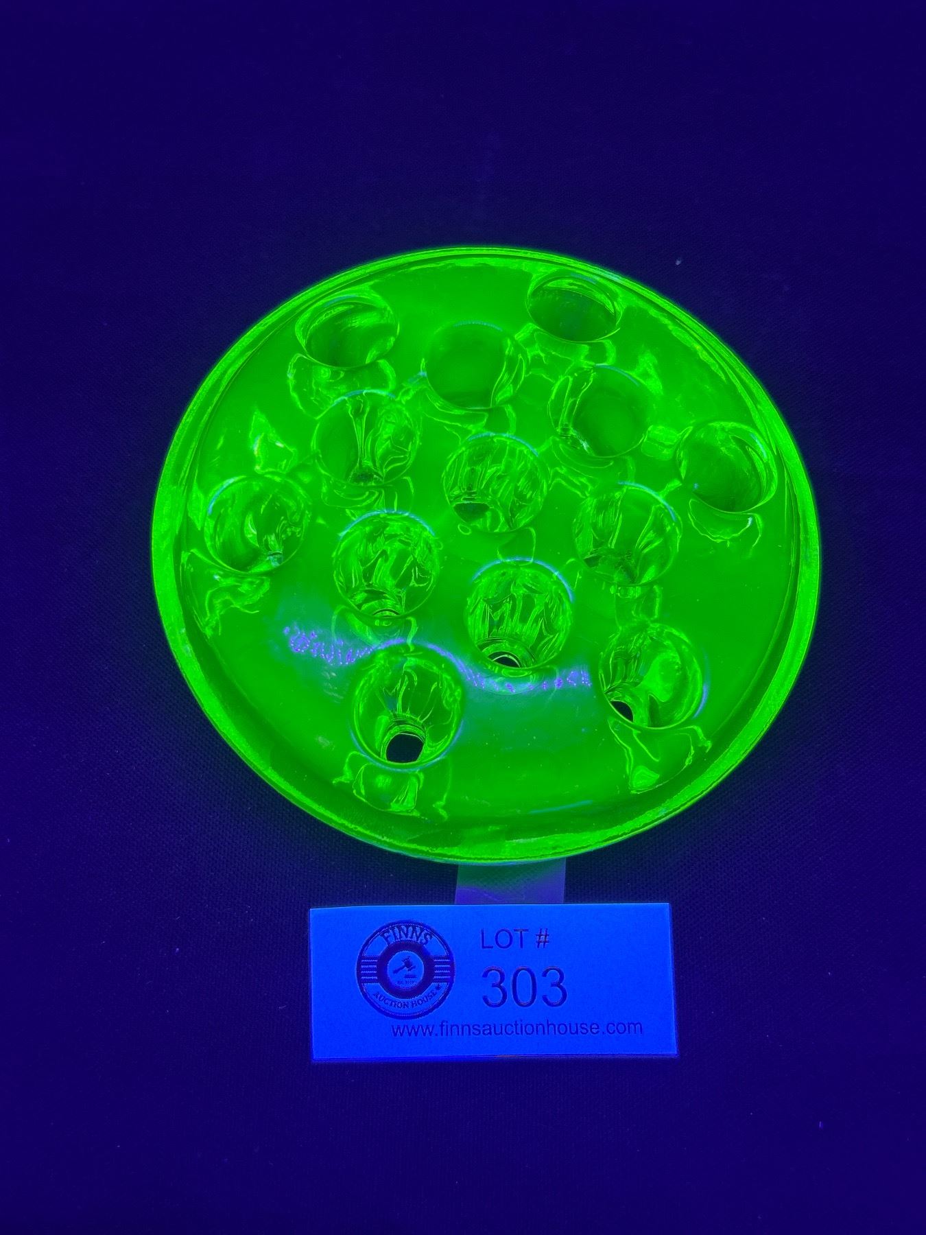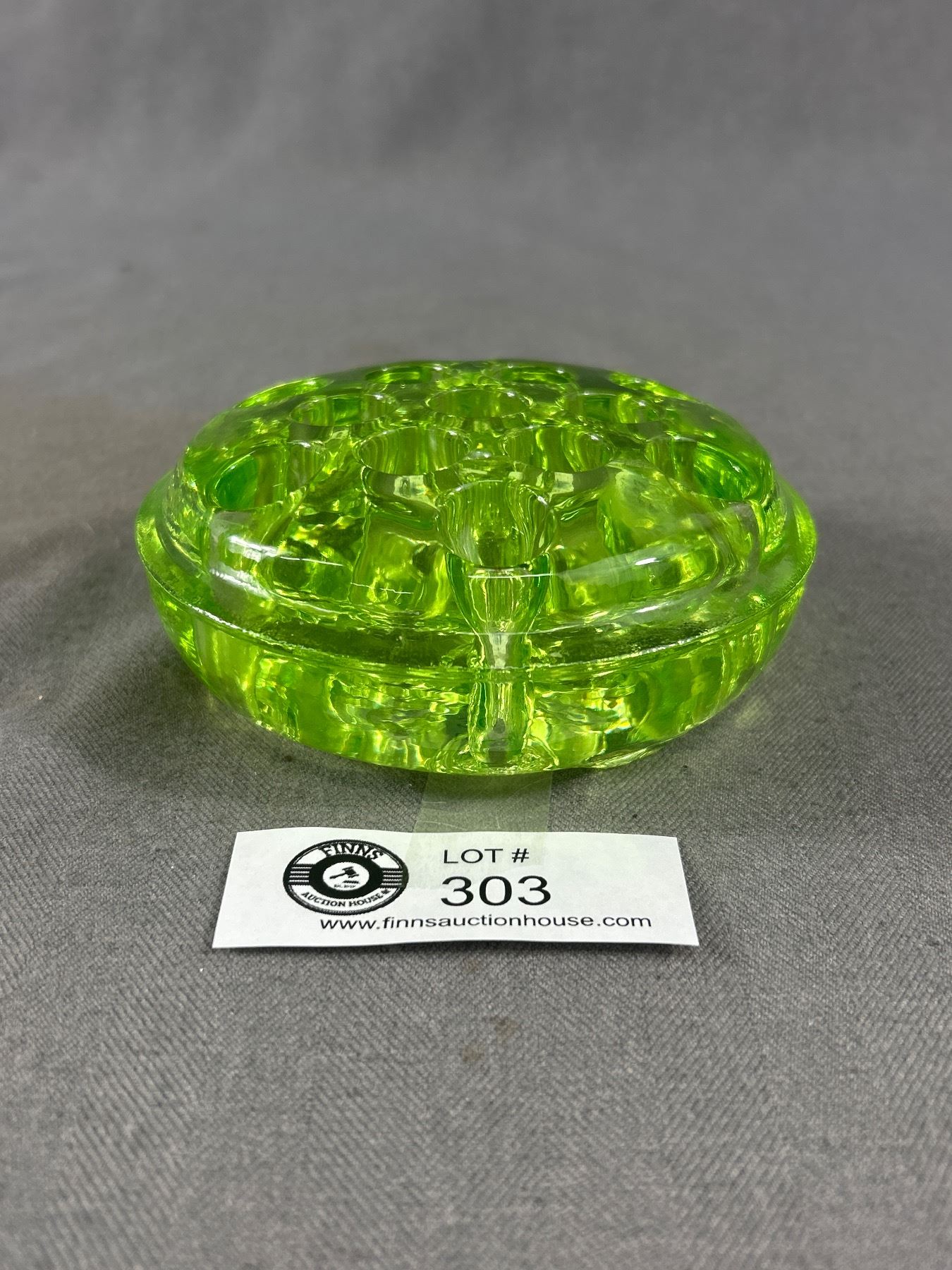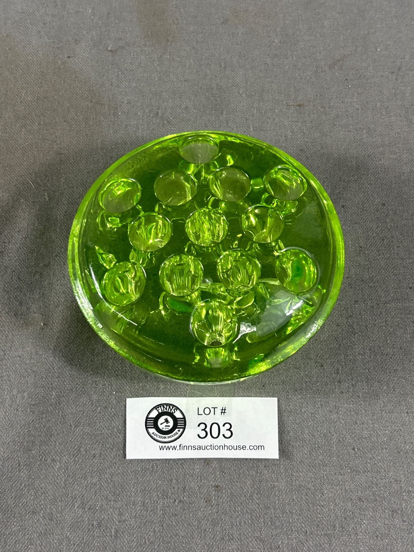 Vintage Uranium Glass Frog For Flower Arranging. Approx. 4.5" Diam. X 1.5"H