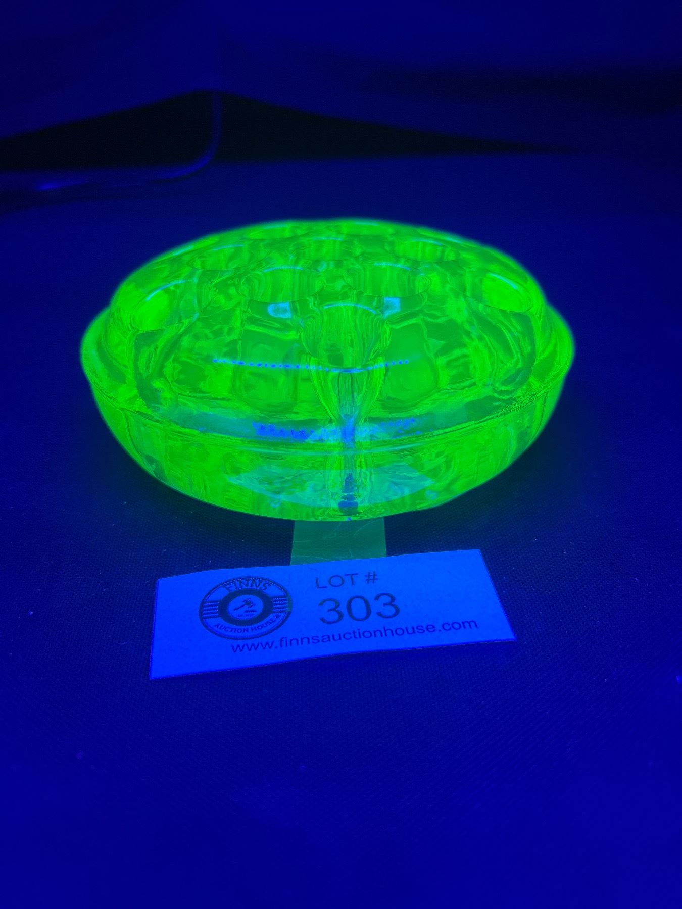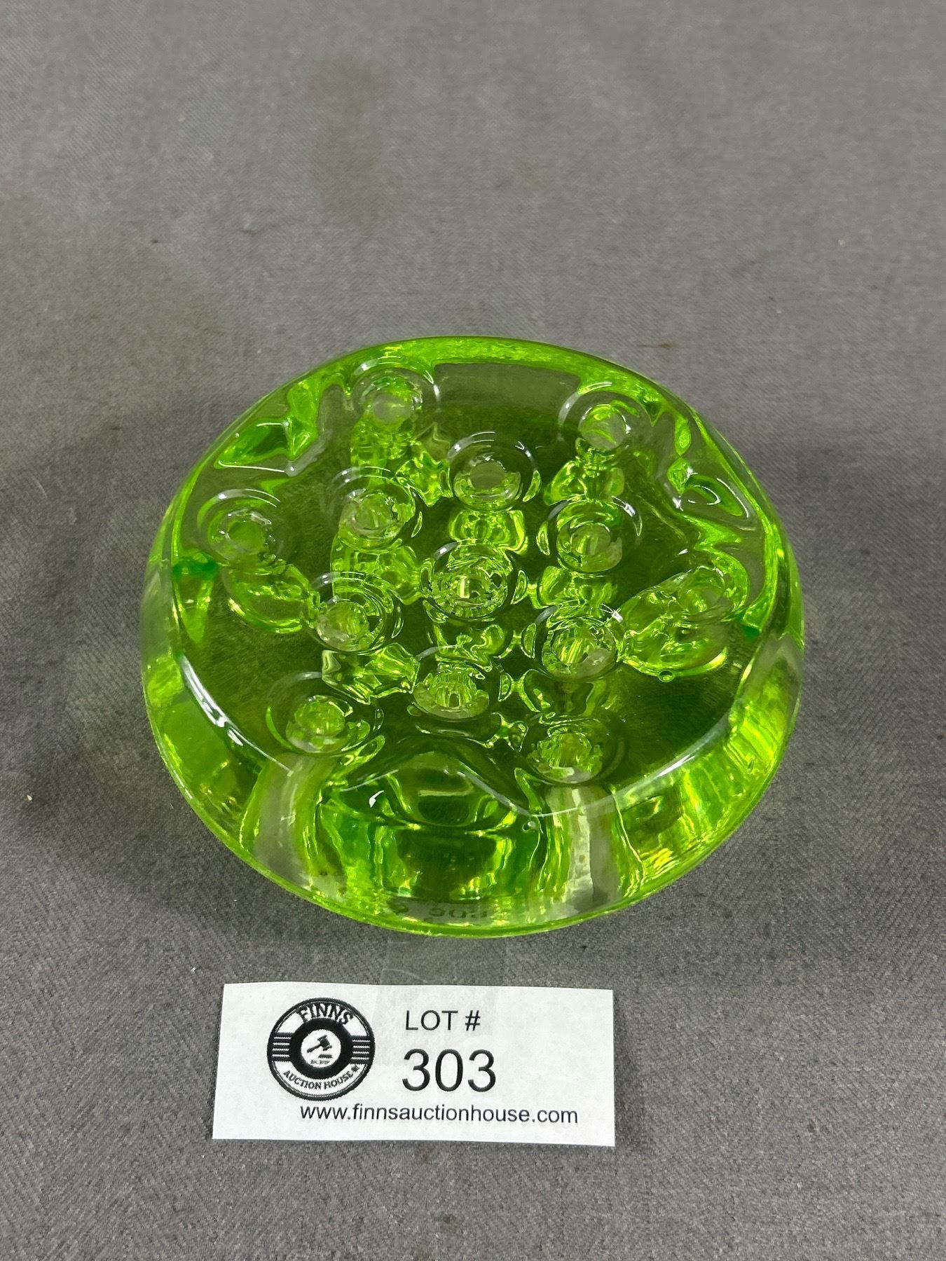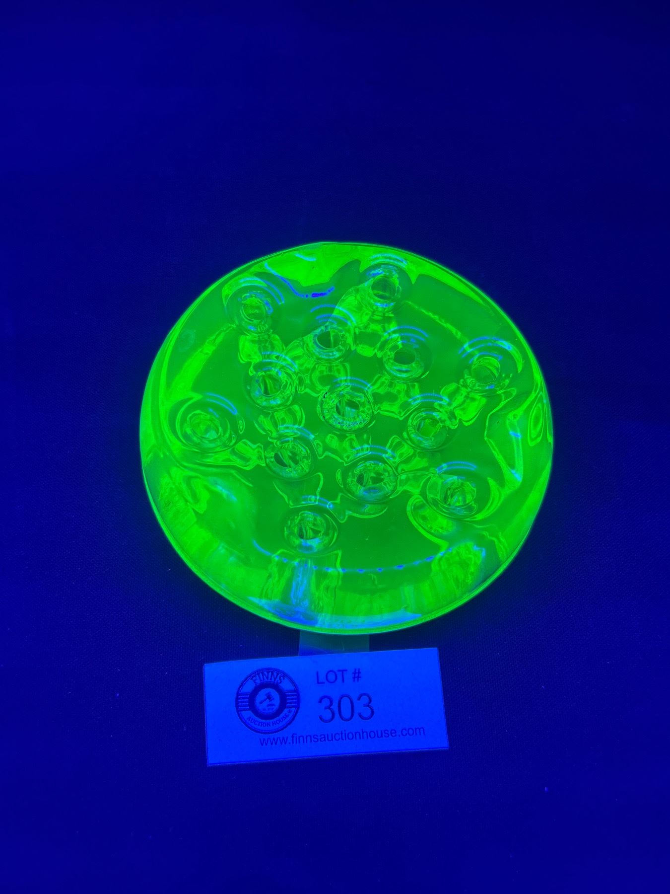 Vintage Uranium Glass Frog For Flower Arranging. Approx. 4.5" Diam. X 1.5"H