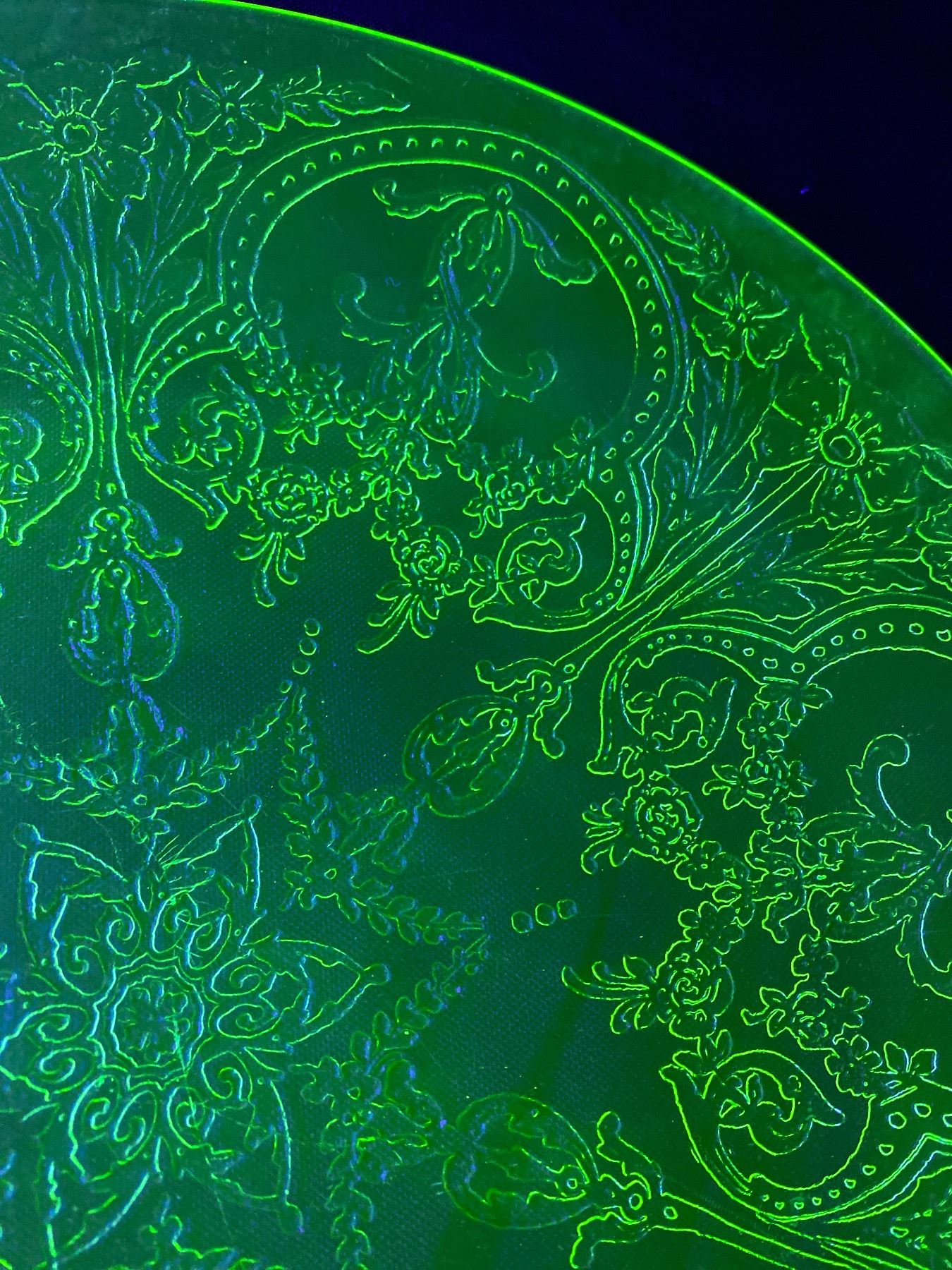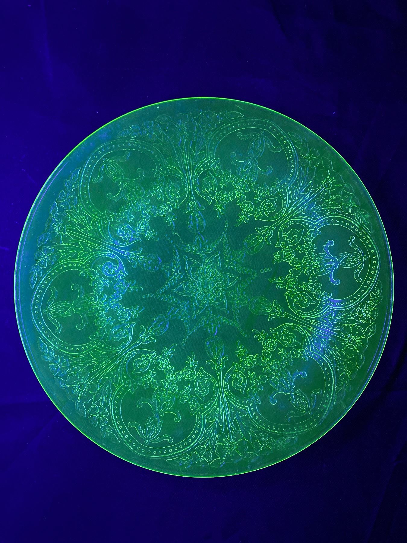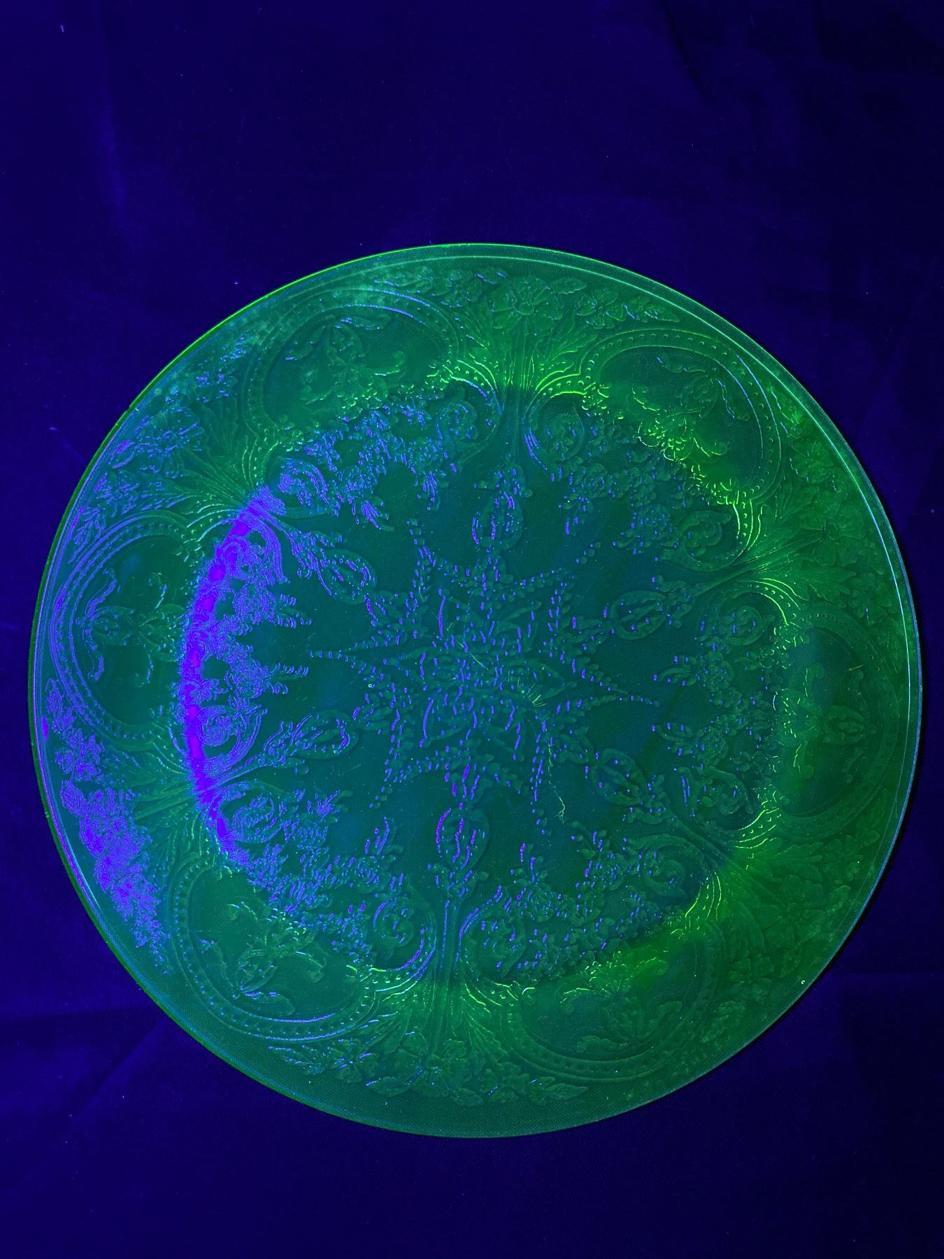 Vintage Uranium Glass Plate w/ Raised Design. Approx. 11" Diam