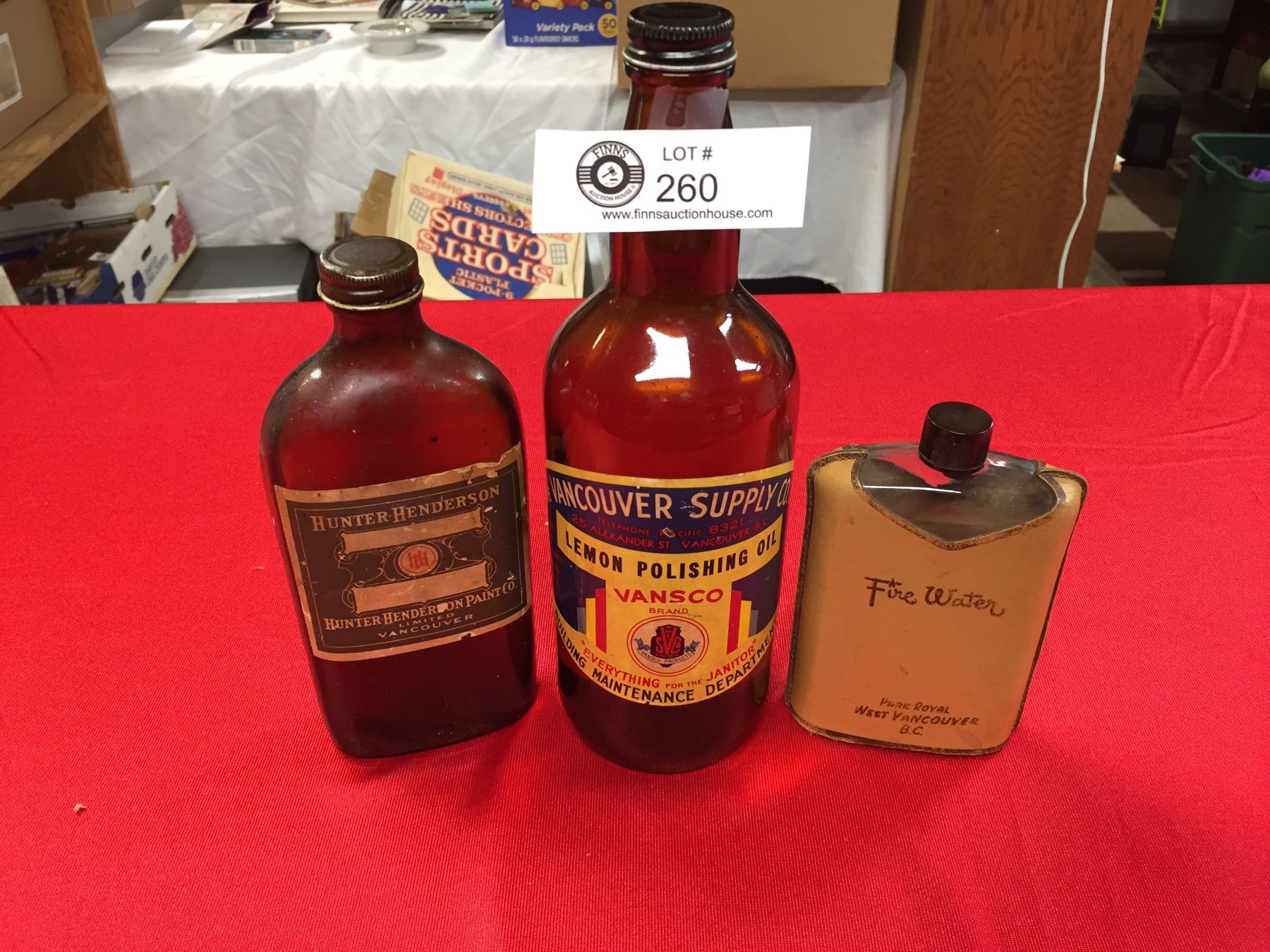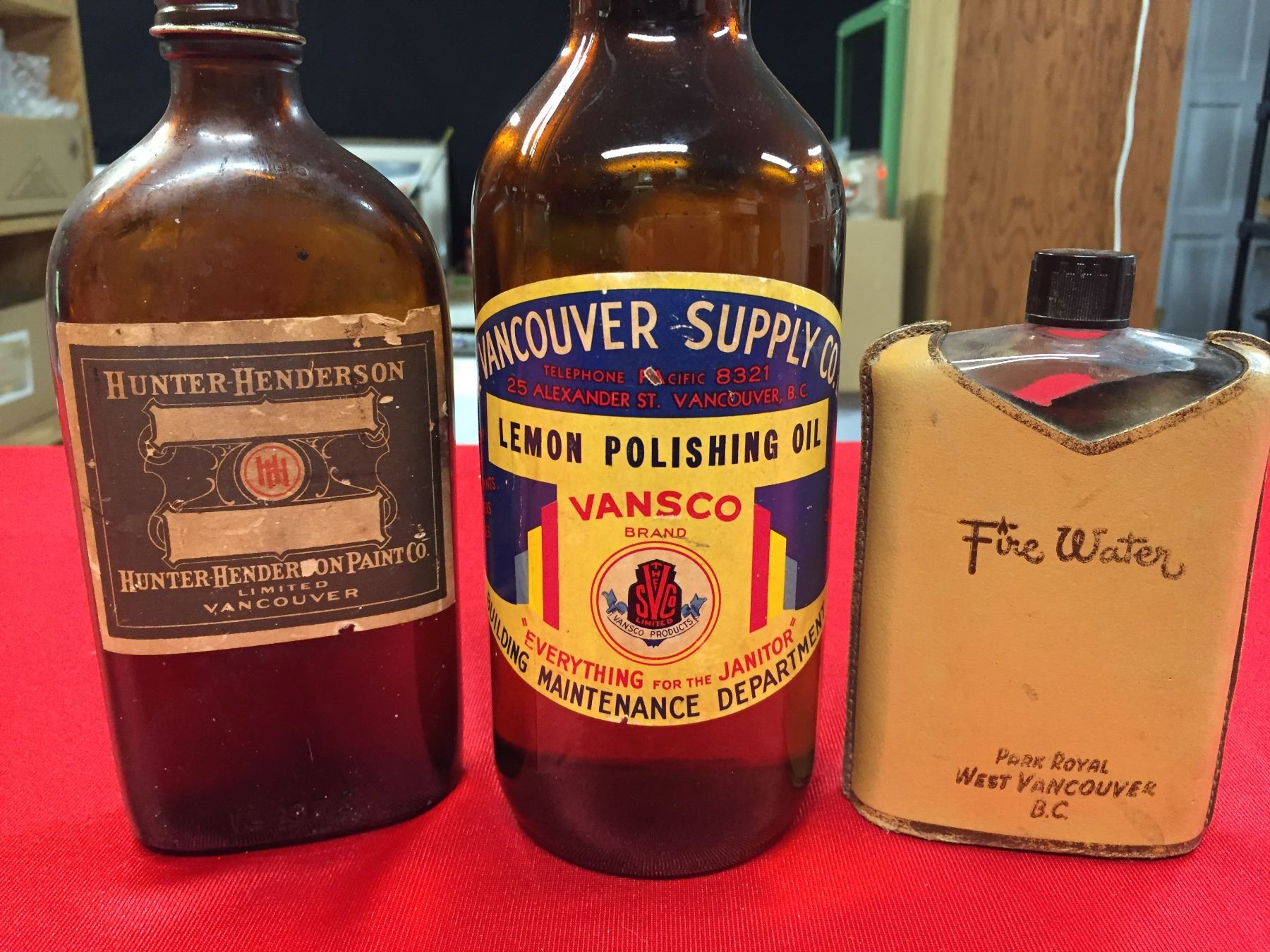 Vintage Vancouver Bottles. Park Royal, West Vancouver Fire Water Bottle,Vancouver Supply Company Lemon Polish Oil bottle and a Hunter Henderson Vancouver Limited Bottle