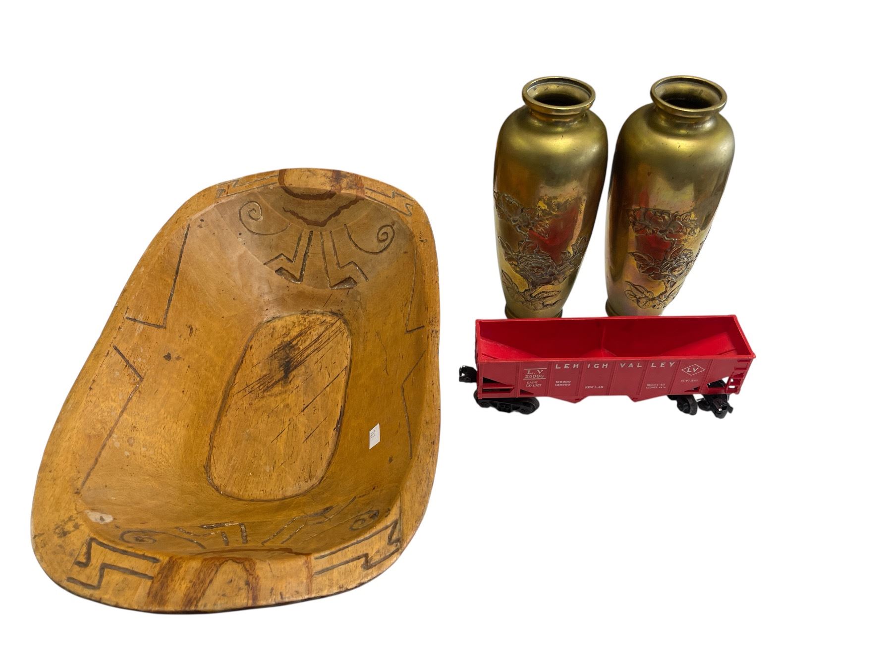 Vintage Variety: Brass Vases, Wooden Dough Bowl, & Train Car