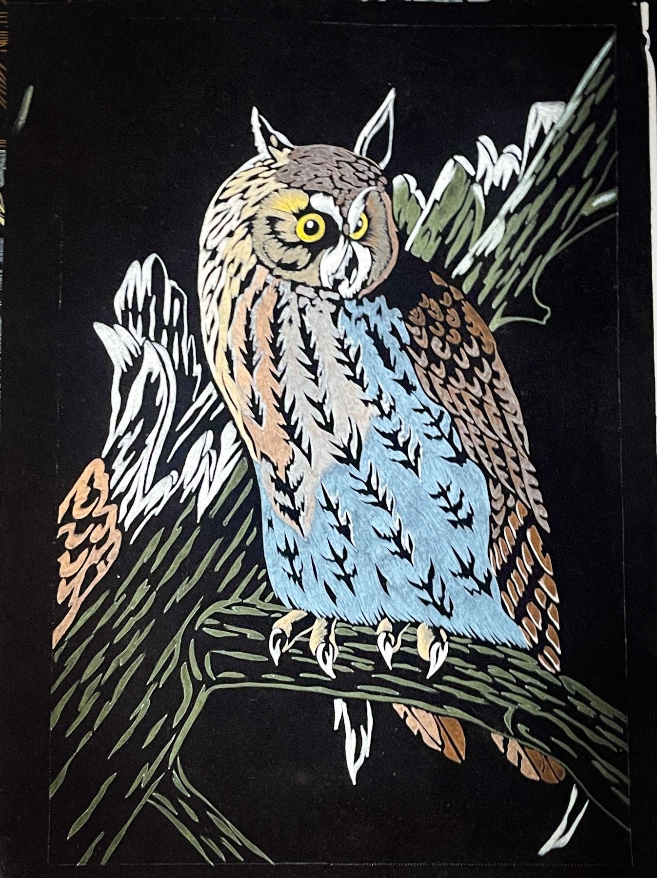 Striking vintage hand-painted velvet artwork depicting an owl perched on a tree branch, rendered in soft natural tones of brown, blue, and green against a rich black velvet background. The detailed feather patterning and glowing yellow eyes capture a lifelike yet stylized mid-century aesthetic. Light surface dust and minor edge wear from previous framing, consistent with age. Measures approximately xxx" x xxx".