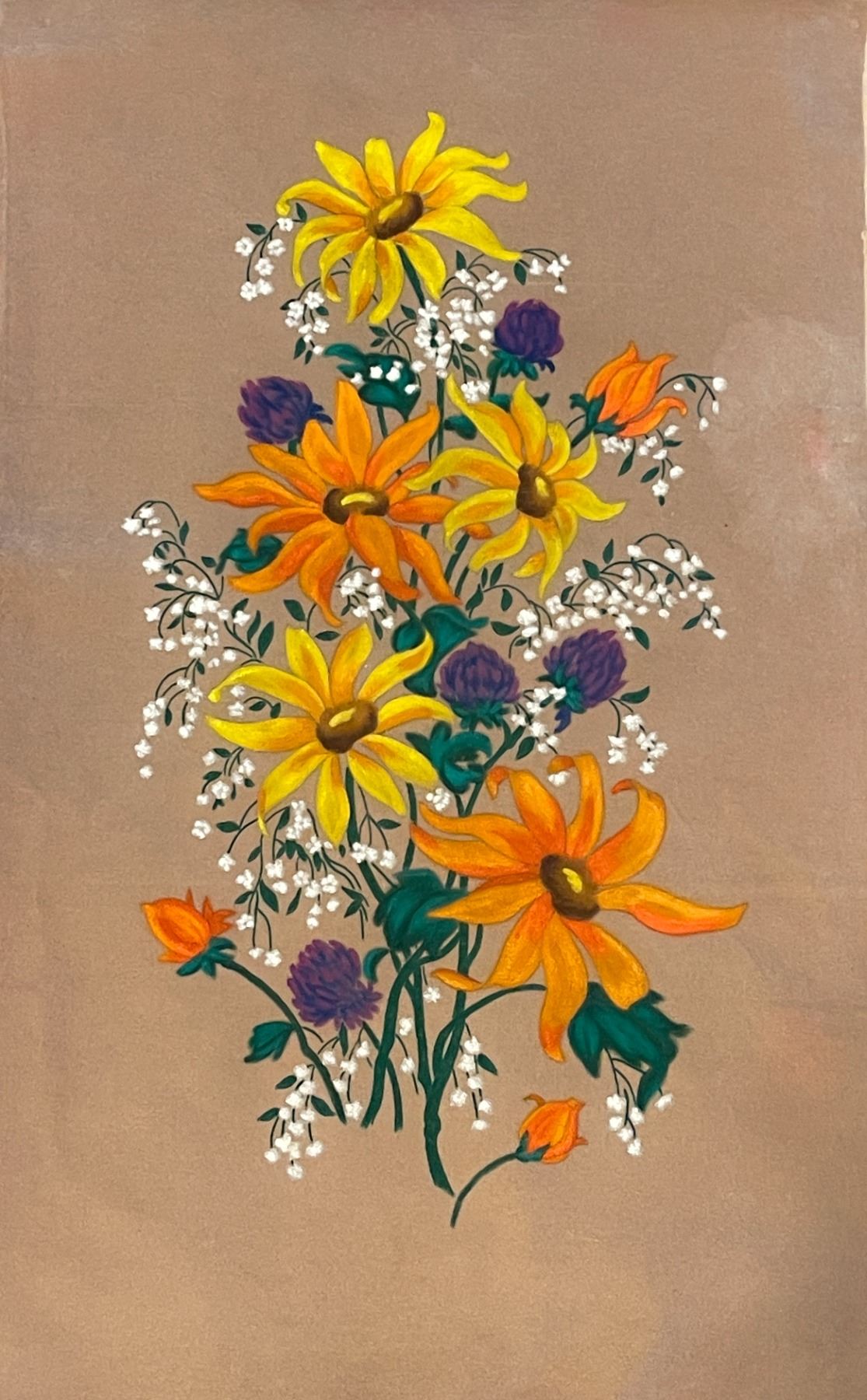Charming vintage hand-painted velvet artwork featuring a vibrant bouquet of wildflowers in warm yellow, orange, and purple tones against a soft beige background. The rich texture and cheerful palette make it ideal for a boho-inspired space, vintage décor, or a gender-neutral nursery. There is a faint pinkish mark in the upper right quadrant and light edge wear consistent with prior stretching, but overall displays beautifully. Measures approximately 22" x 34".
