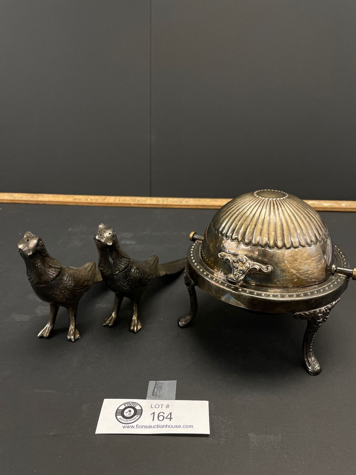 Vintage Viking 69 Lead Pheasant Figural Salt & Pepper Shakers and Silver Plated Antique Butter Dish