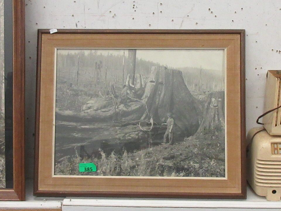 Logger and giant stump. Framed dimensions: 20" x 25"