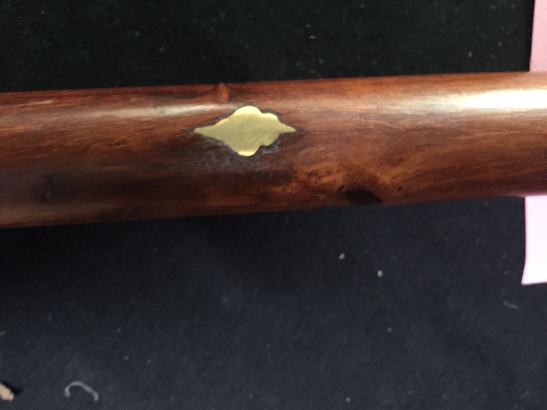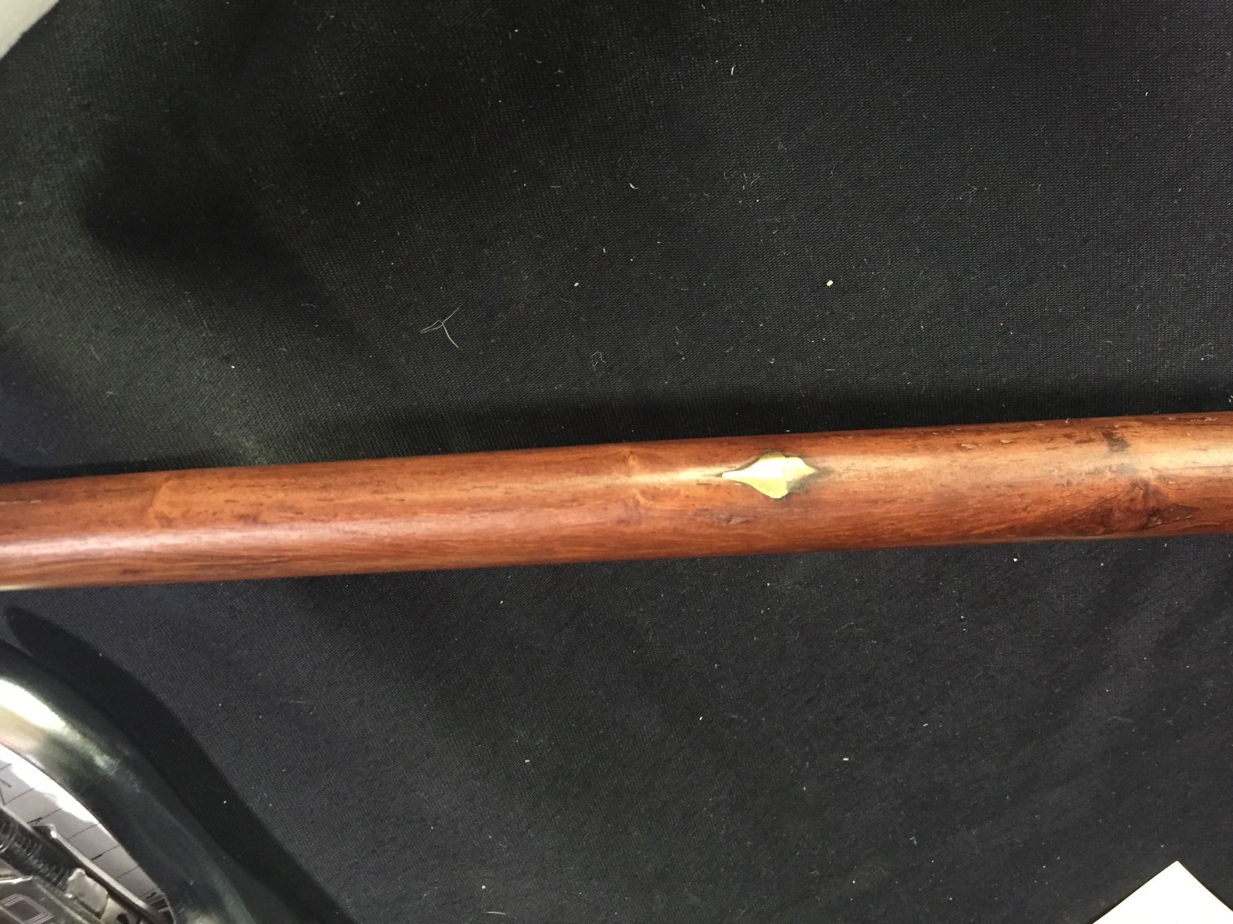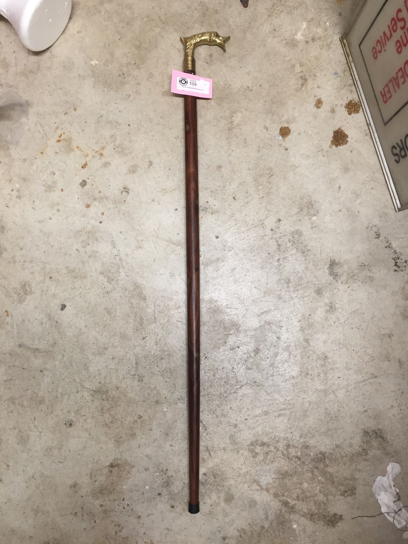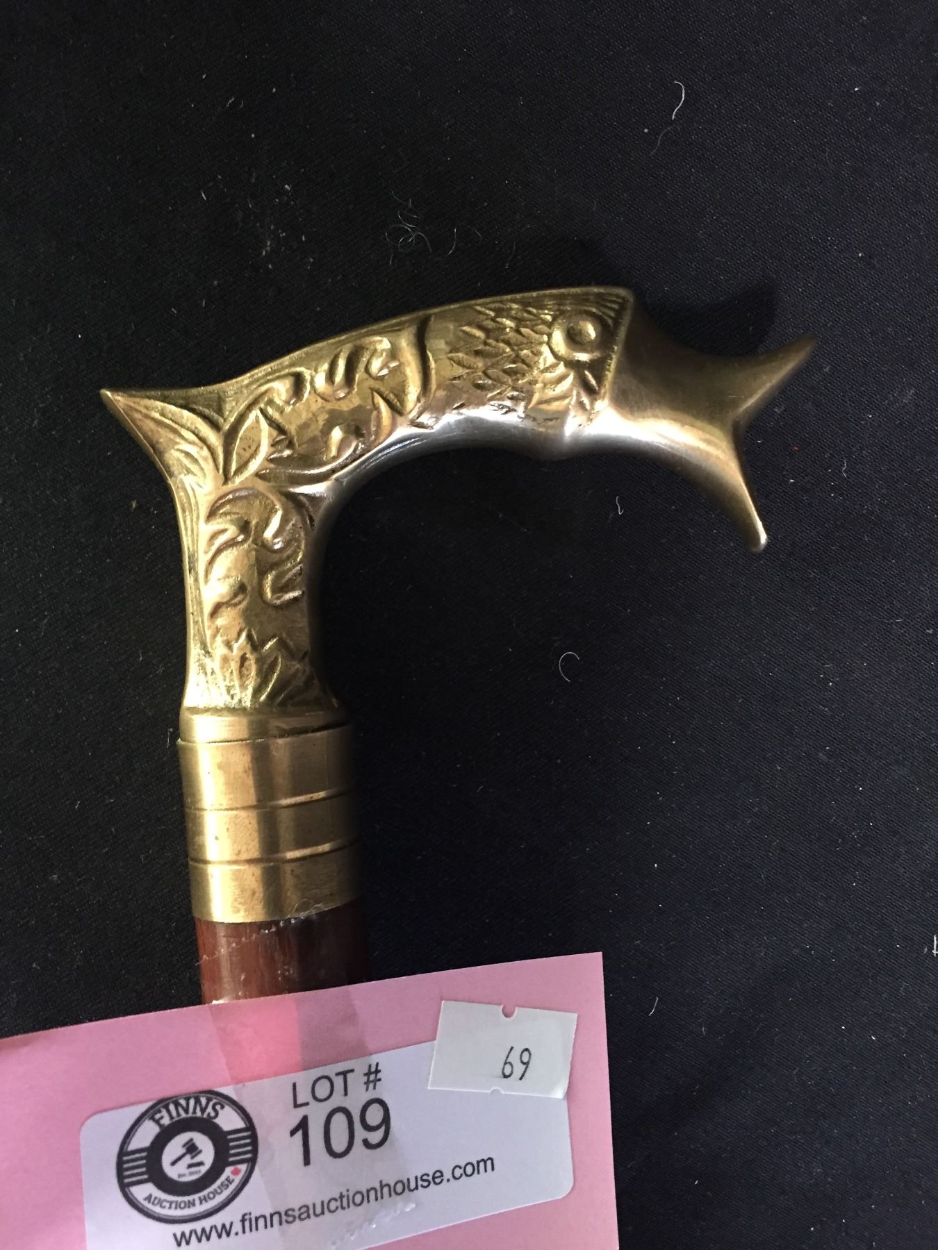 Vintage Walking Cane with Brass Fish Handle and Brass Inlays 37.5" In Very Good Condition