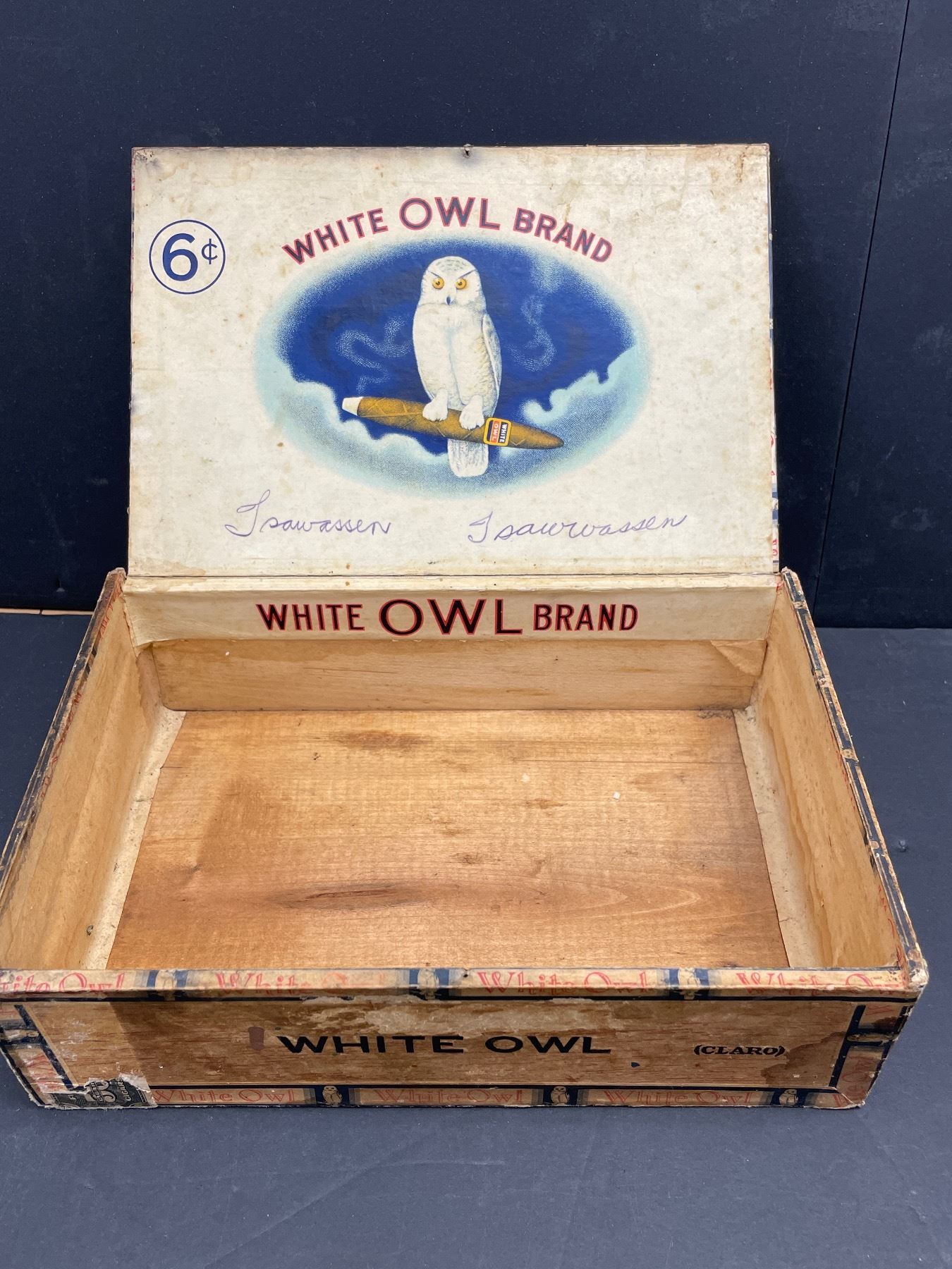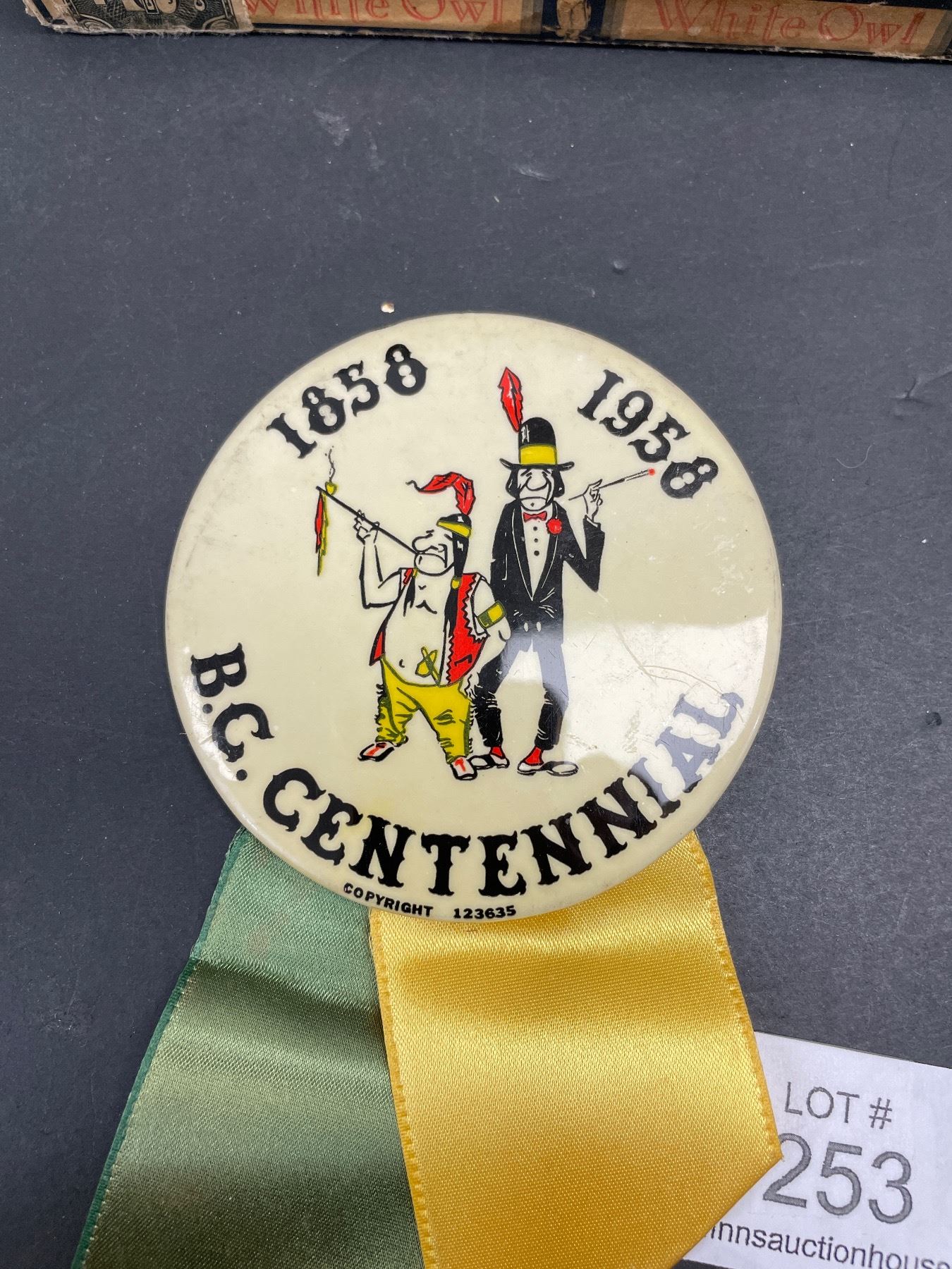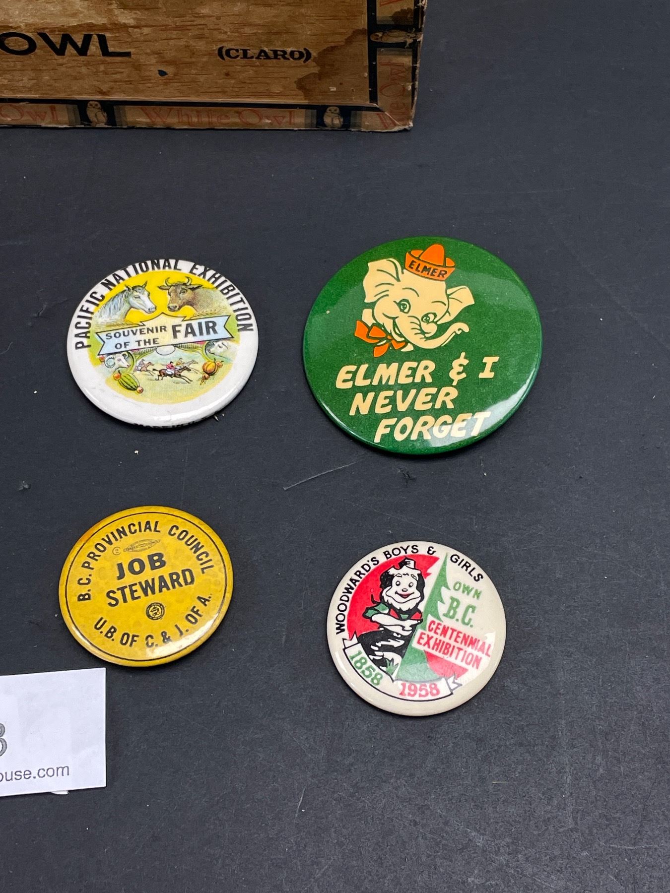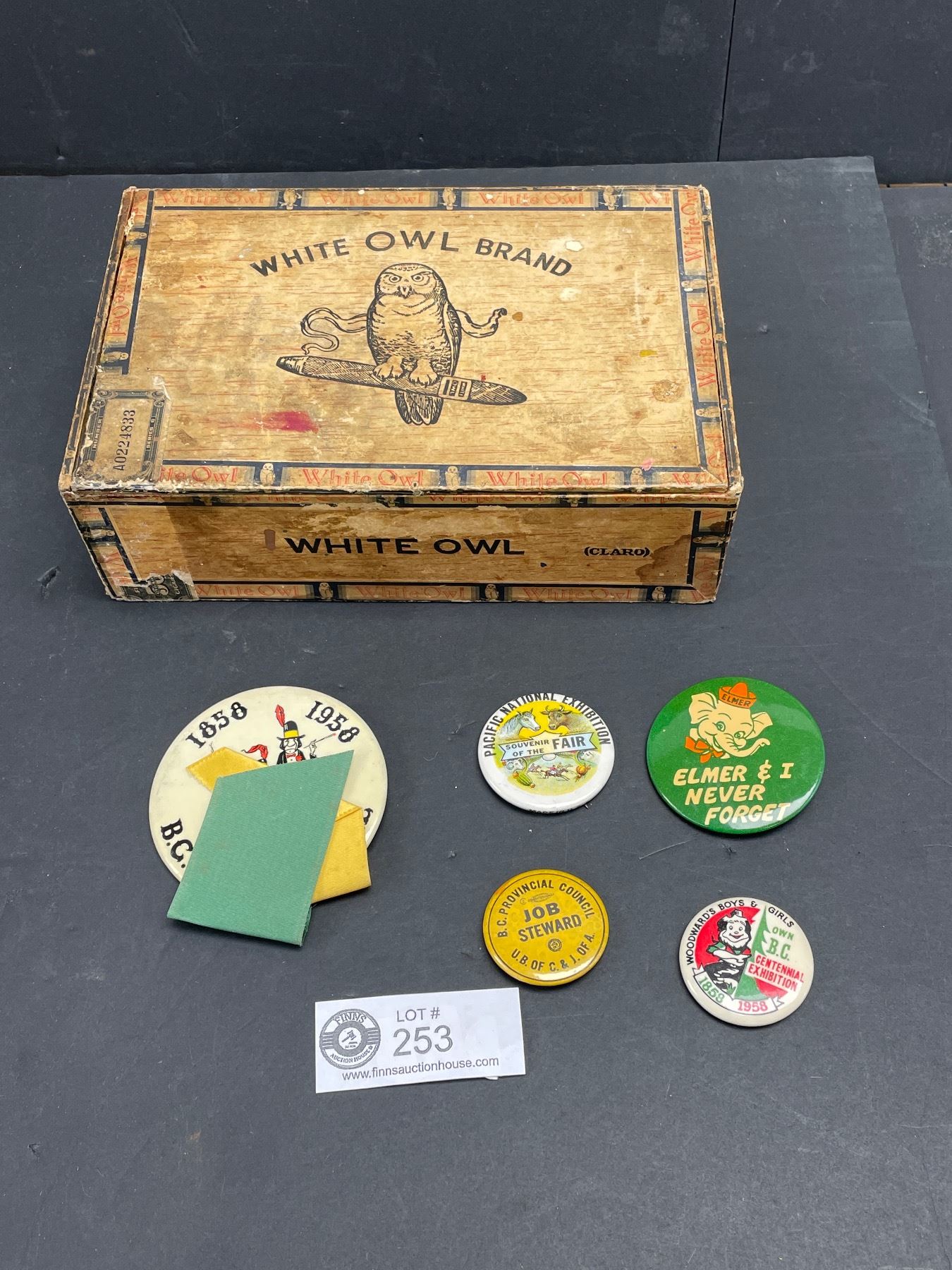 Vintage "White Owl" Cigar Box with An Early PNE Badge, Woodward's 1958 BC Centennial Badge, Early BC Union Pin and Elmer's Wood Glue Advertising Badge 1970s