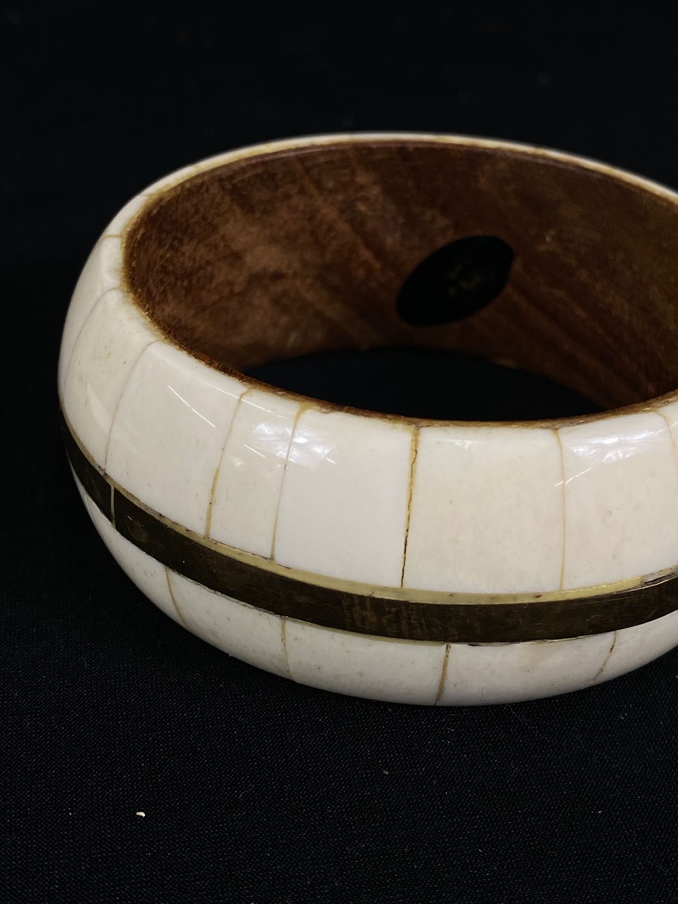 Vintage Wide Bone Cuff Wood Bracelet with Brass Trim - Original Sticker Inside - Very Good Condition