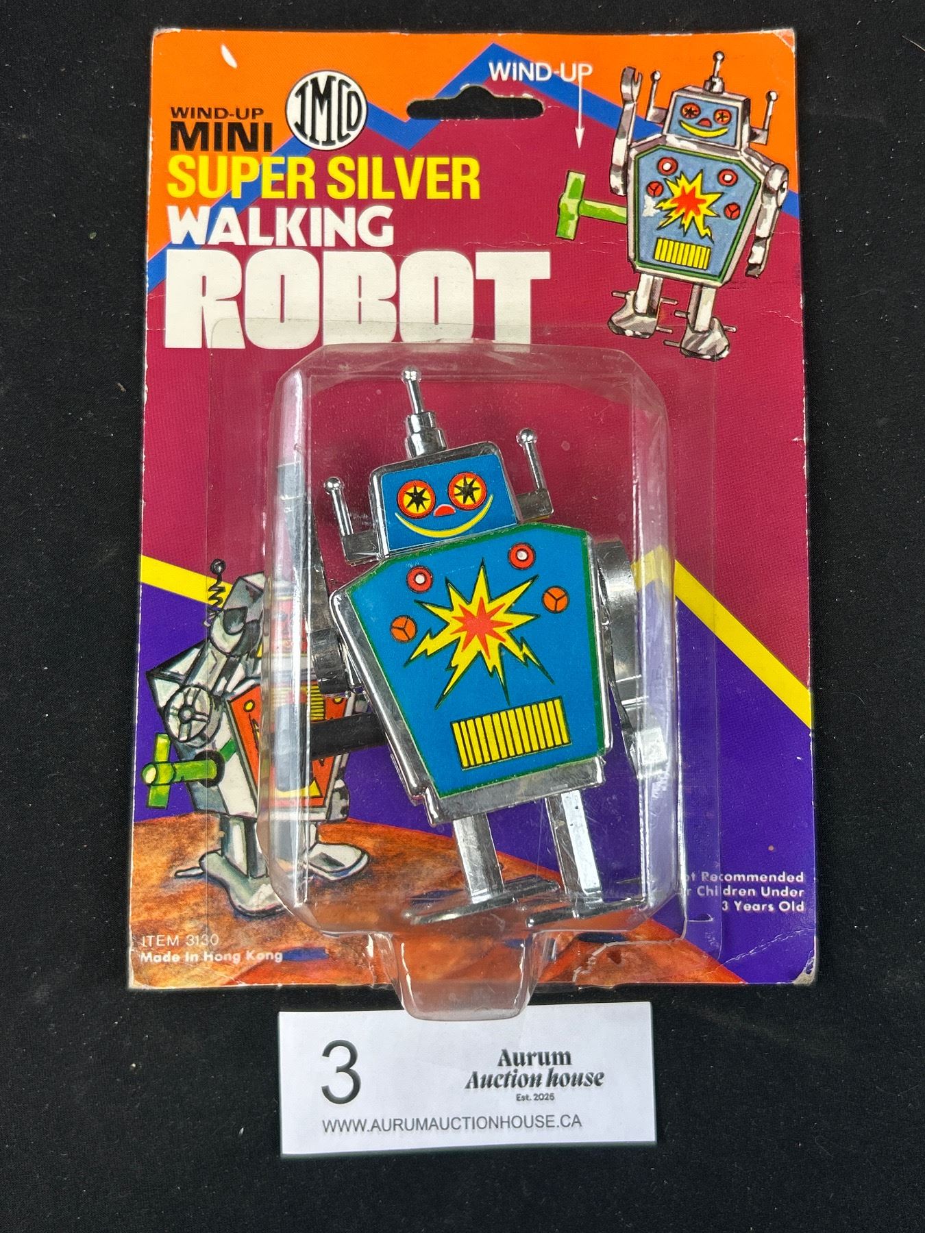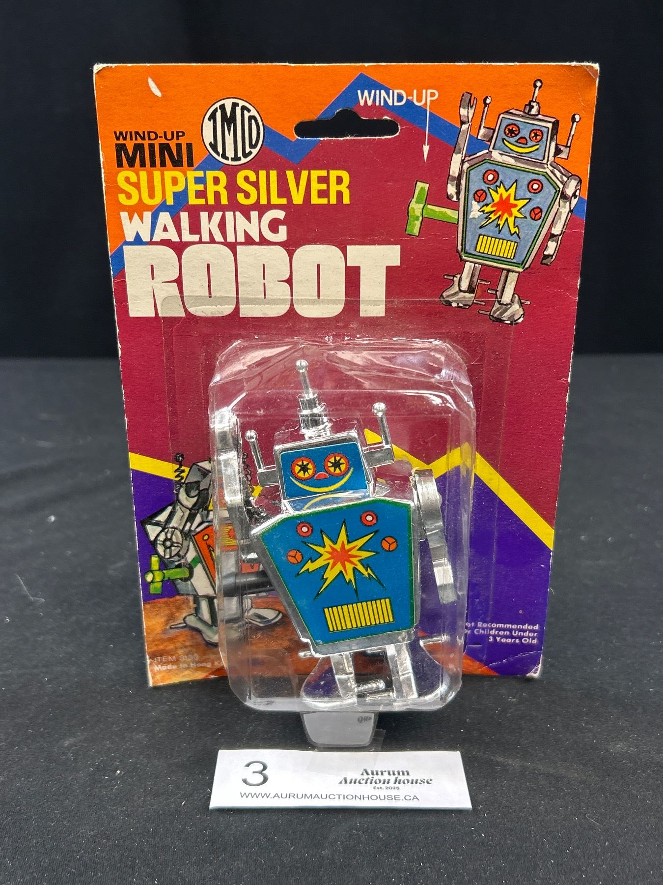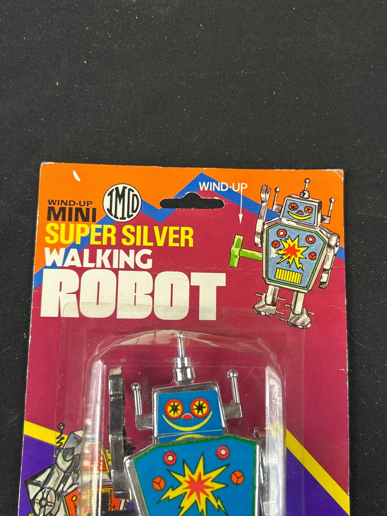 Vintage Wind Up Mini Super Silver Walking Robot Sealed in Package