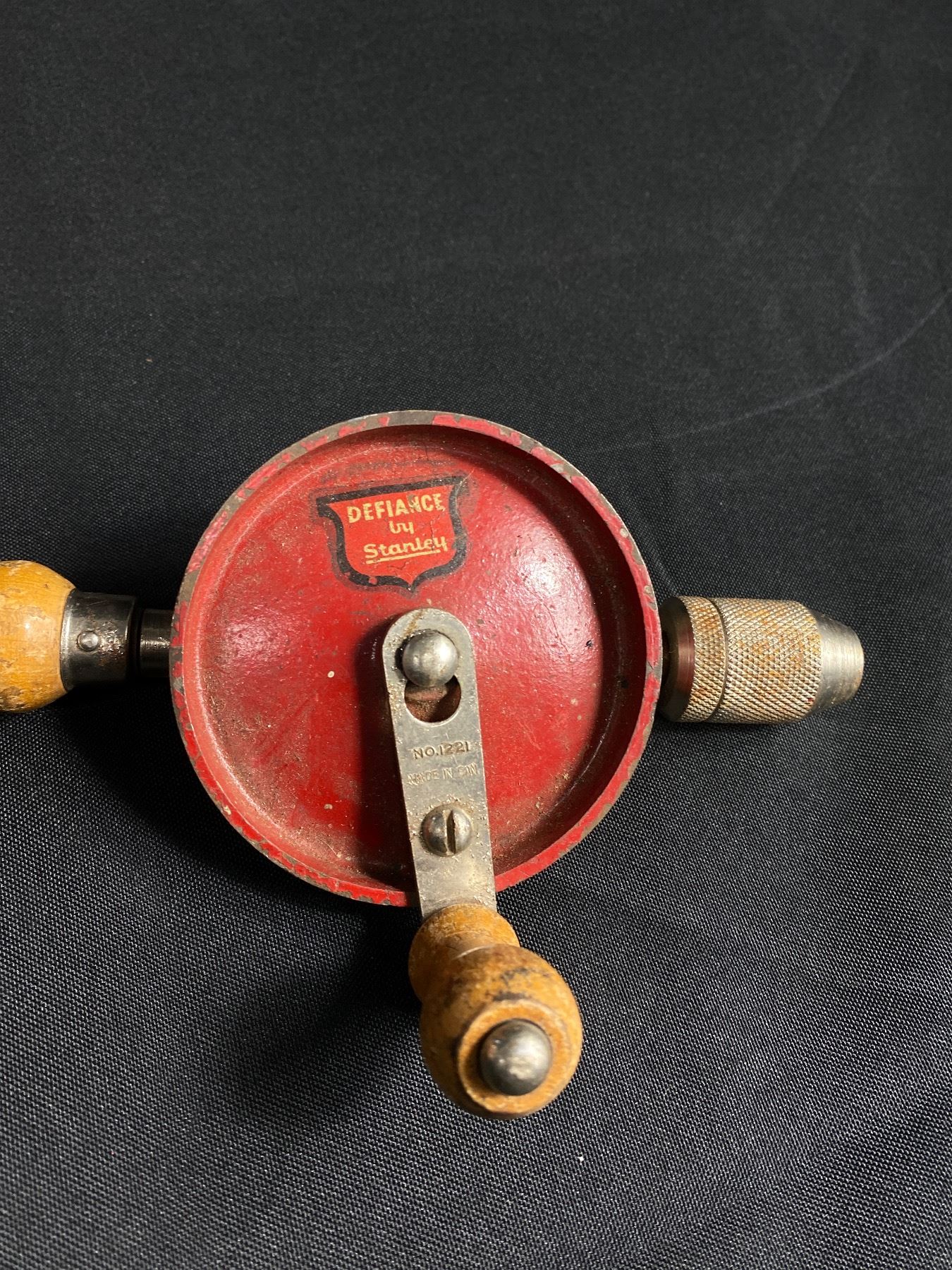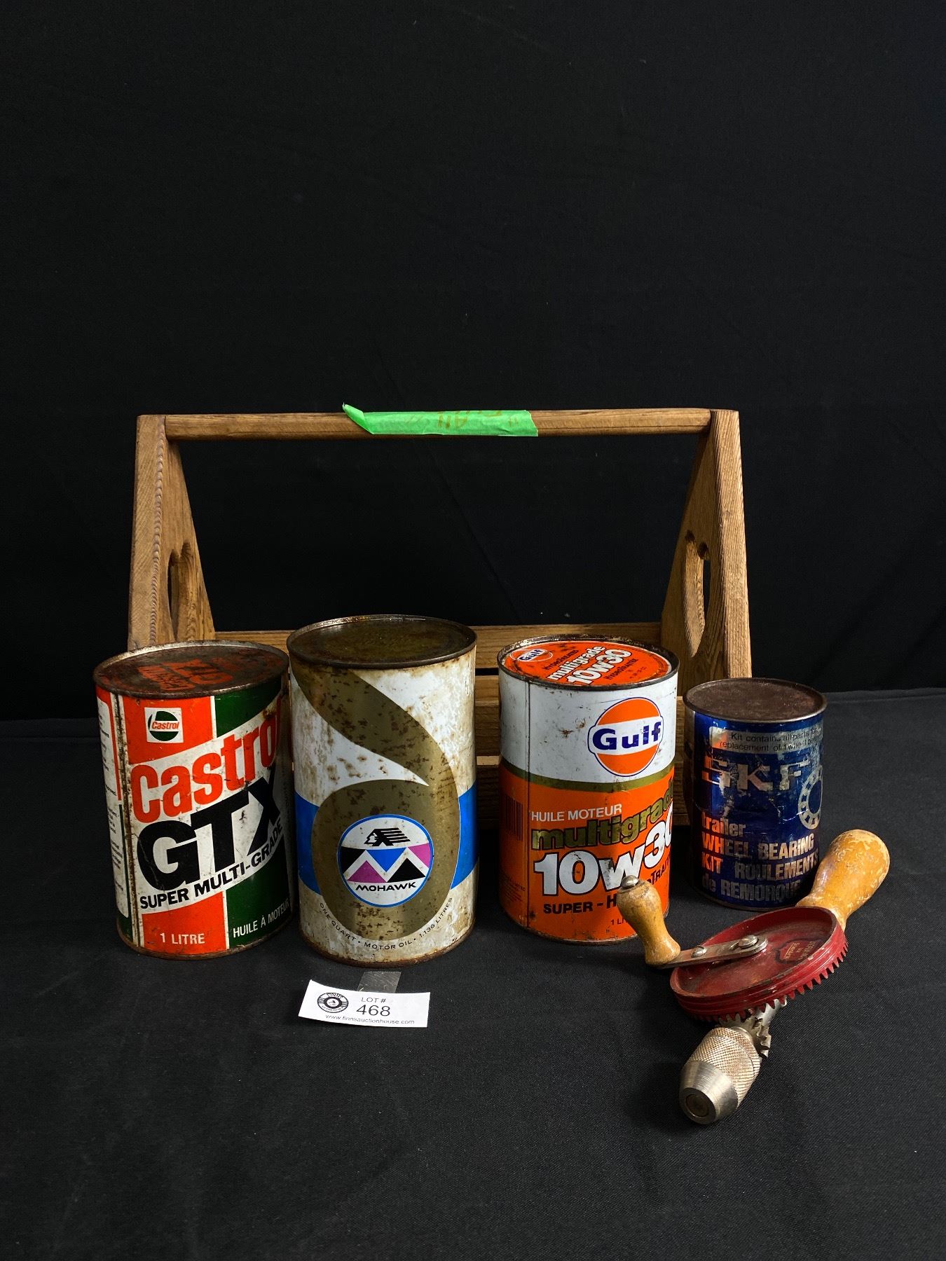 Vintage Wood Caddie, Stanley Hand Drill & Oil Tins