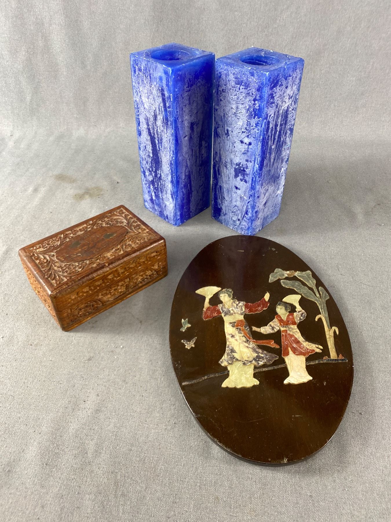 Vintage Wood Carved Jewelry Box w/ Contents (6"x4"x2"), Asian Wood Oval w/ Stone Inlay & 9" H Square Candles