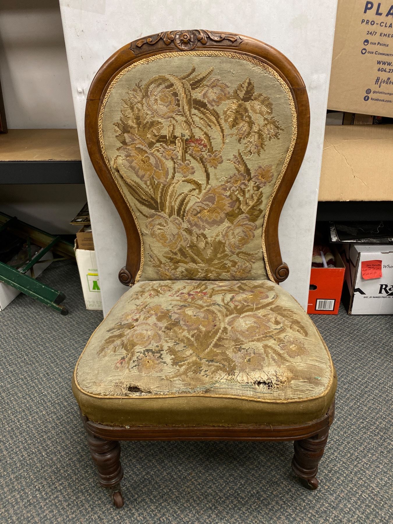 Vintage Wood Carved Upholstered Chair w/ Caster Wheels. NO SHIPPING
