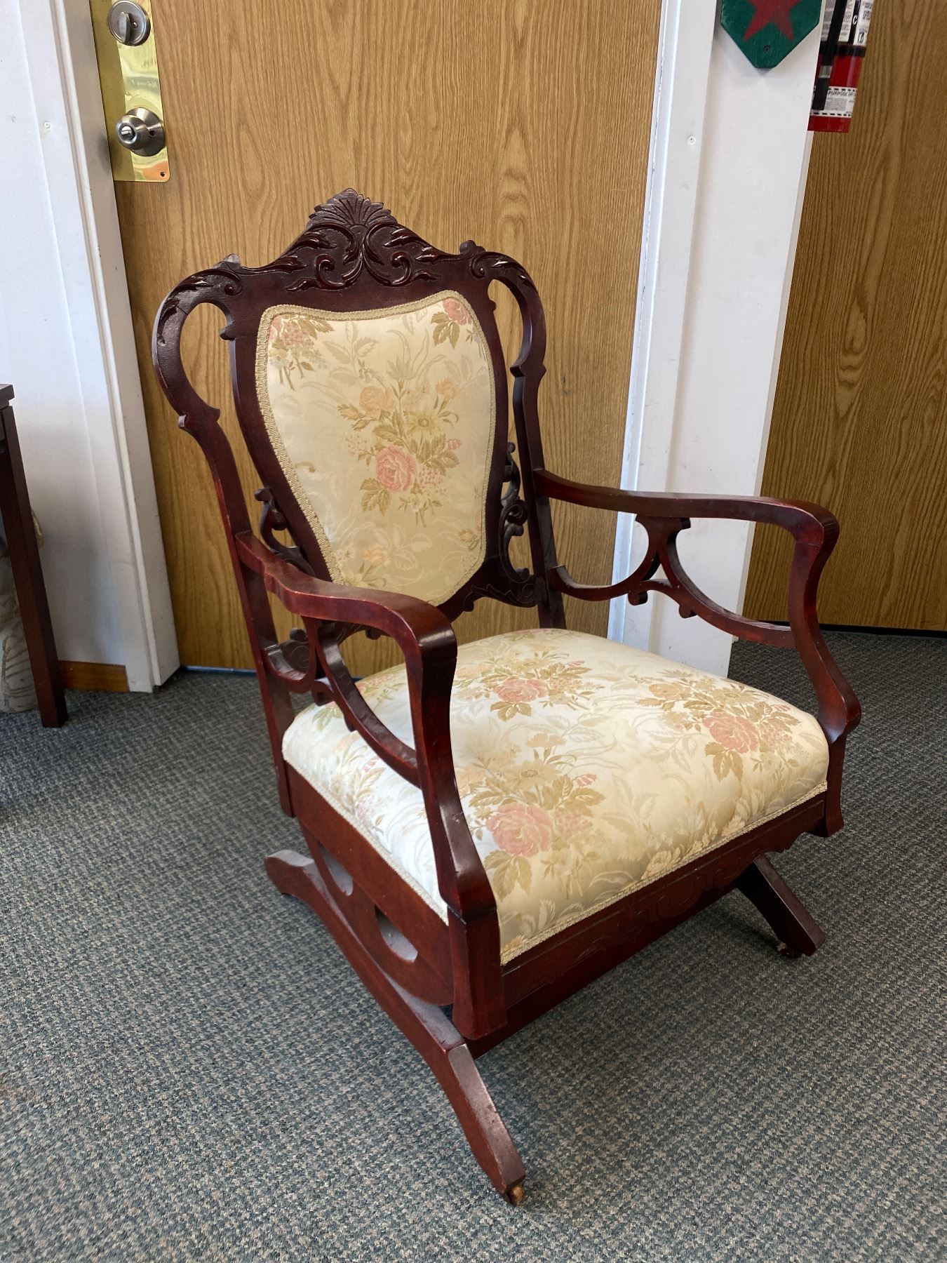 Vintage Wood Carved Upholstered Rocking Arm Chair w/ Small Caster Wheels. NO SHIPPING