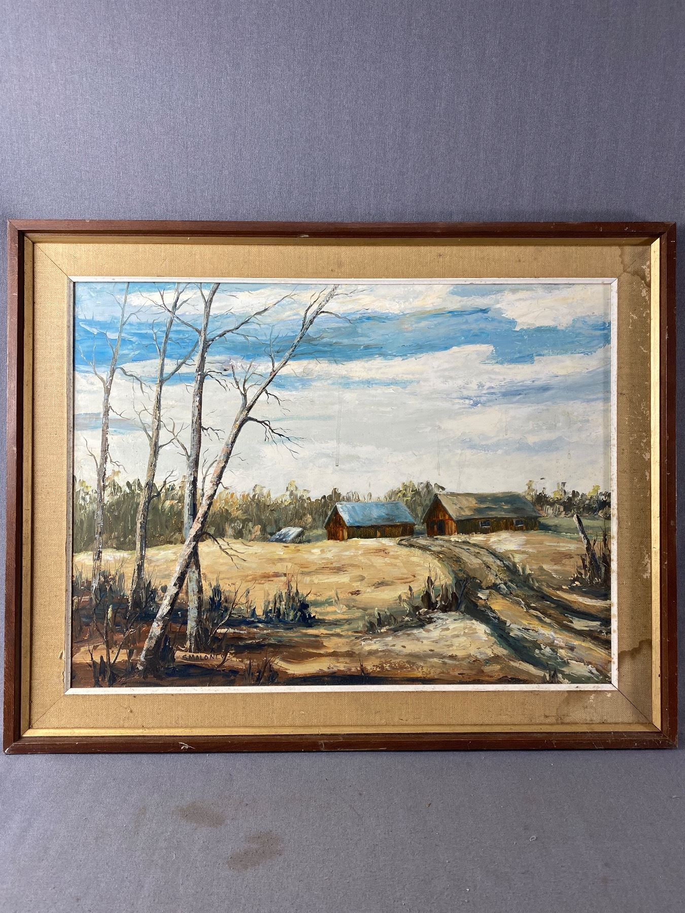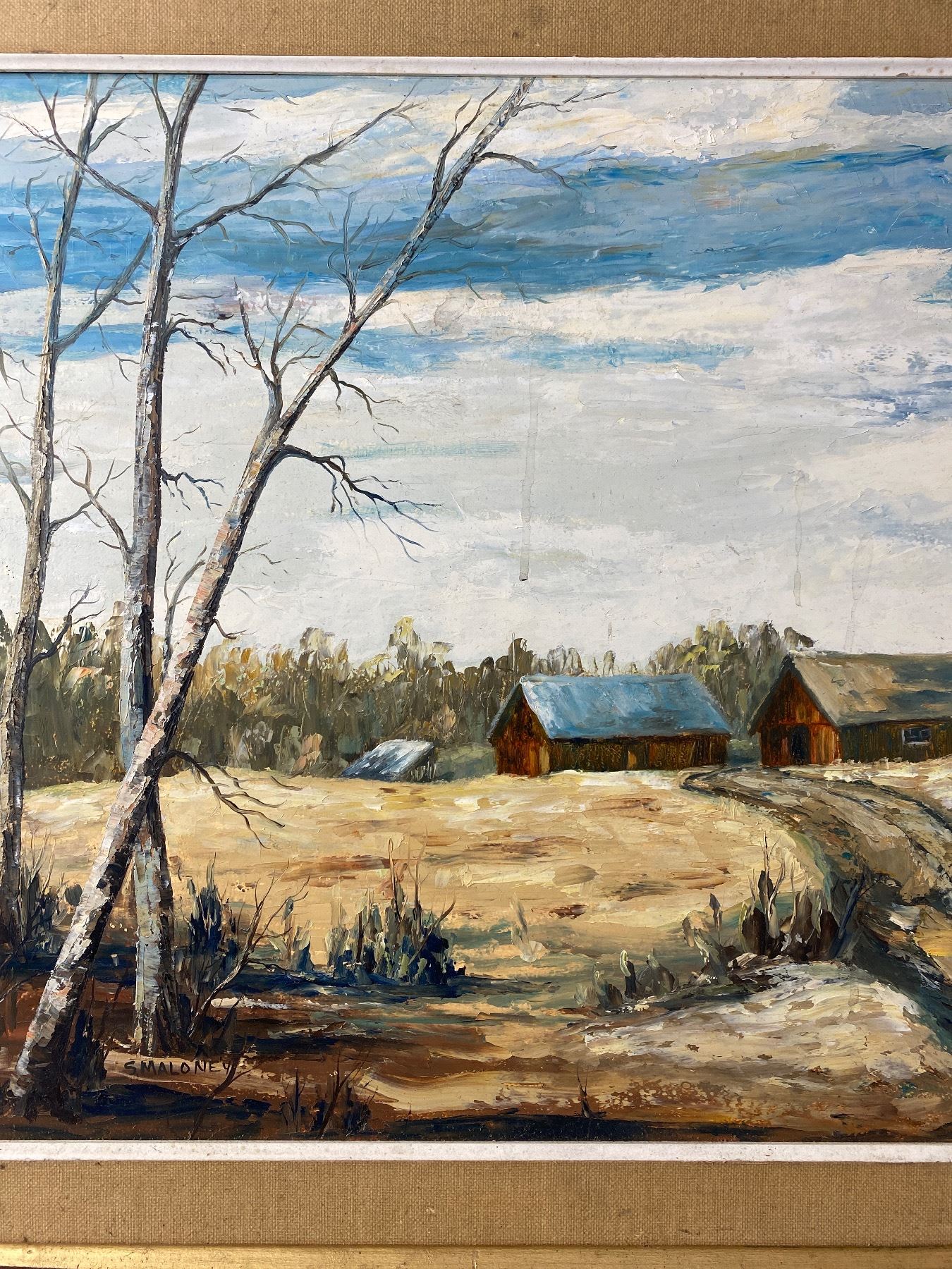 Vintage Wood Framed Farm Scape Painting Signed S.Maloney. Approx. 28.5" x 22.5"