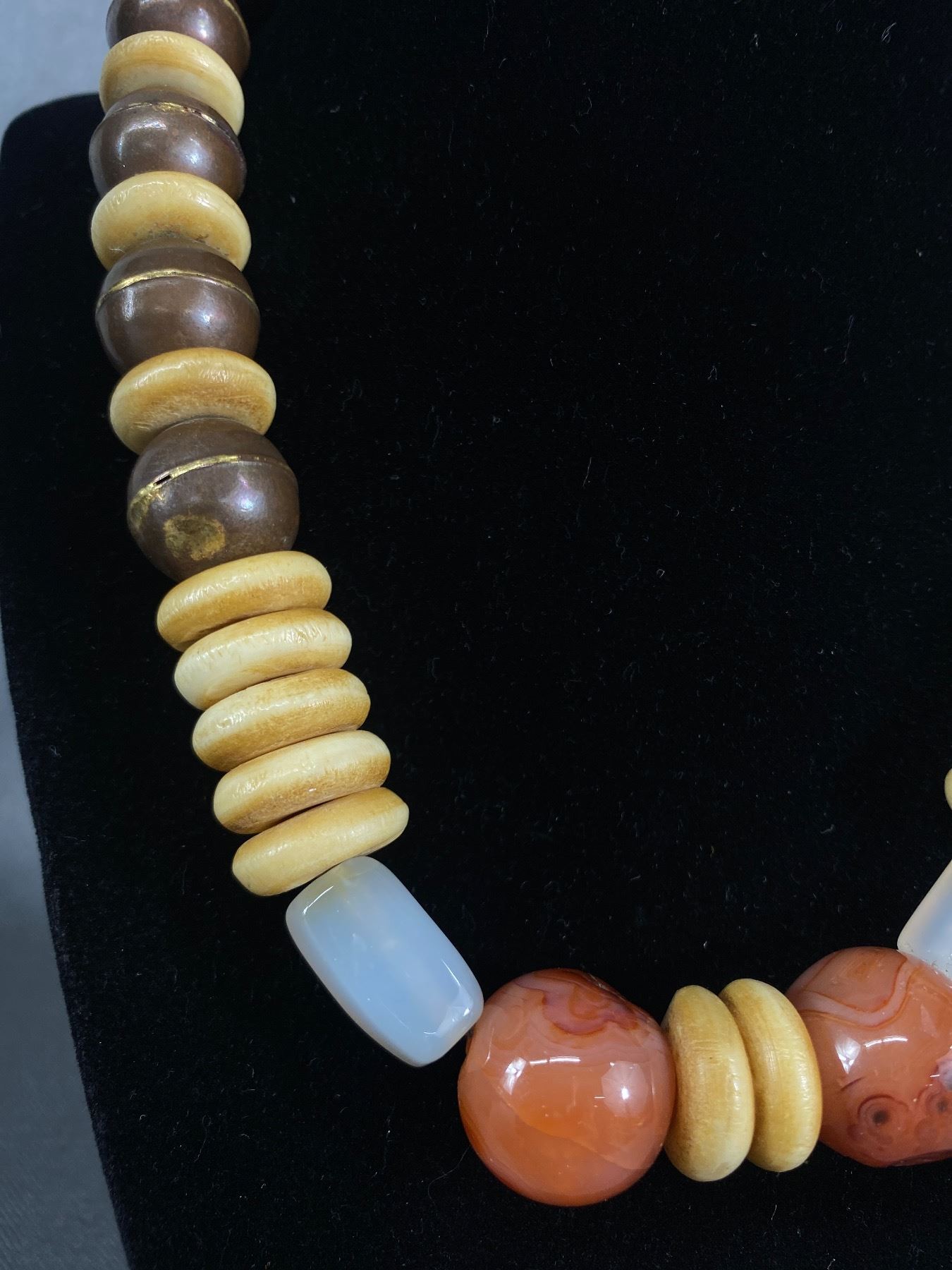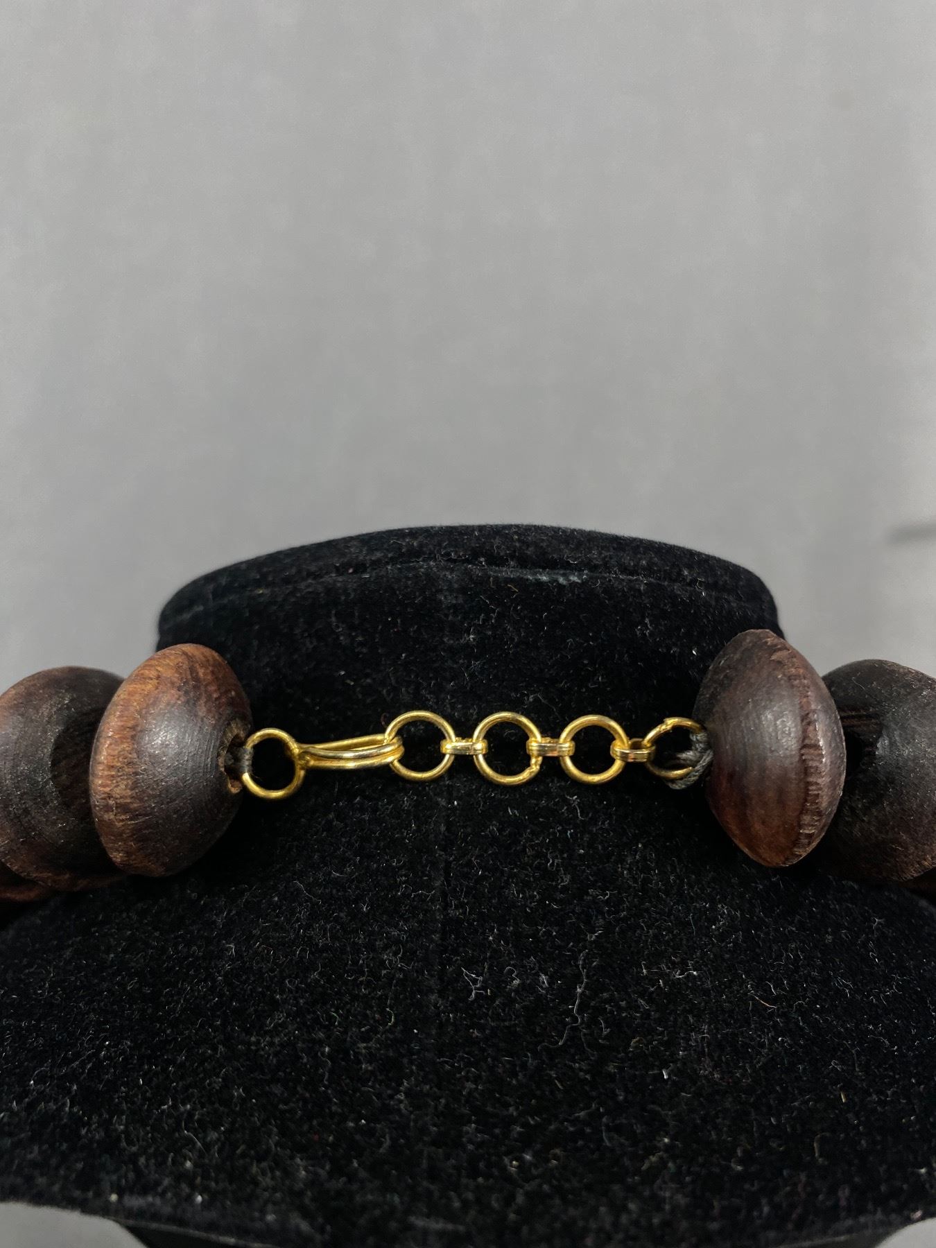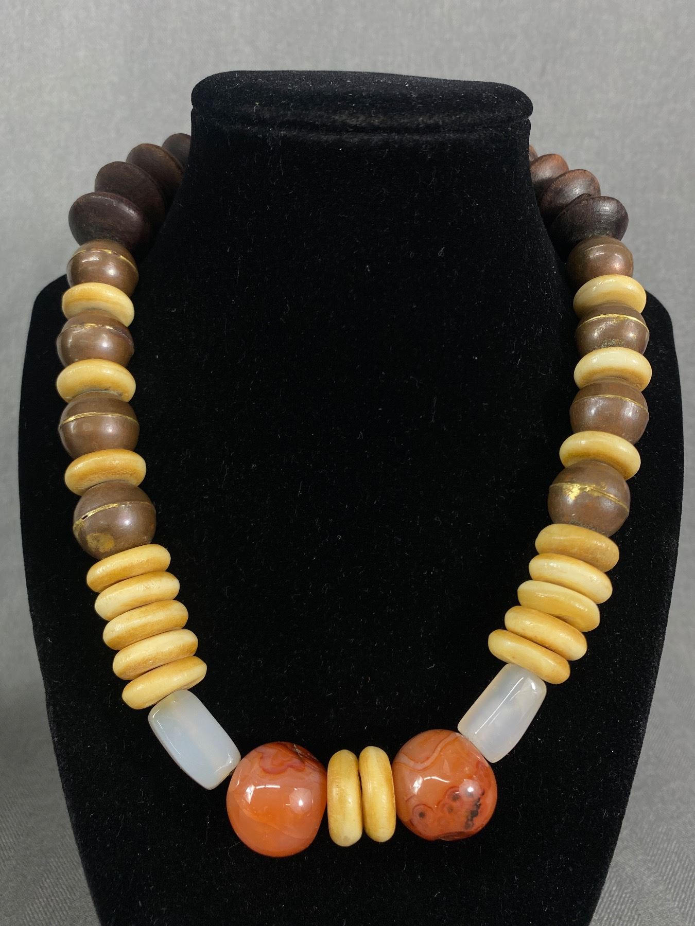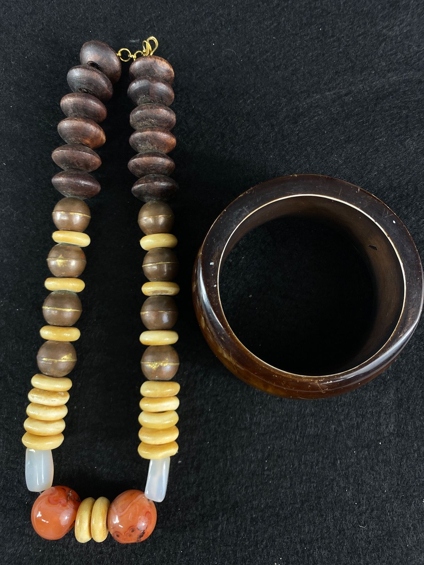 Vintage Wood,Glass and Brass Necklace with a Brown Thick Bracelet