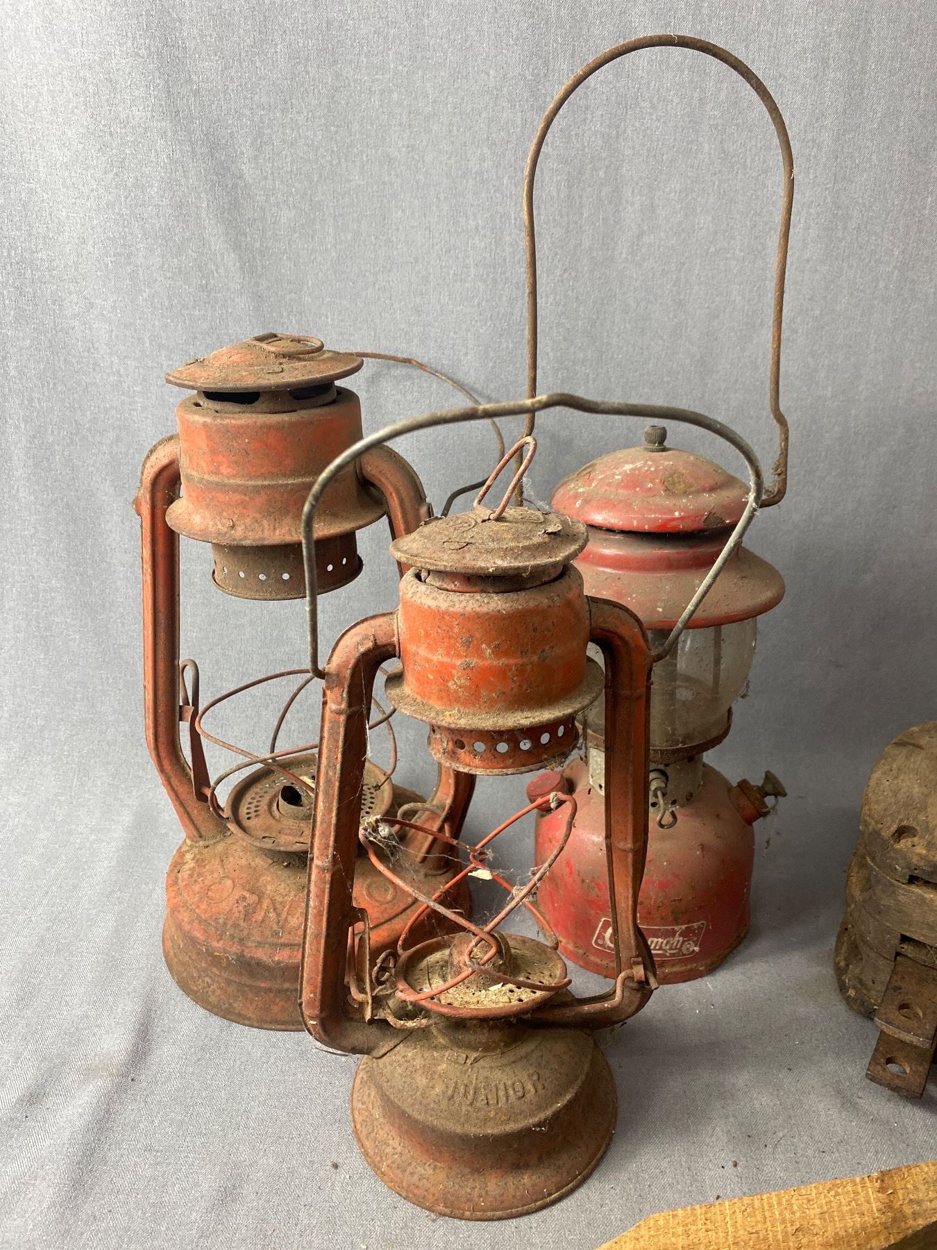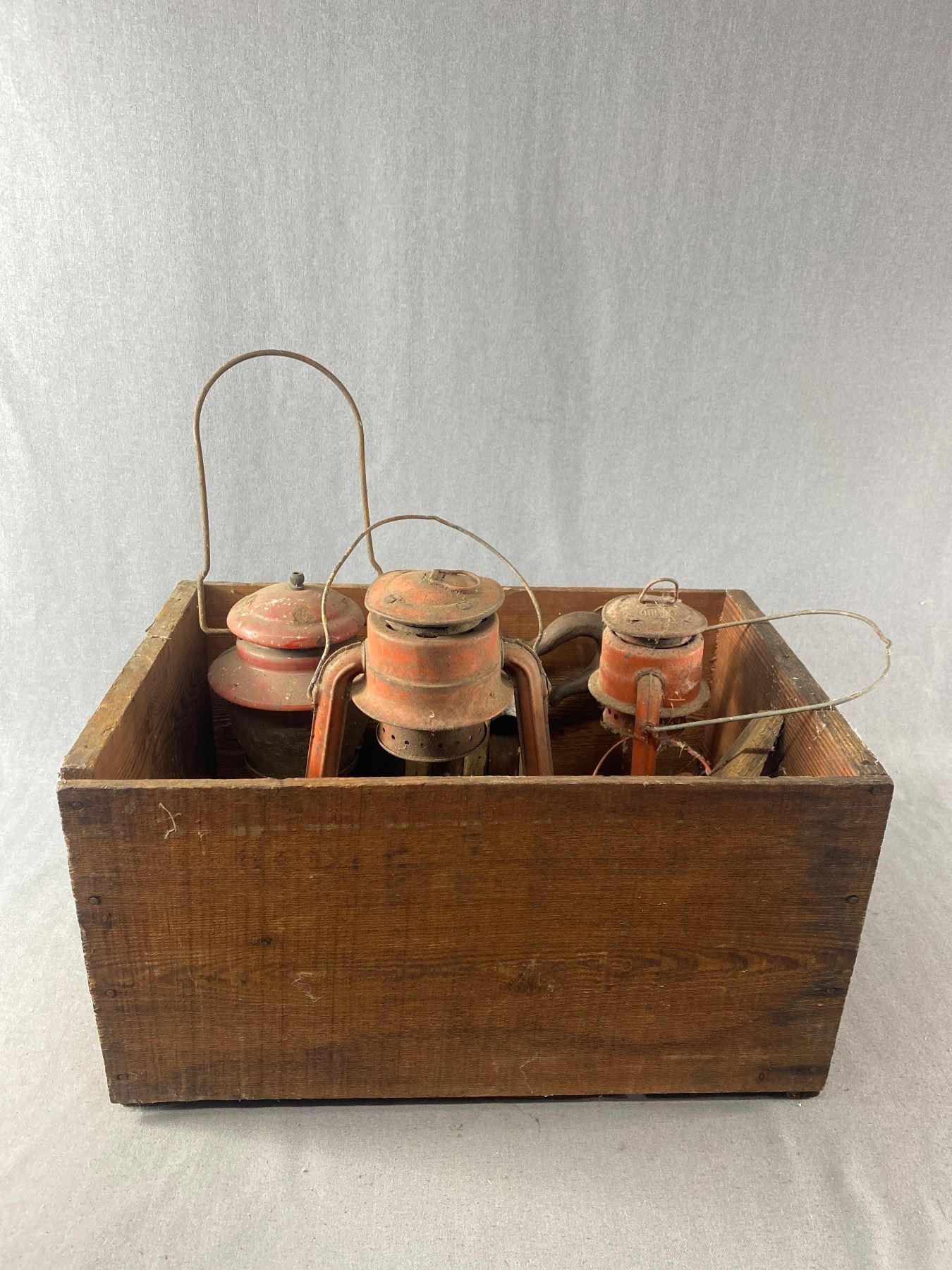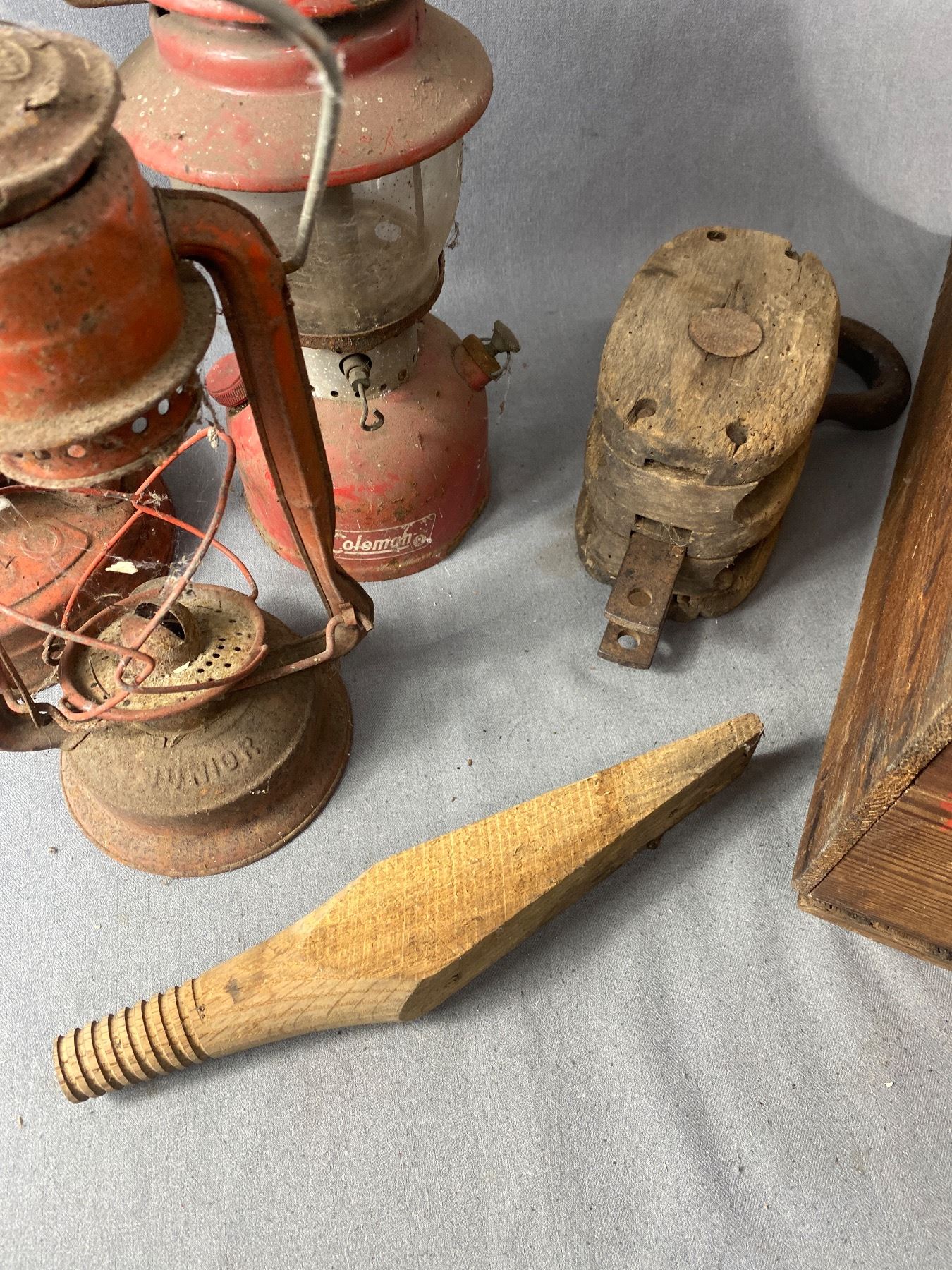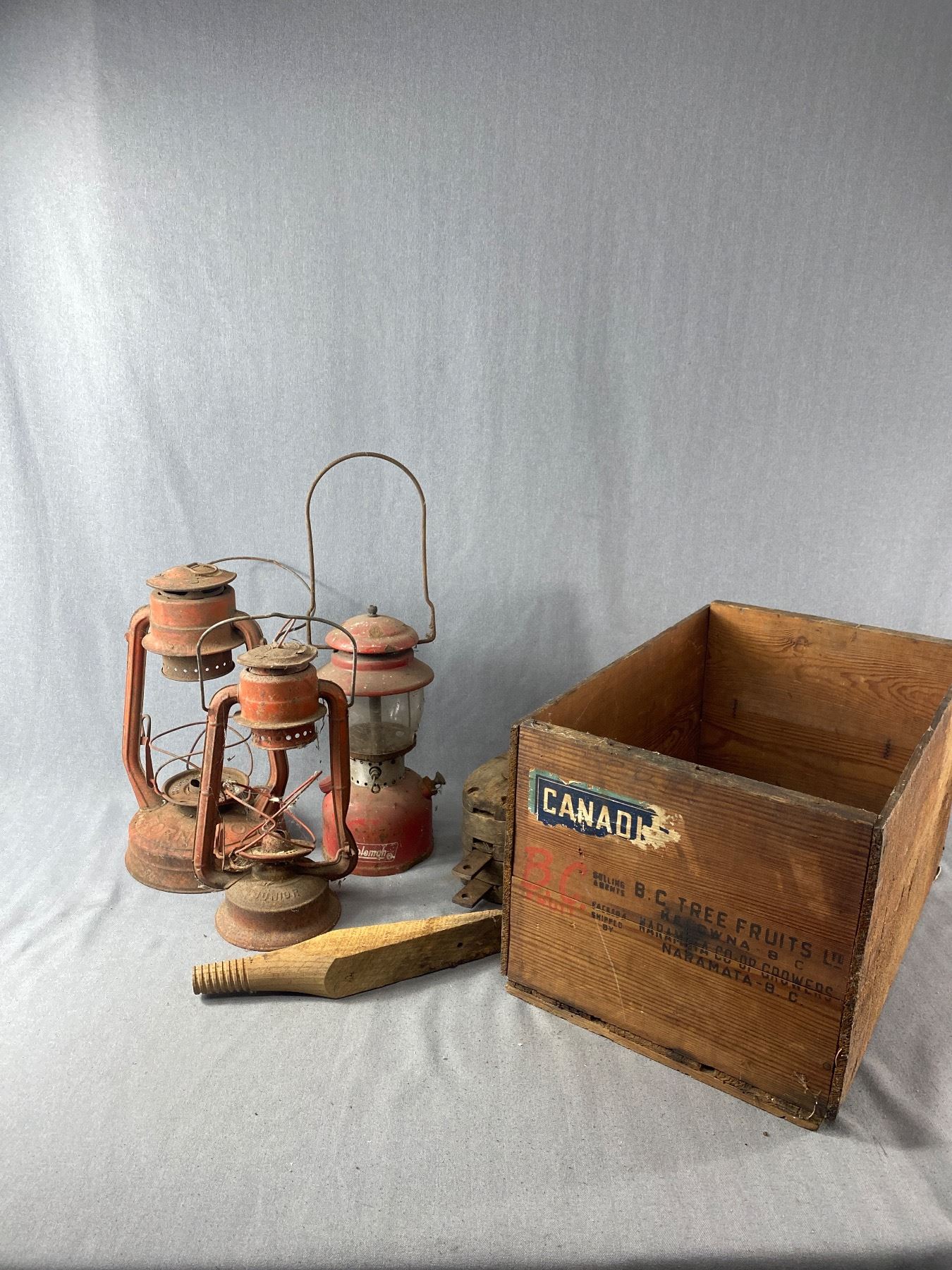 Vintage Wooden Crate w/ Wooden Pulley and Antique Lanterns As Found